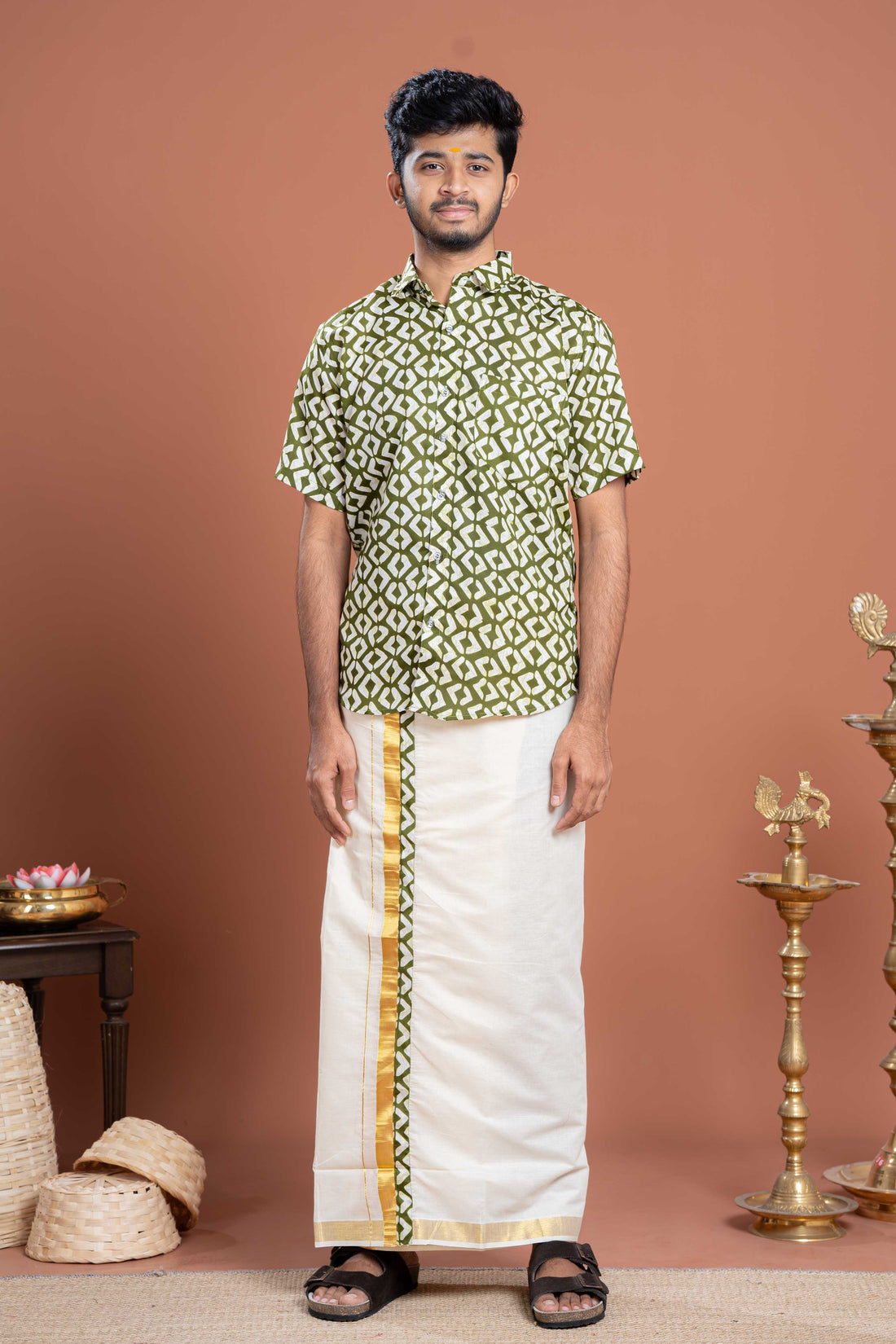 Ethnic Men's Shirt & Dhoti Set Geometric Print Shirt and Kasavu Border Dhoti - Green