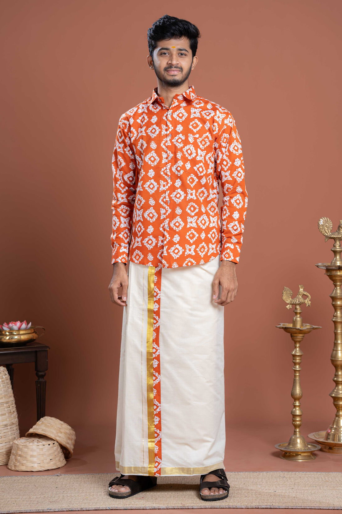 Men's Traditional Printed Shirt & Dhoti Set with Golden Border - Orange