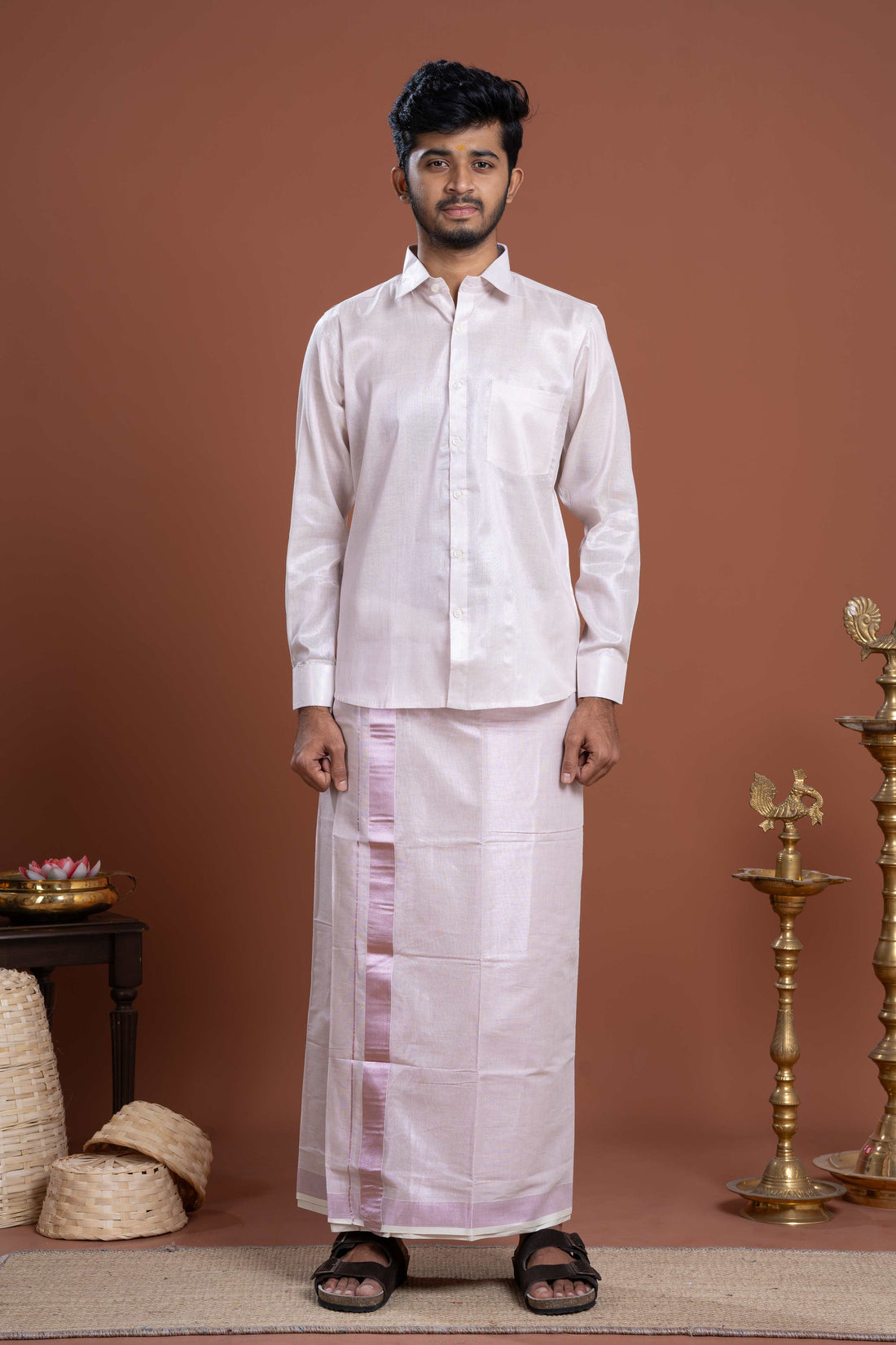 Elegant Men's Ethnic Full Sleeve Shirt & Dhoti Set with Traditional Border - Rose Gold
