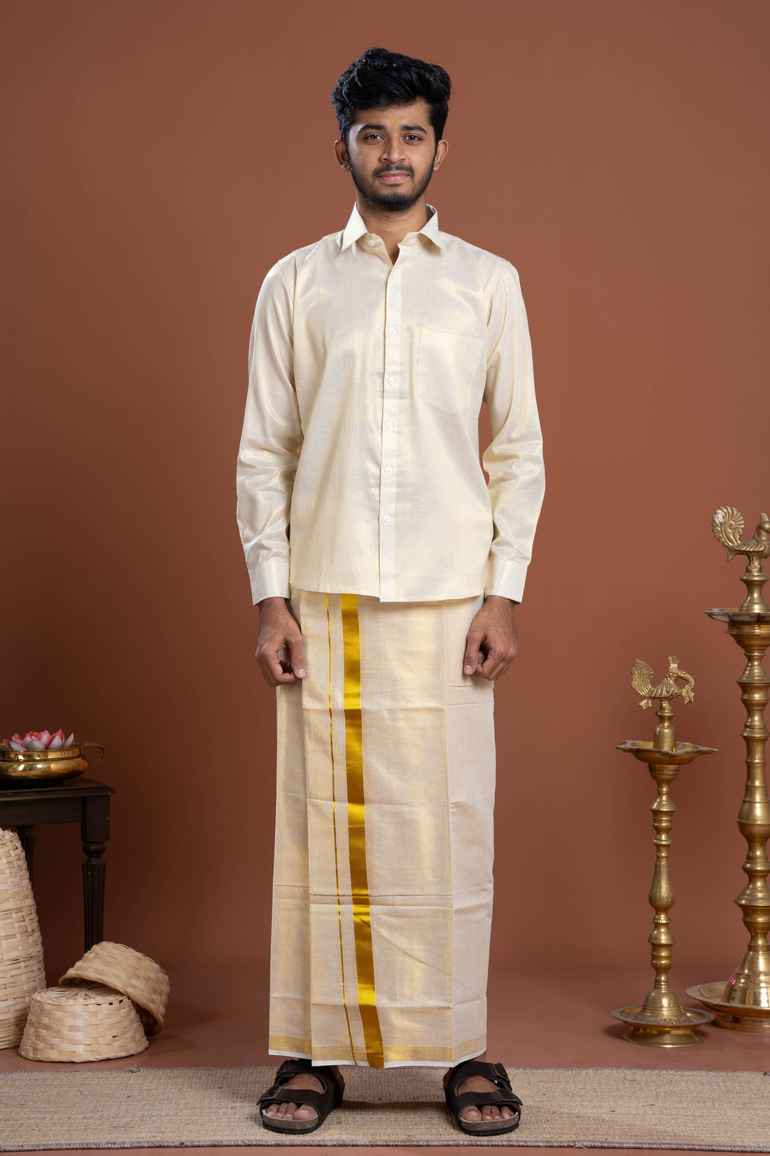 Elegant Men's Ethnic Full Sleeve Shirt & Dhoti Set with Traditional Border - Cream