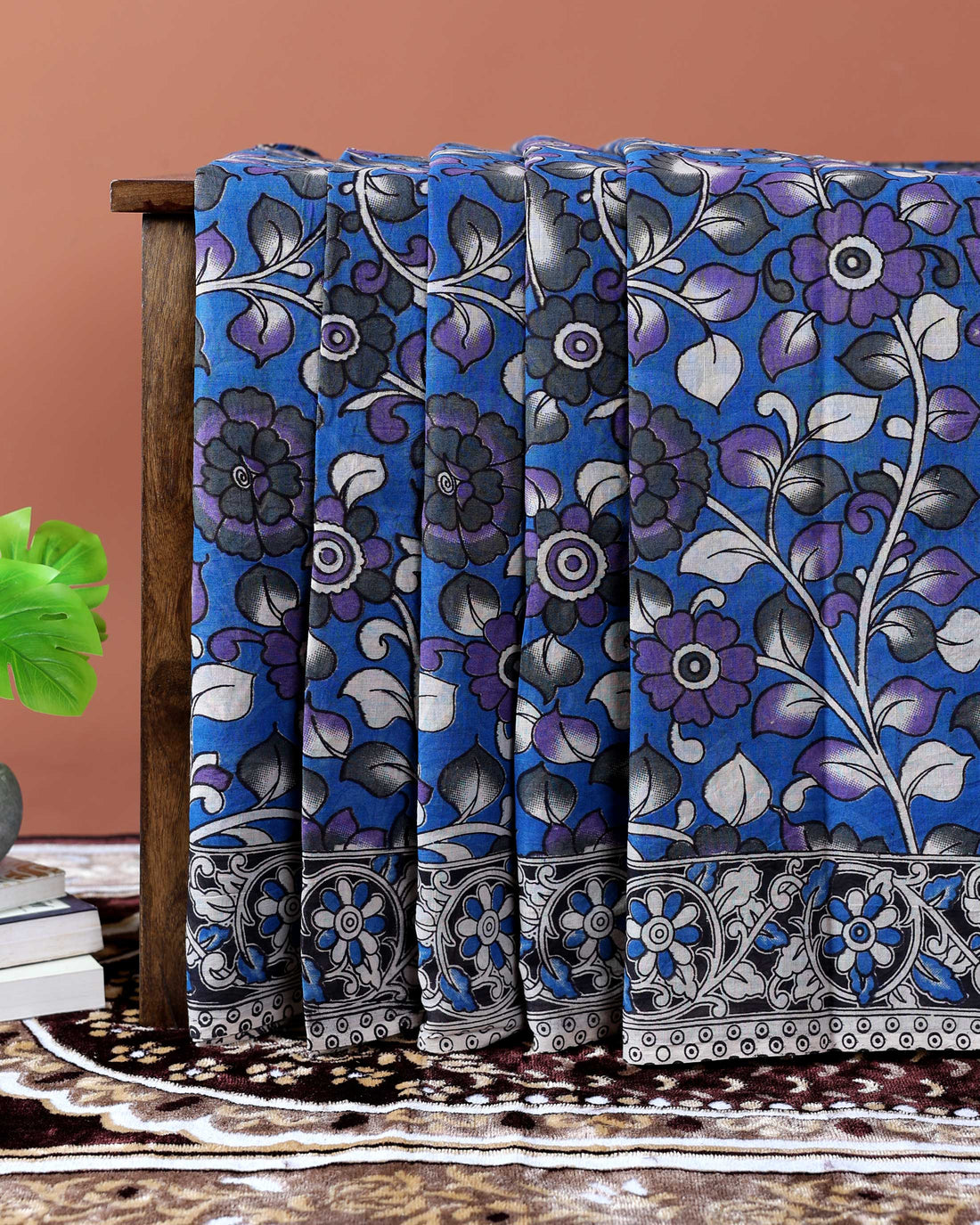 Traditional Kalamkari Cotton Saree with Traditional Floral Motifs and Intricate Border Print - Blue