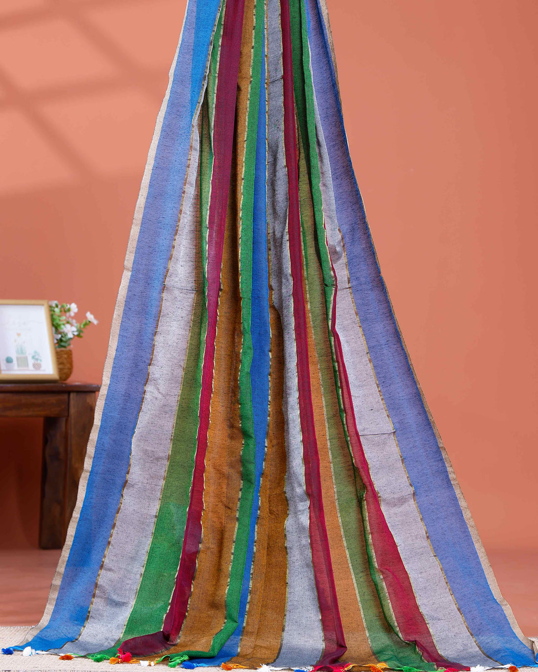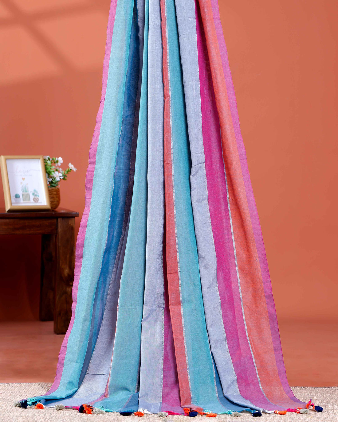 Handwoven Mul Mul Cotton Saree with Bold Striped Pattern and Tassel Detailing – Multi