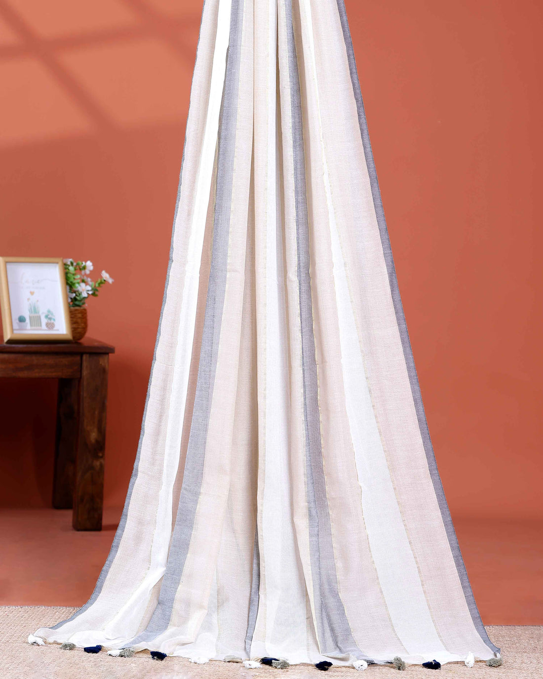Handwoven Mul Mul Cotton Saree with Subtle Striped Pattern and Contrast Tassel Detailing – White