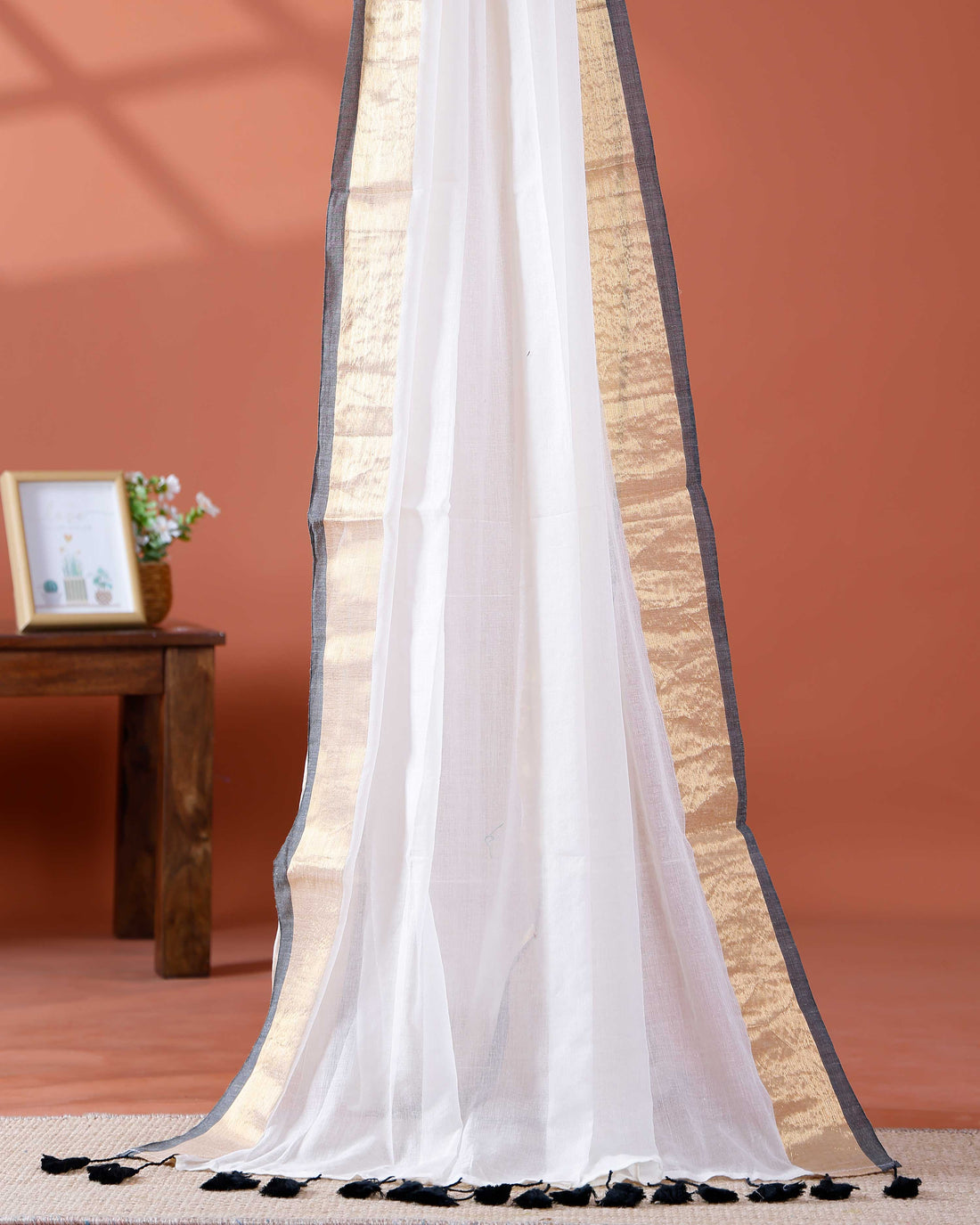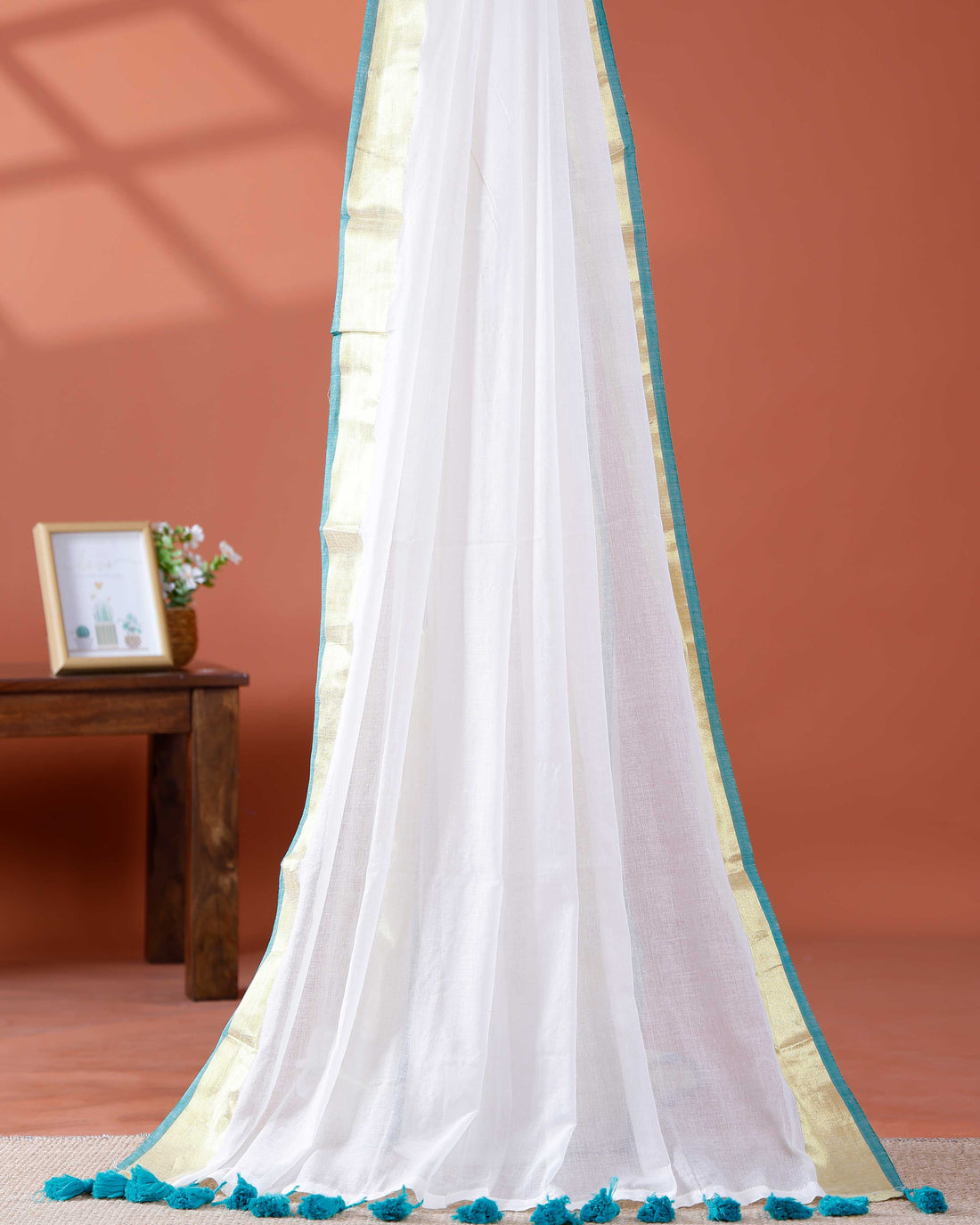 Handwoven Mul Mul Cotton Saree with Tassel Detailing and Contrasting Border - White