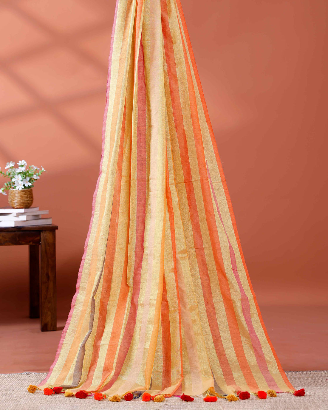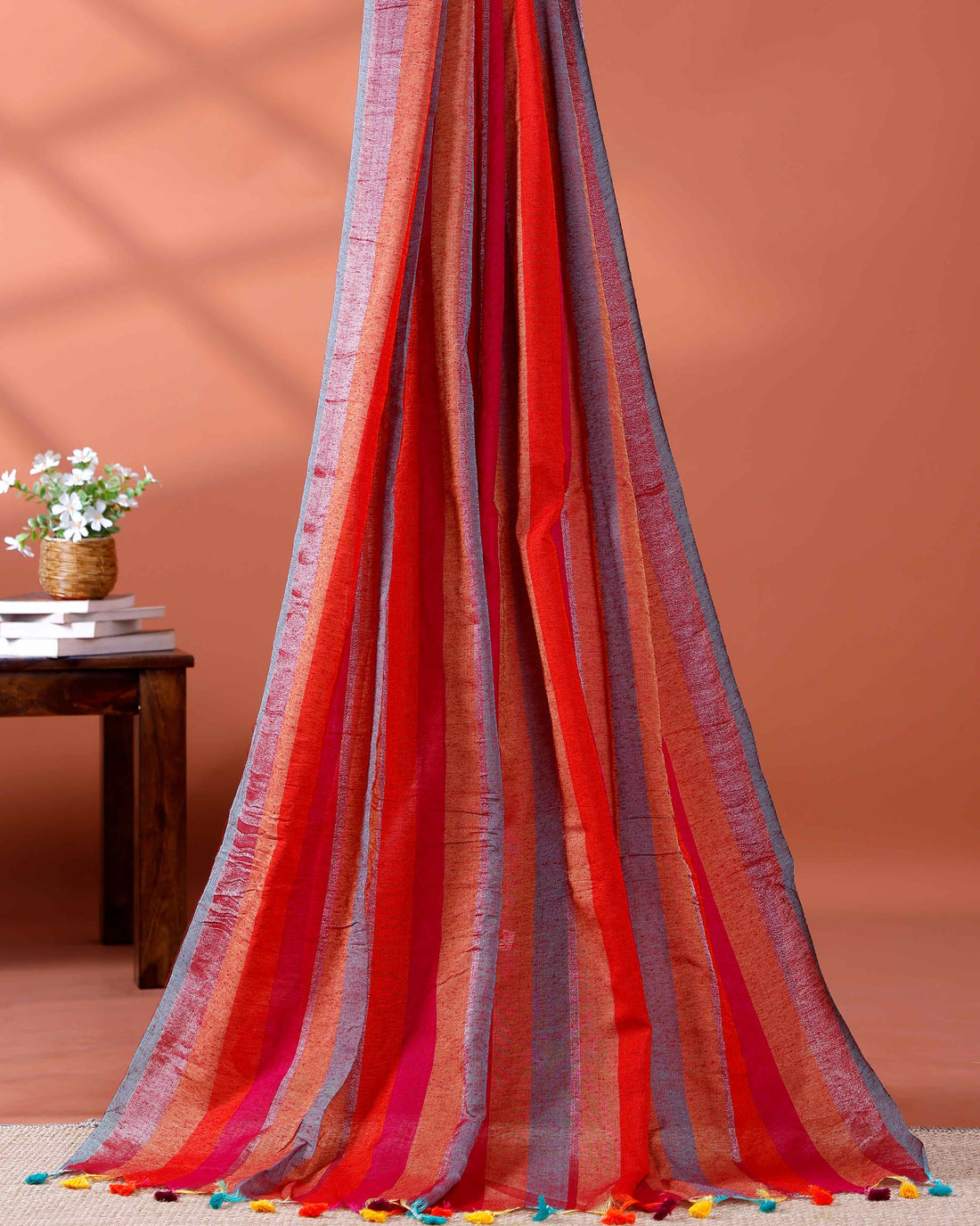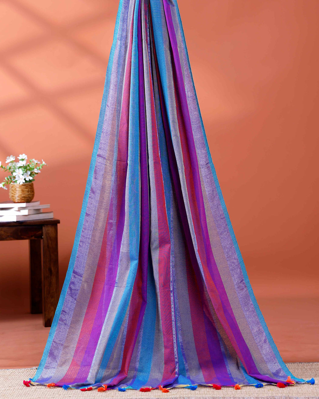 Handloom Mul Mul Cotton Saree with Vertical Stripe Pattern and Decorative Tassels - Multi
