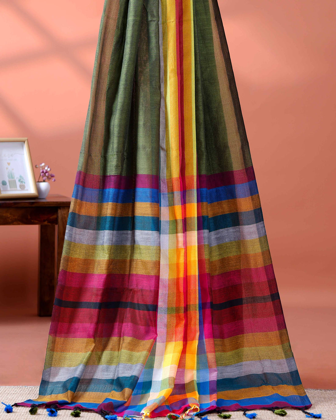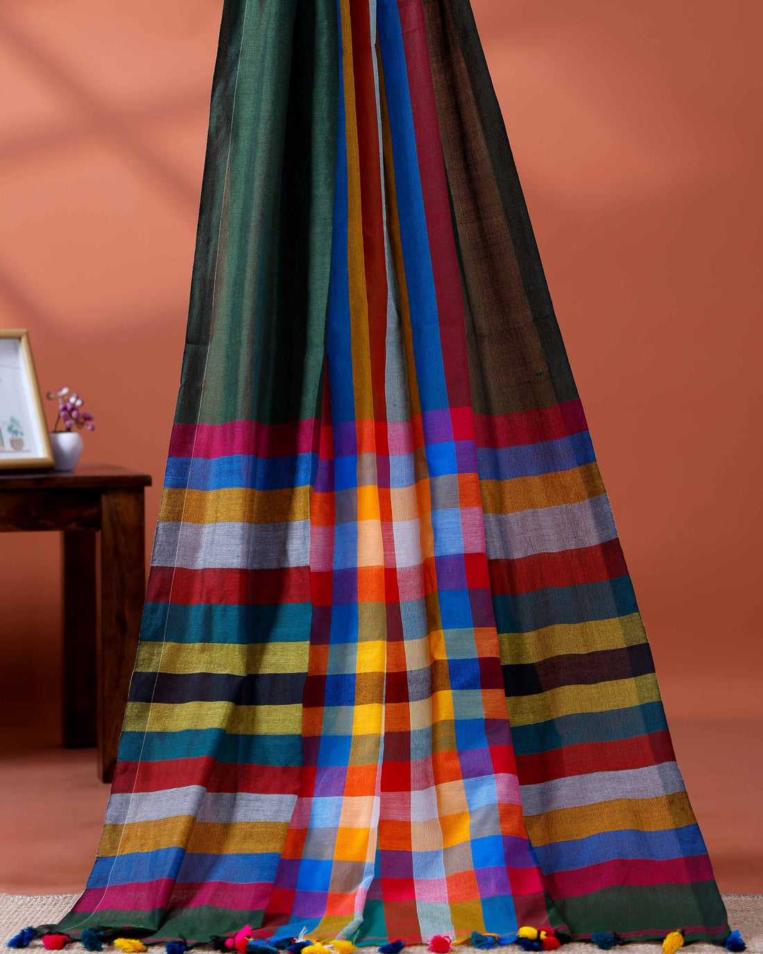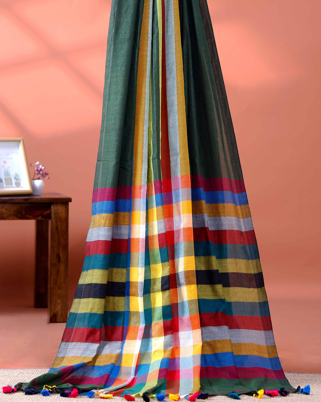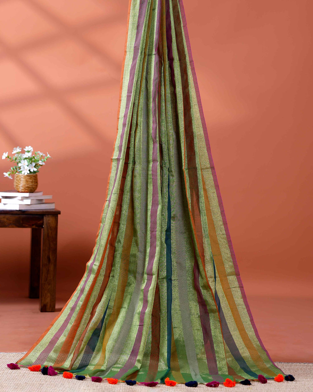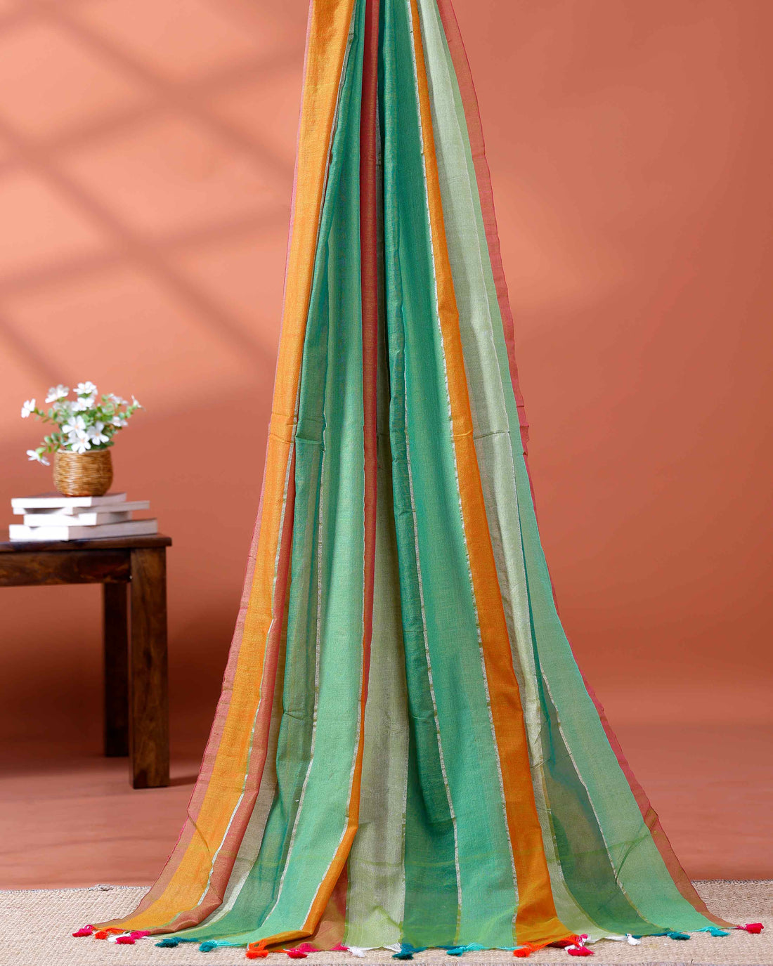 Handloom Mul Mul Cotton Saree with Vertical Stripe Pattern and Decorative Tassels - Green