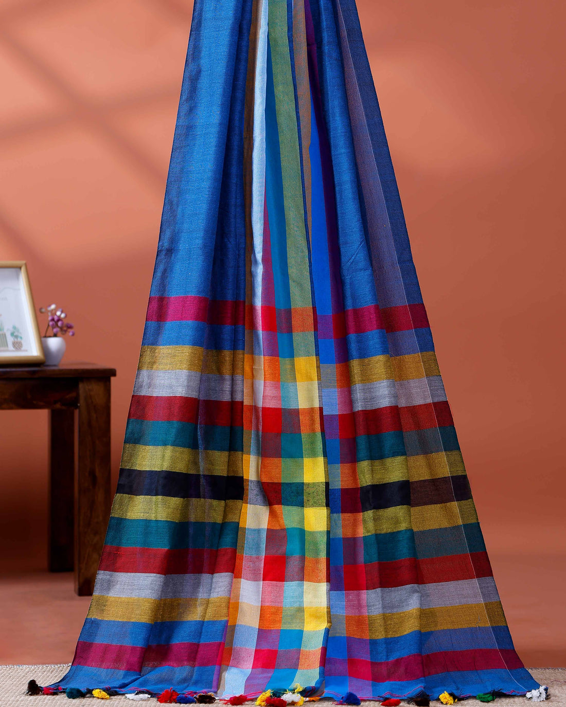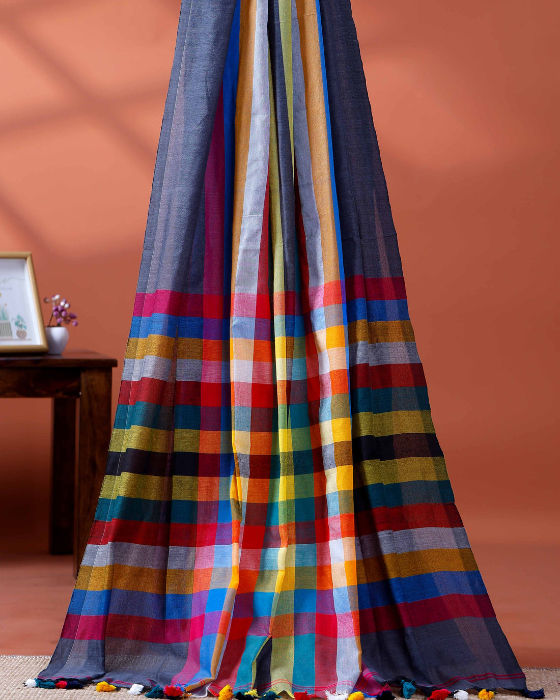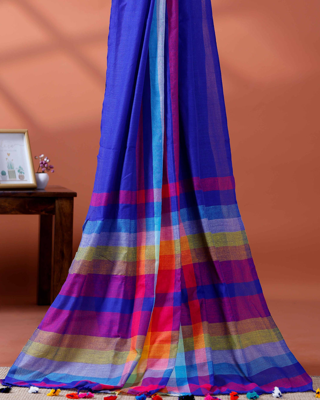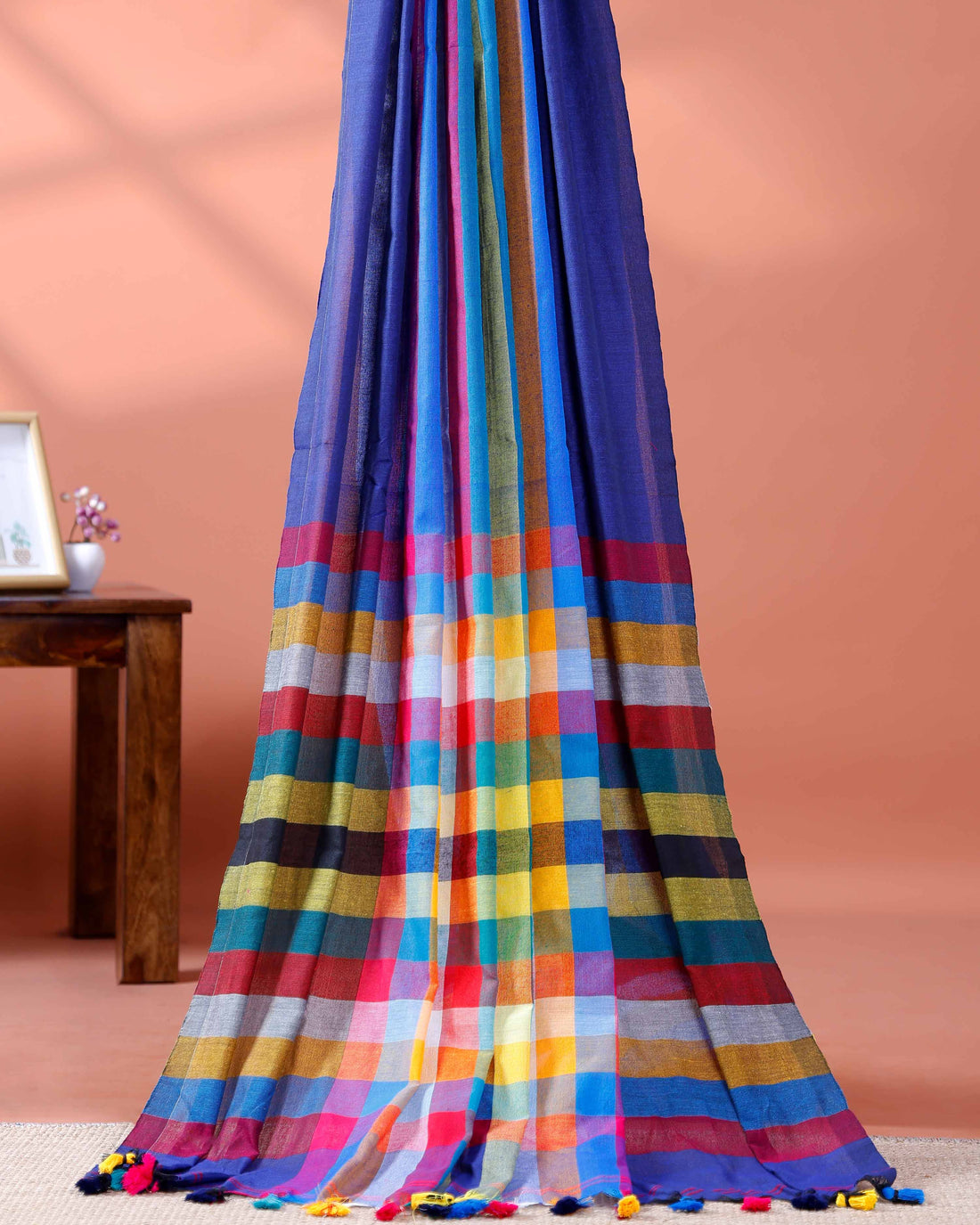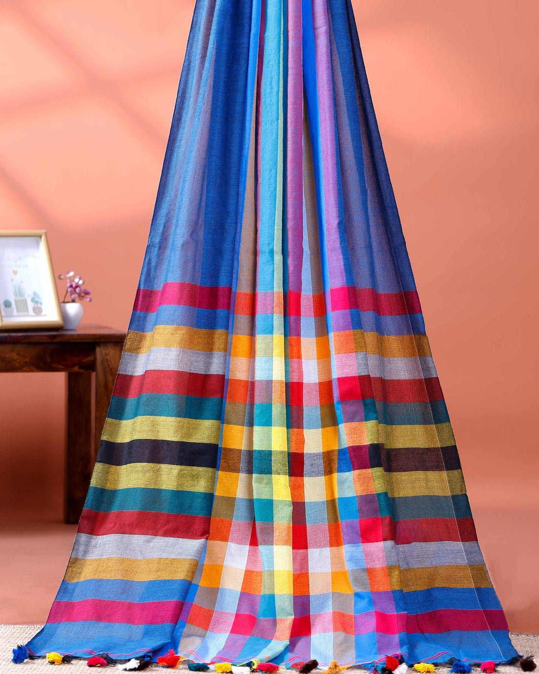 Elegant Rainbow Cotton Saree with Striped Pattern and Tassel Border - Dark Blue