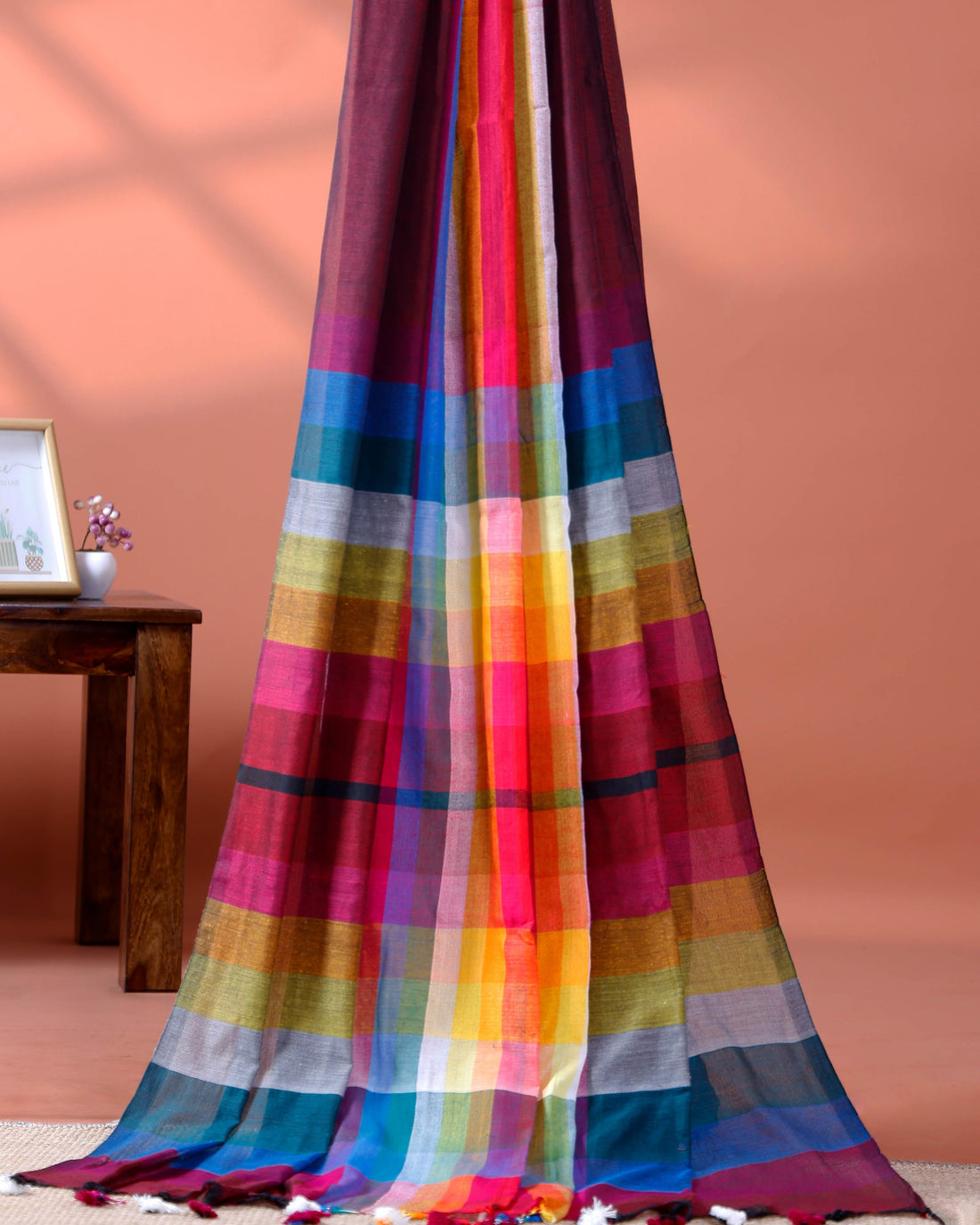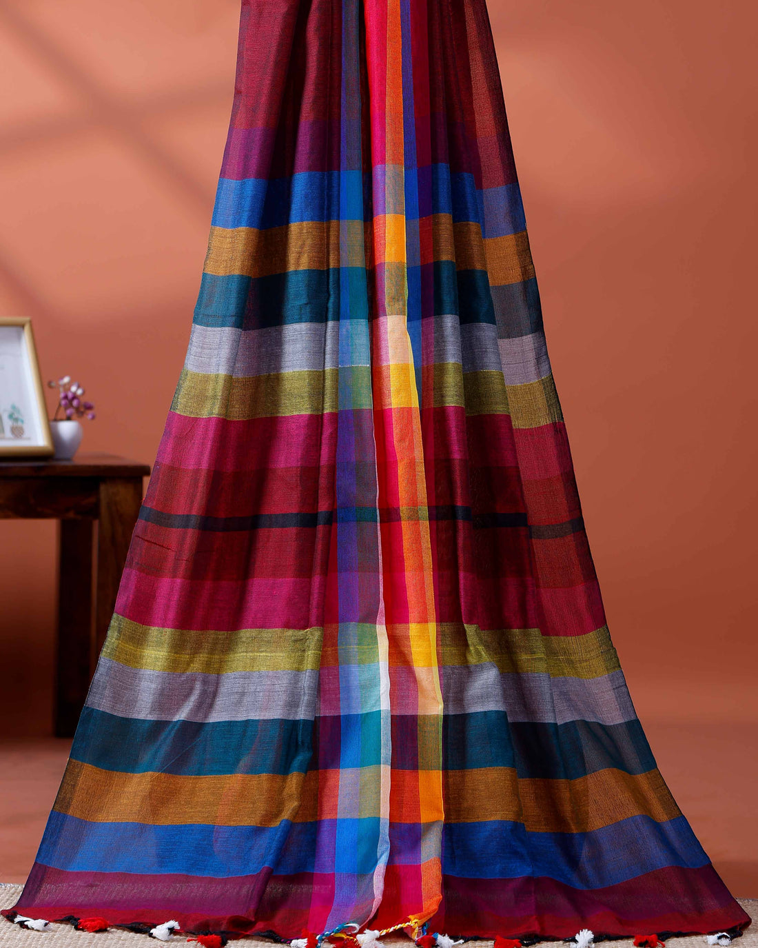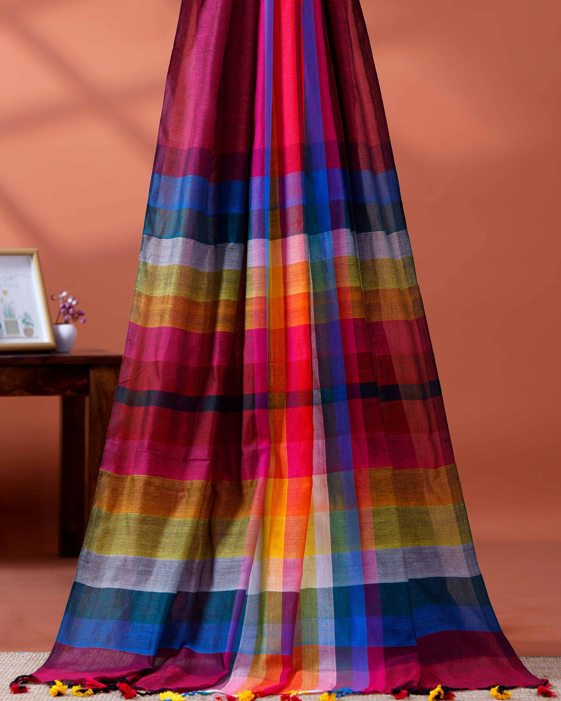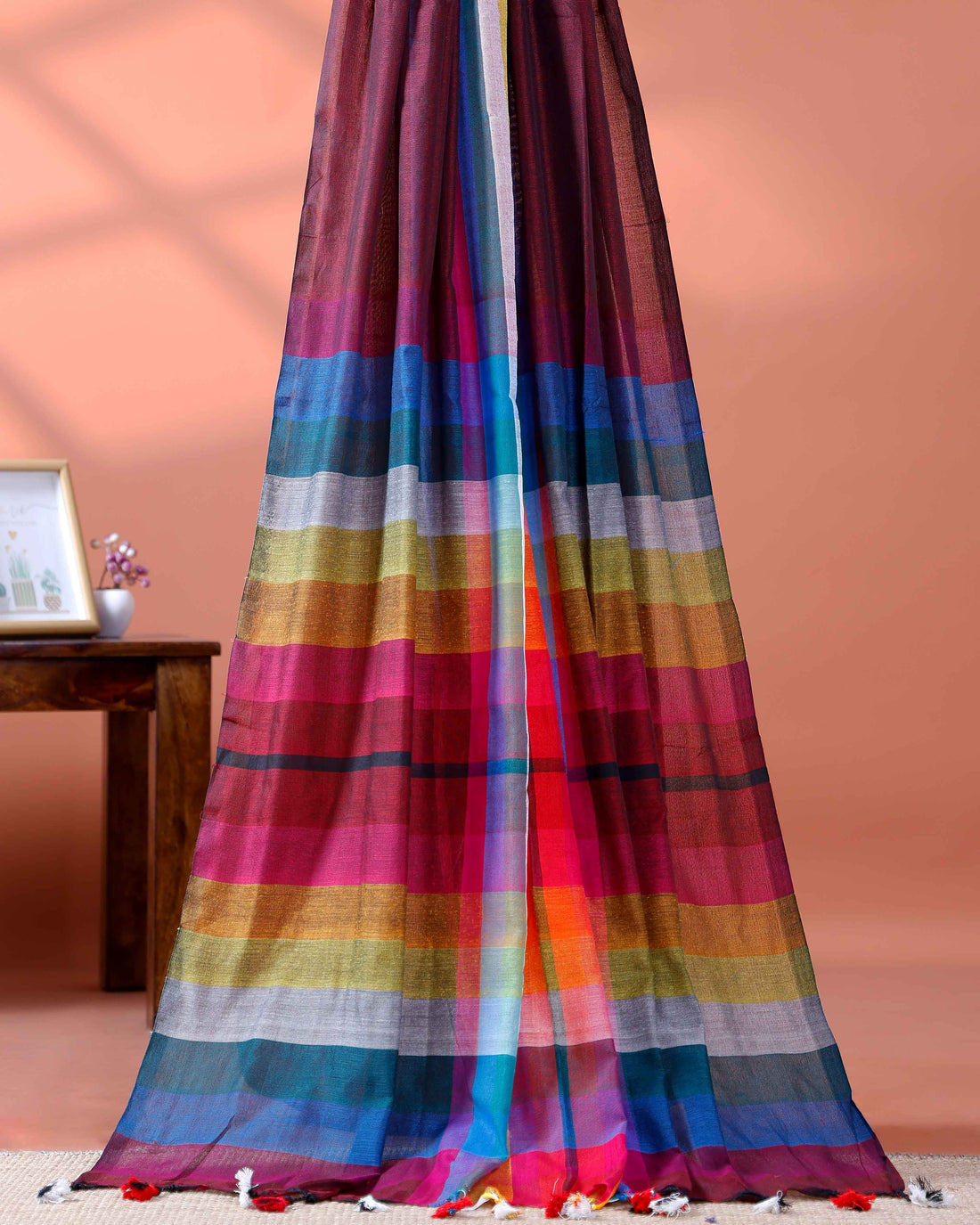 Elegant Rainbow Cotton Saree with Striped Pattern and Tassel Border - Maroon
