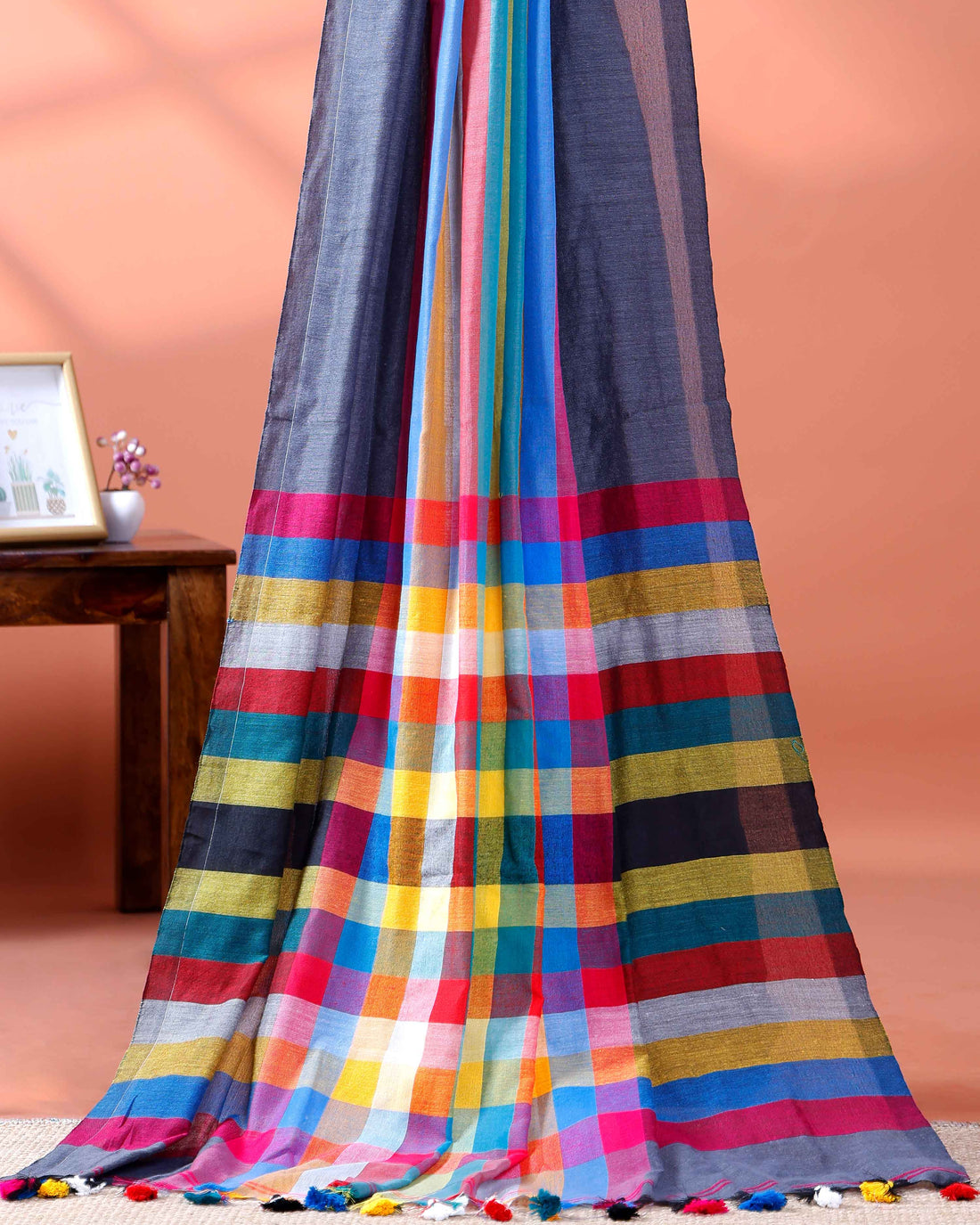 Elegant Rainbow Cotton Saree with Striped Pattern and Tassel Border - Black