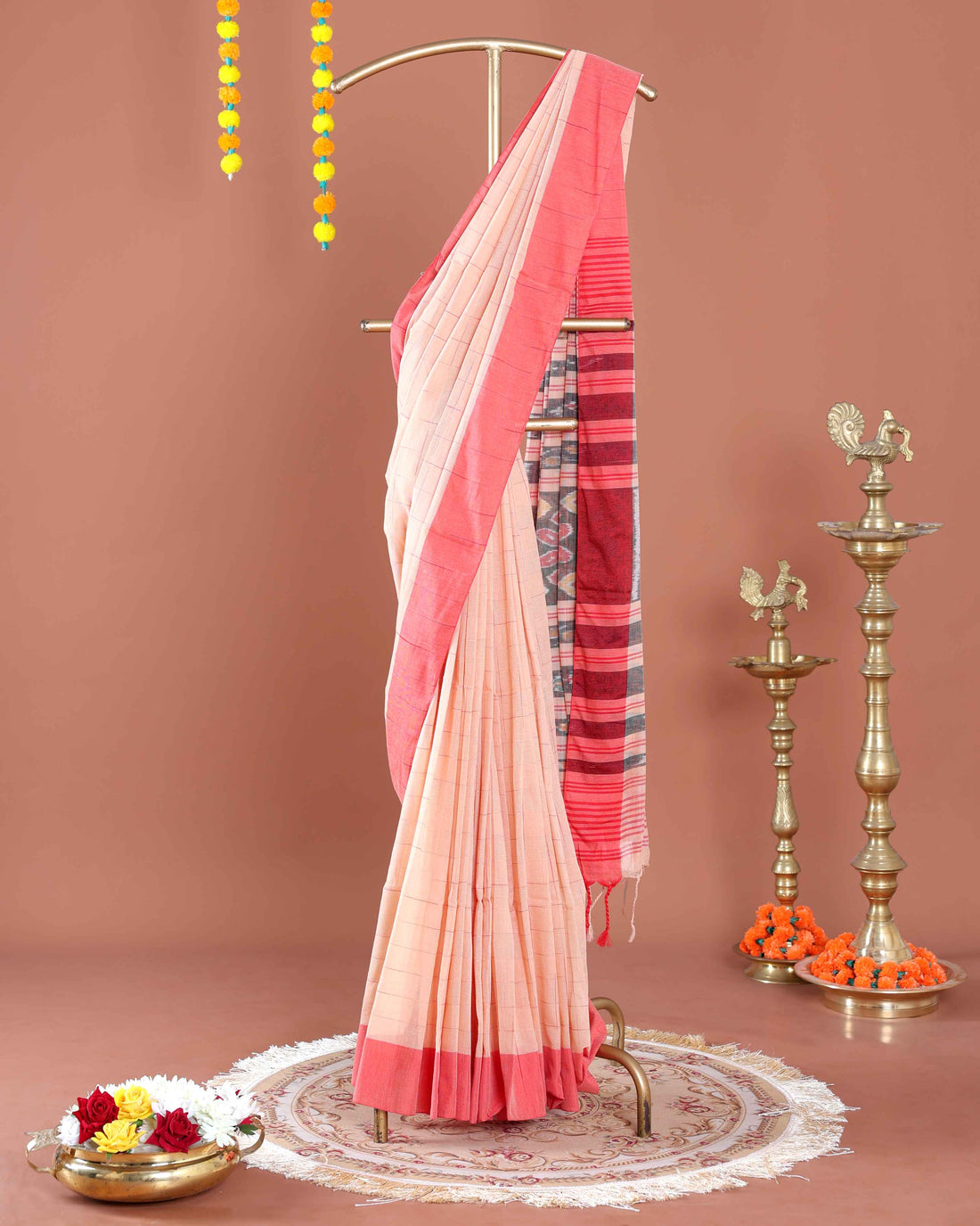 Handloom Cotton Saree with Checkered Body and Striped Pallu - Off White