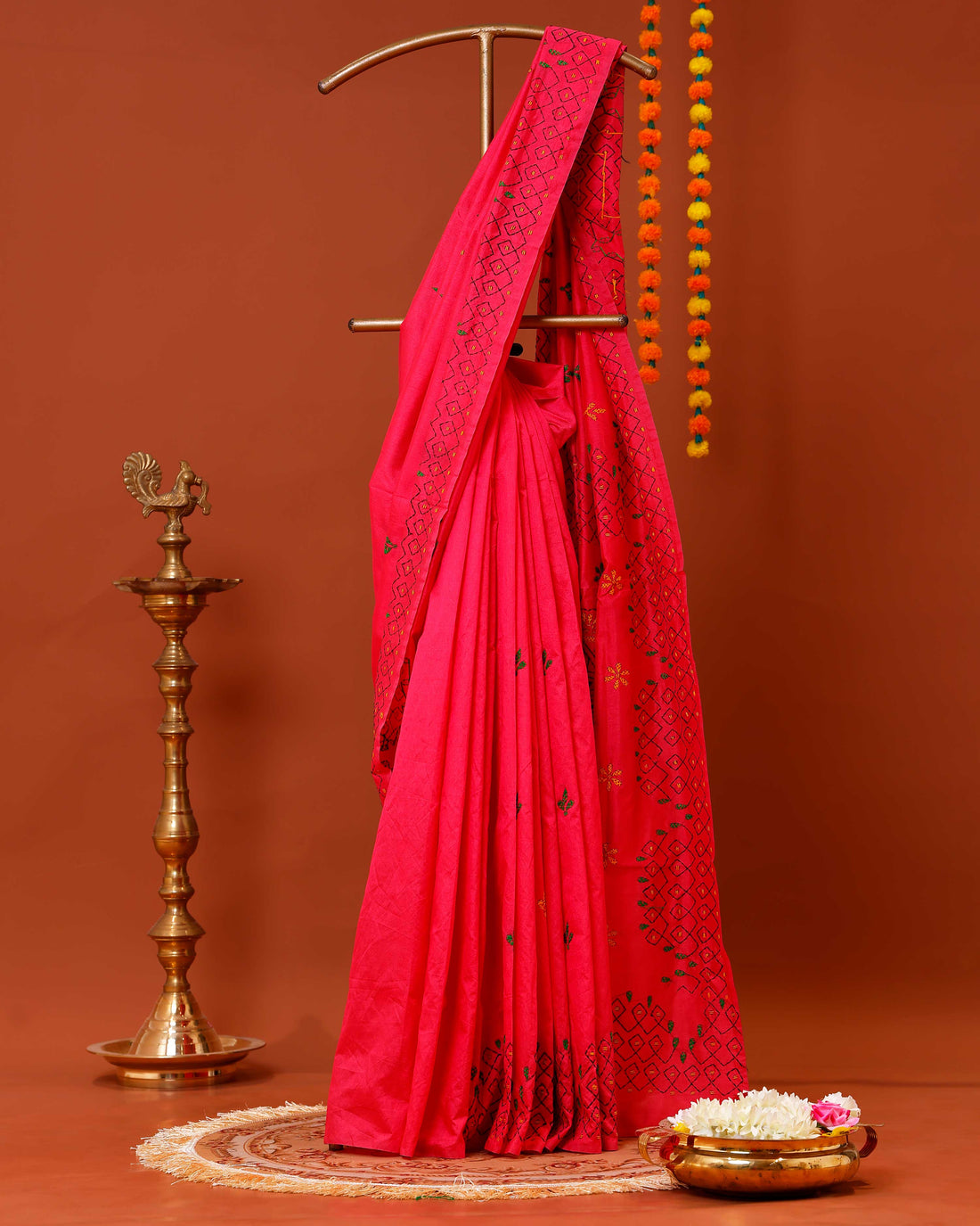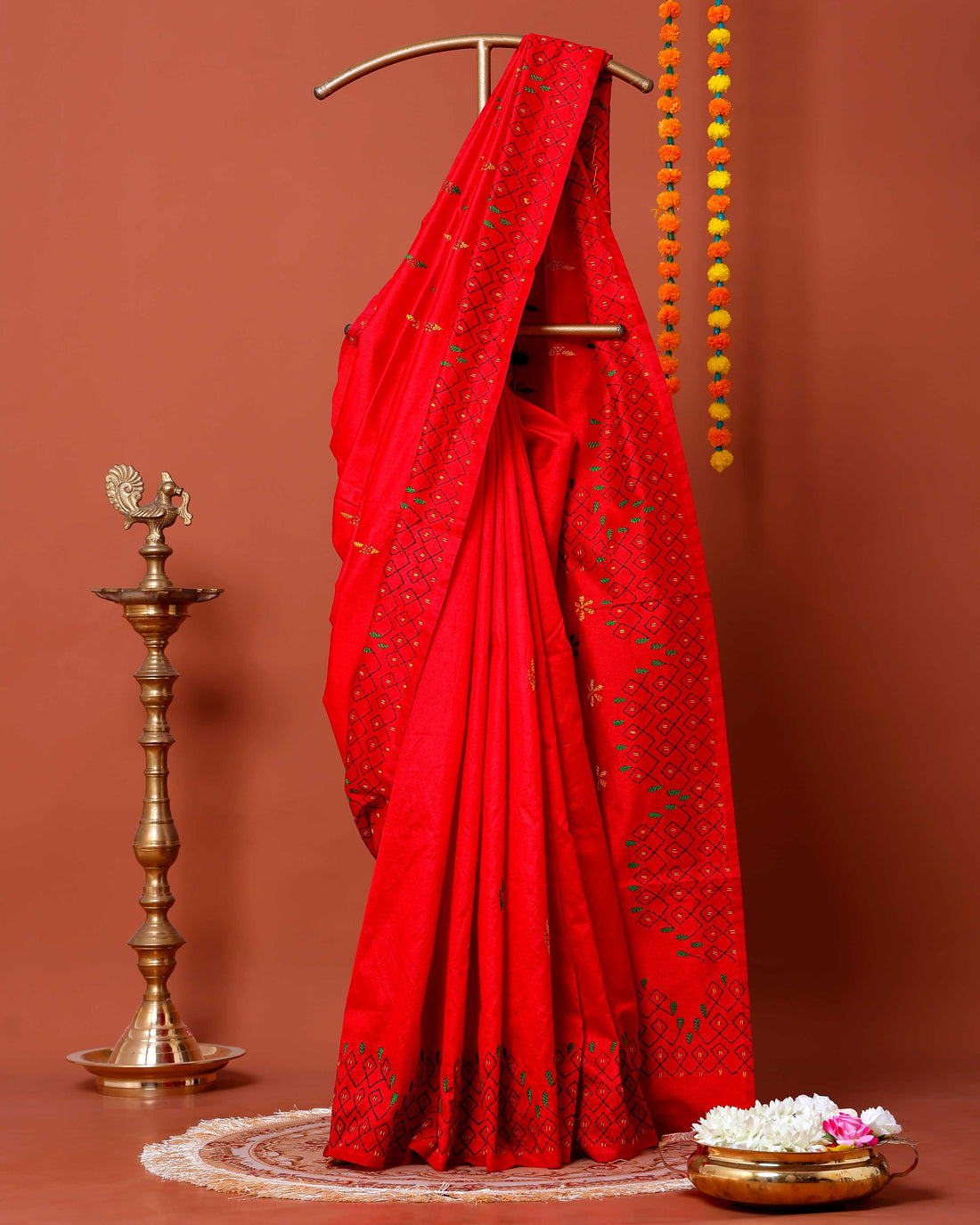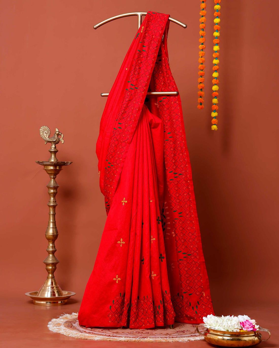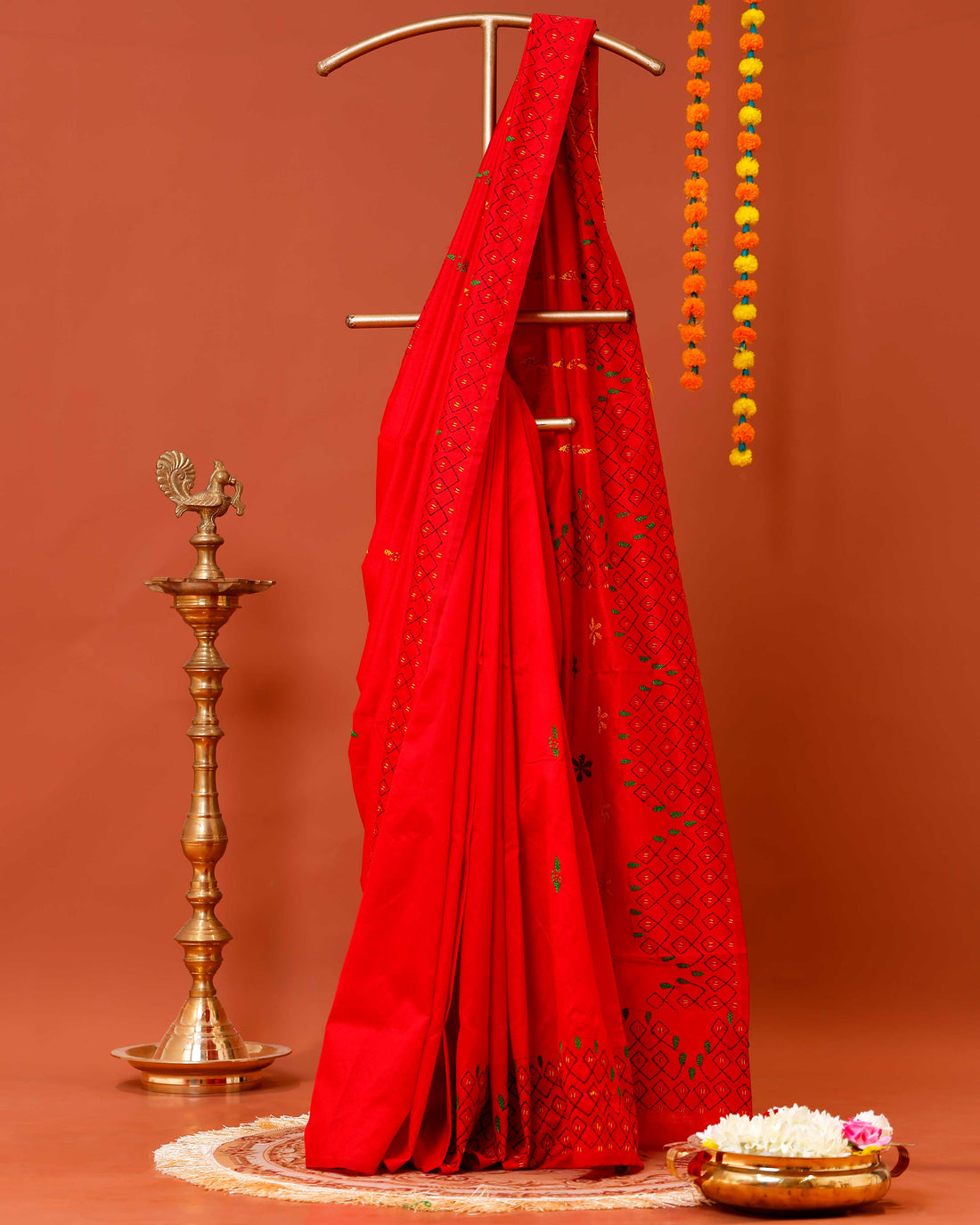 Elegant Kantha Work Saree with Intricate Geometric and Floral Embroidery - Red