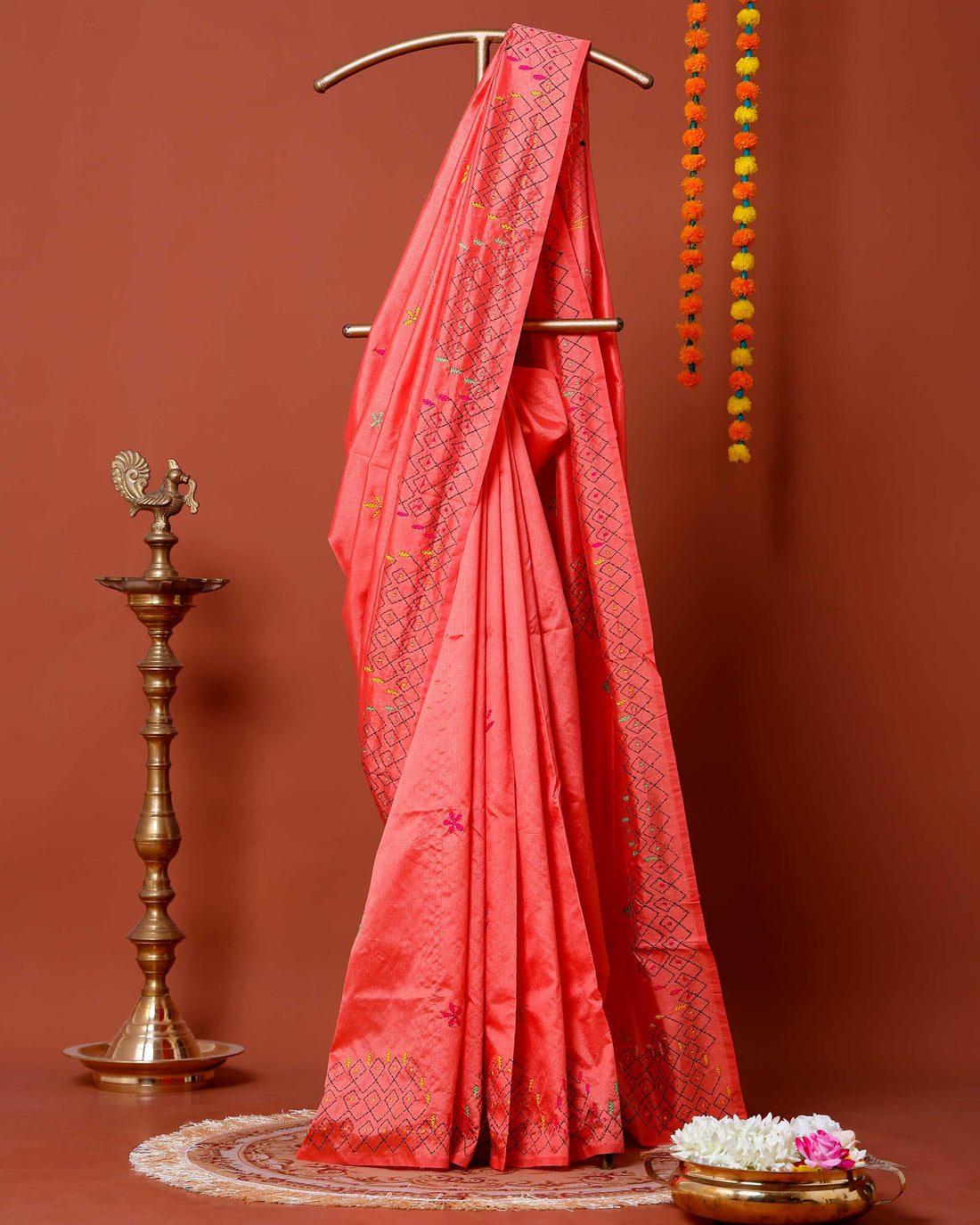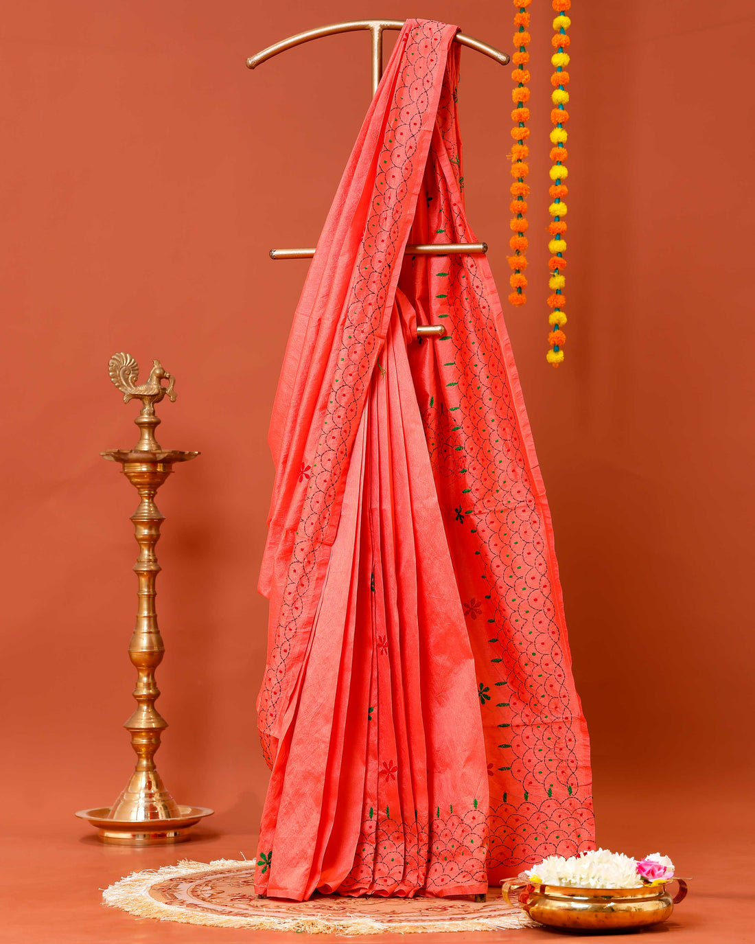 Elegant Kantha Work Saree with Intricate Geometric and Floral Embroidery - Peach