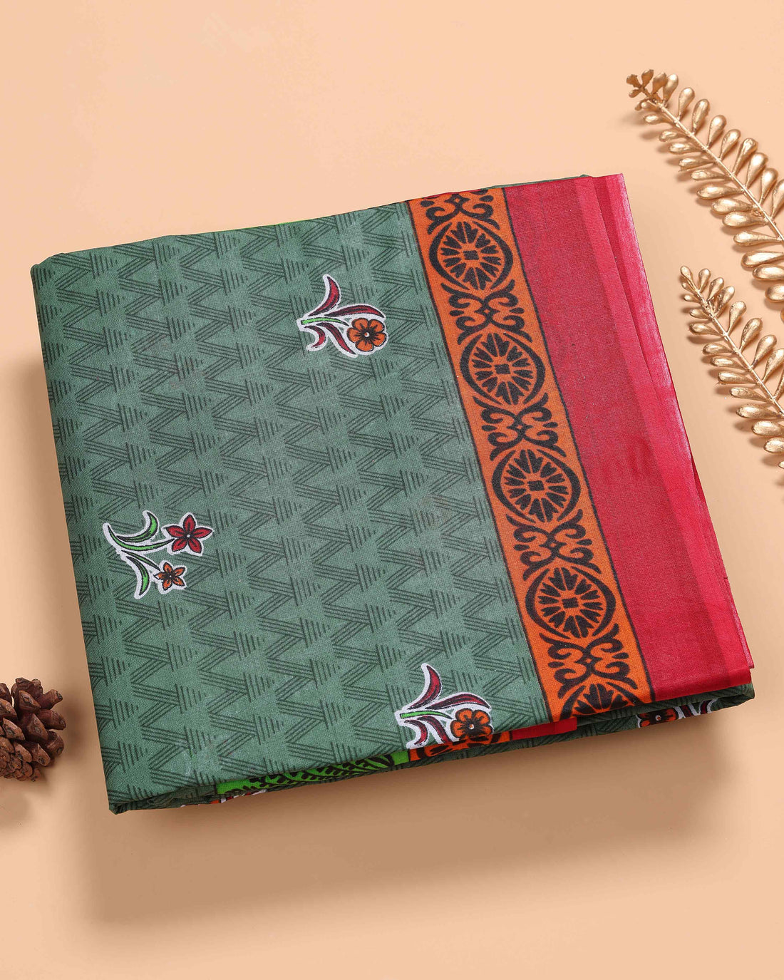 All-Over Floral Printed Voile Saree with Intricate Contrast Border – Green