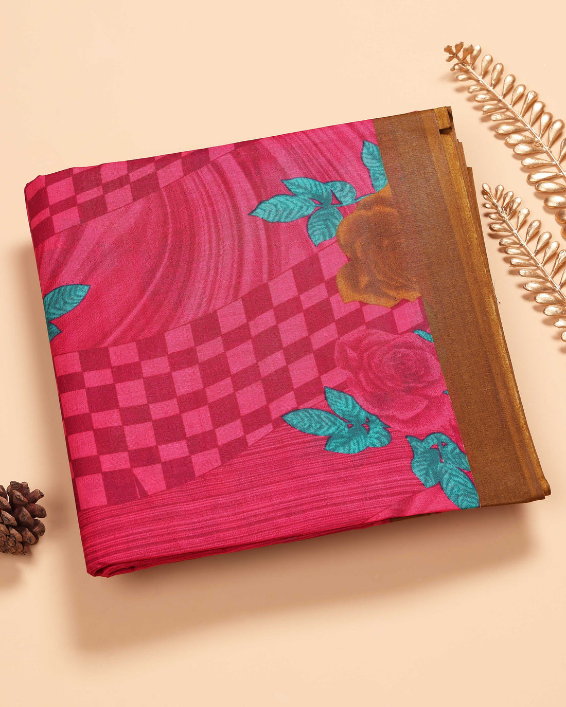 All-Over Floral Printed Voile Saree with Intricate Contrast Border – Brown