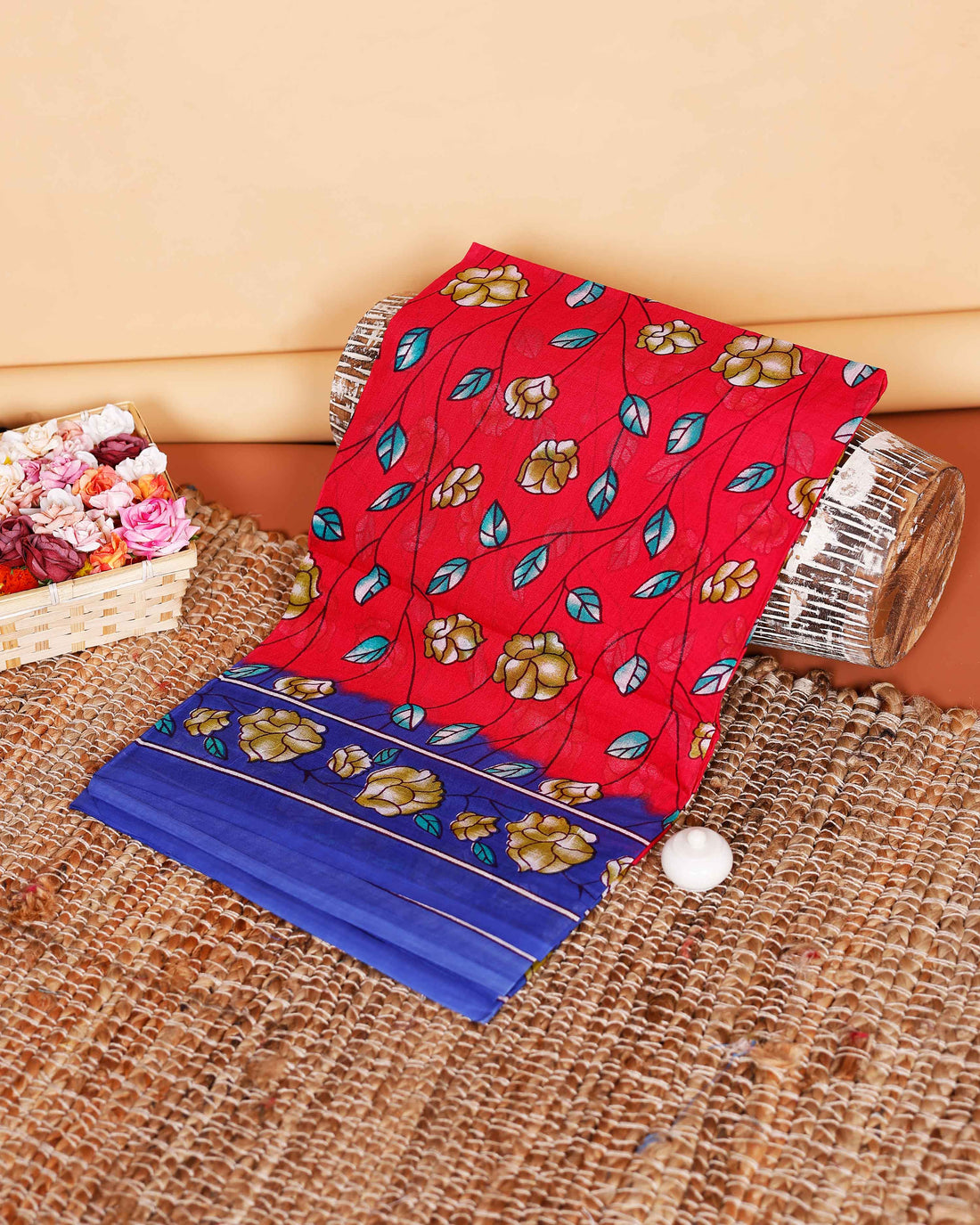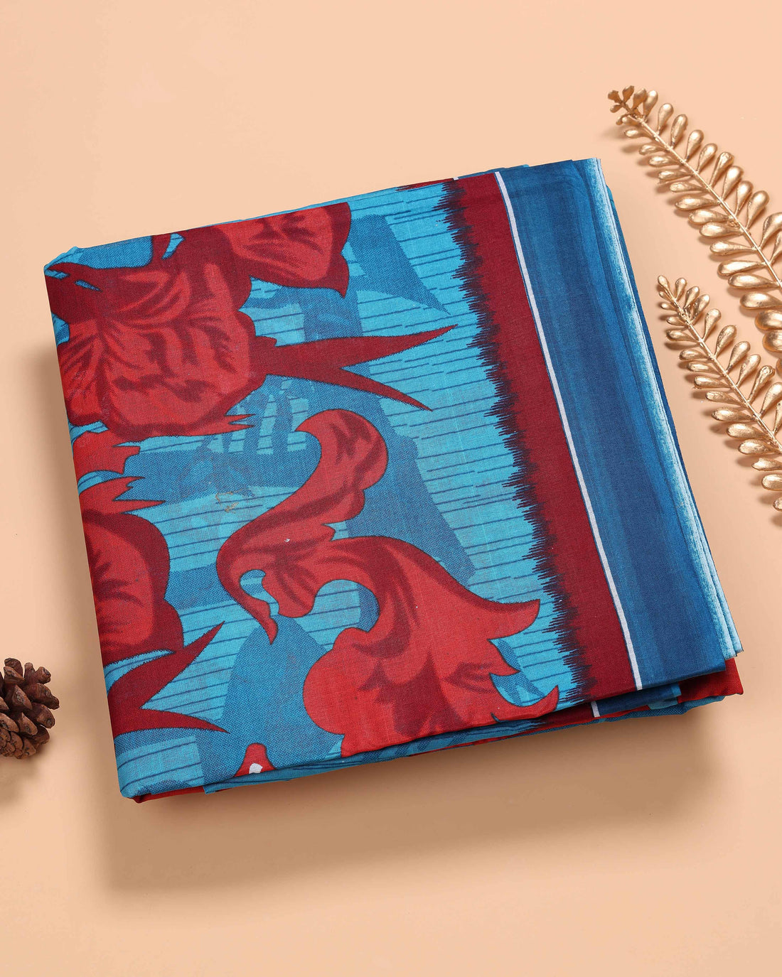 Graceful Floral Printed Voile Cotton Saree with Contrasting Border - Red