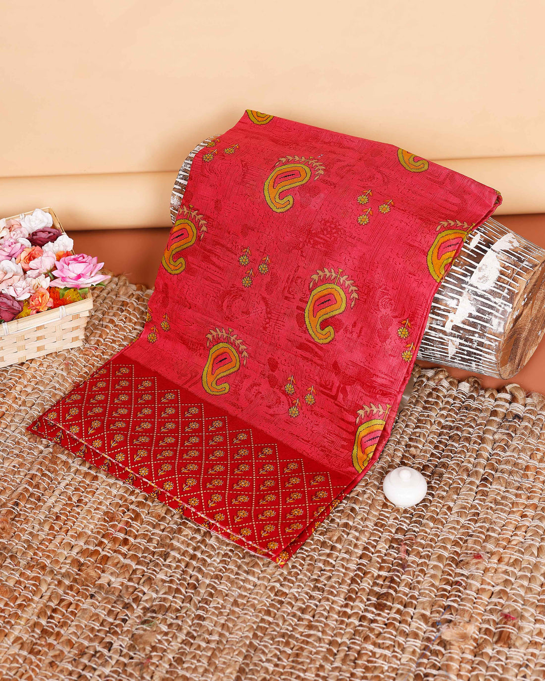 Graceful Paisley Printed Voile Cotton Saree with Geometric Border - Red
