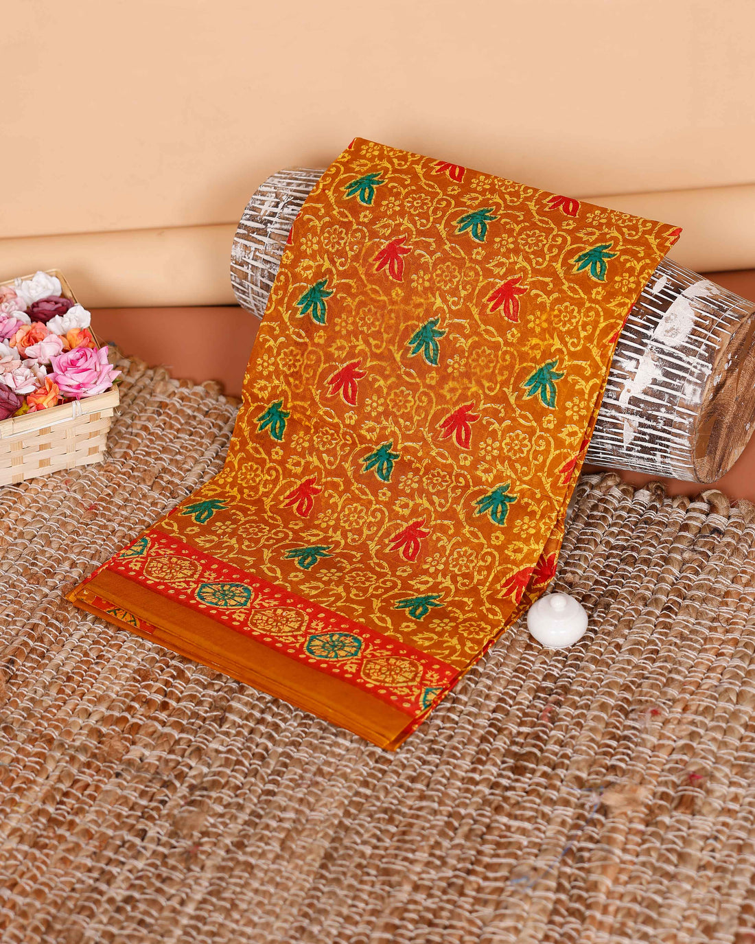 Floral Hand-Block Printed Voile Saree with Intricate Contrast Border and Paisley Accents – Orange