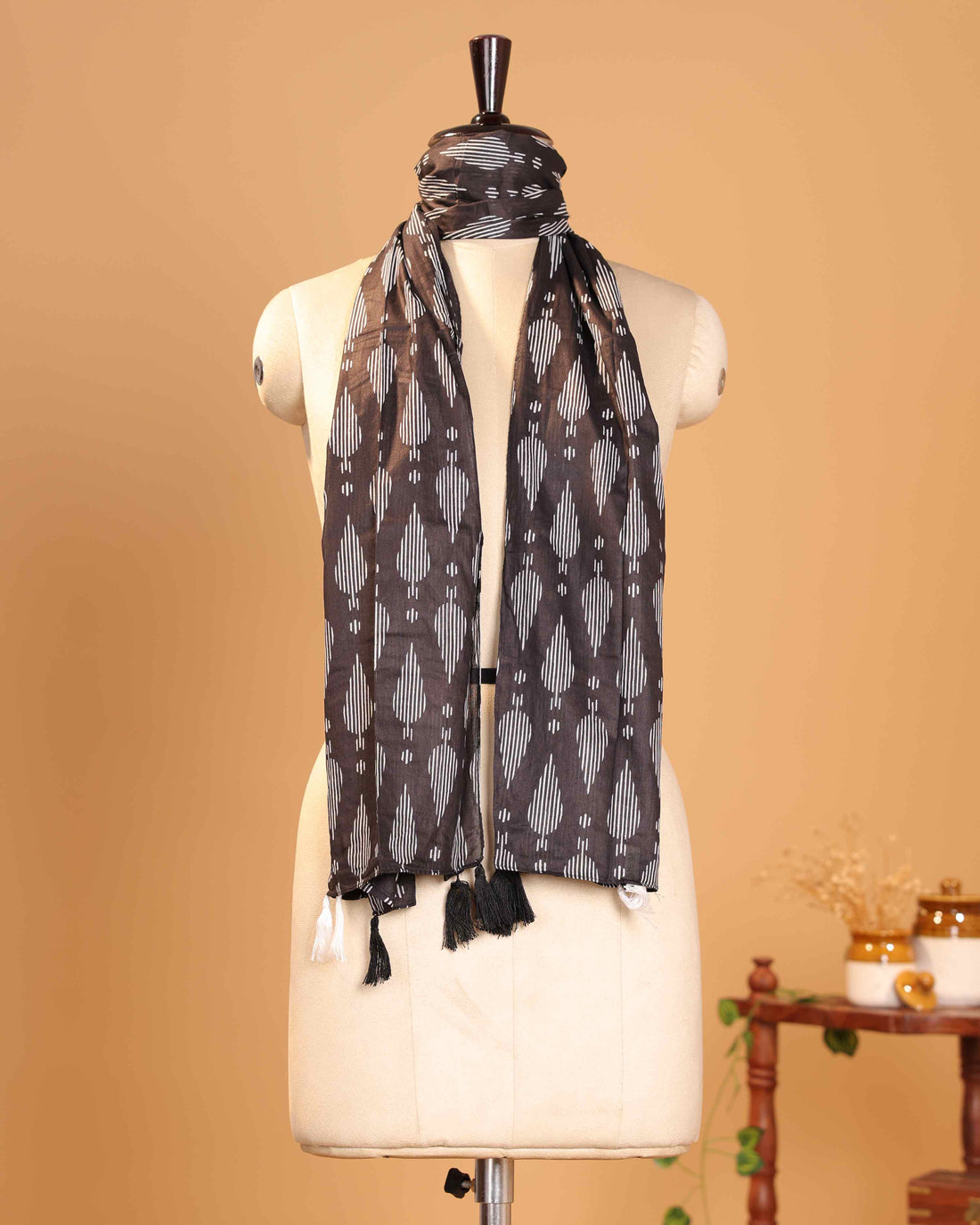Elegant Women’s Ikkat Pattern Dupatta with Geometric Motifs and Tassel Detailing - Dark Brown