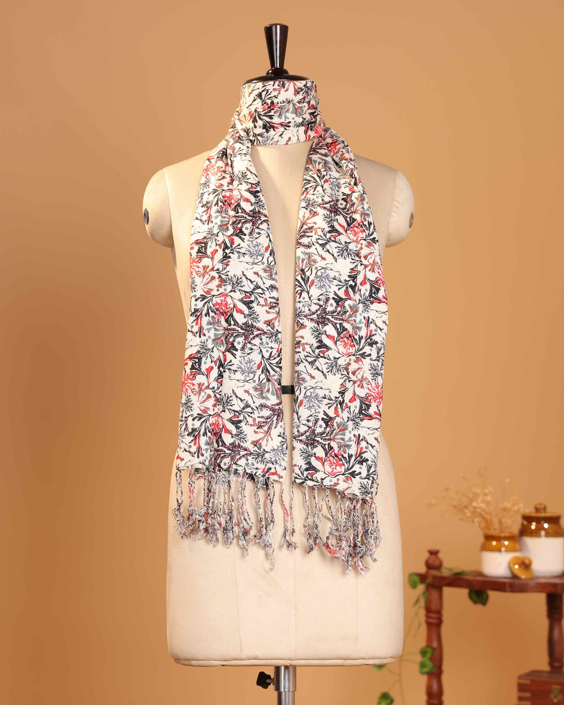 Elegant Women’s Floral Printed Dupatta with All Over Botanical Motifs and Tassel Finish - Off White
