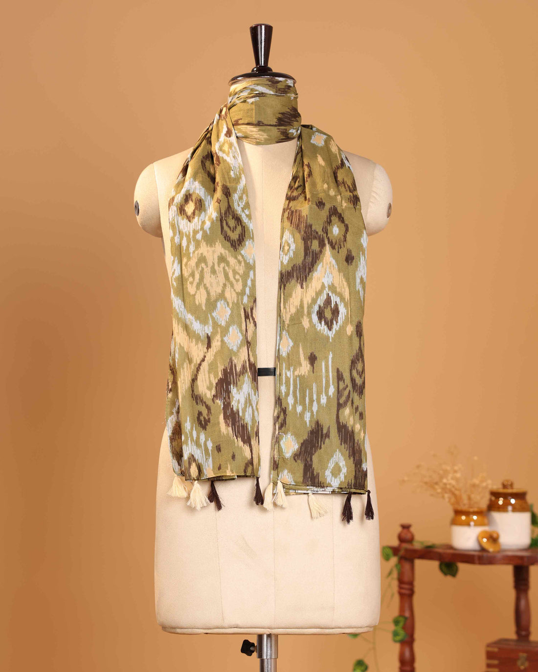 Elegant Women’s Ikkat Inspired Printed Dupatta with Traditional Motifs Tassel Detailing - Olive Green