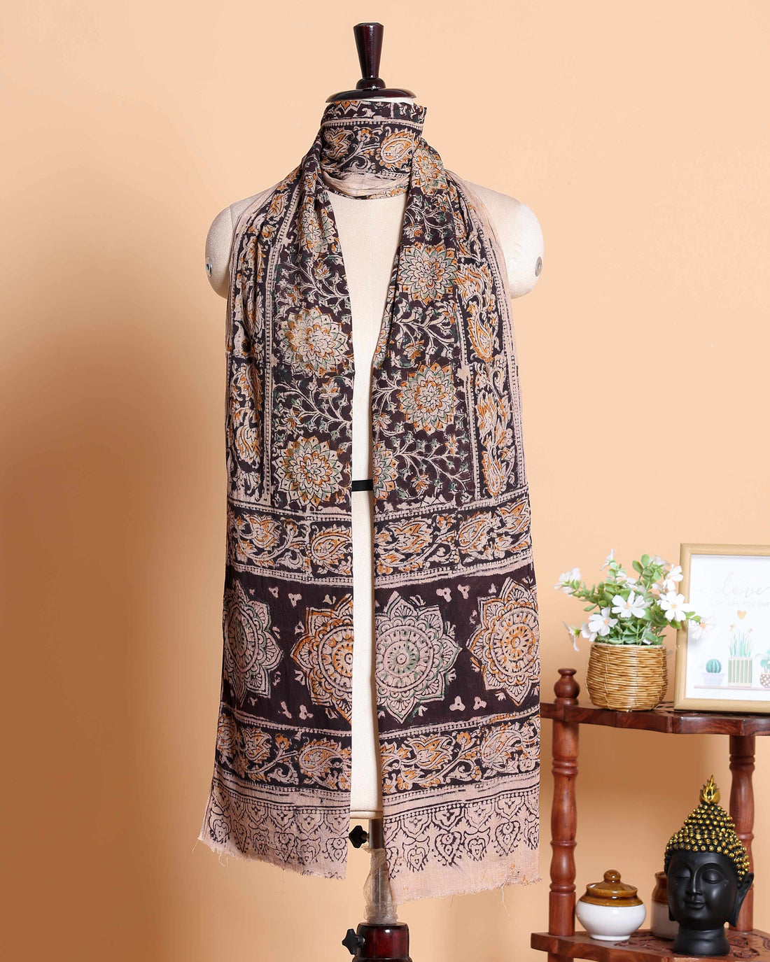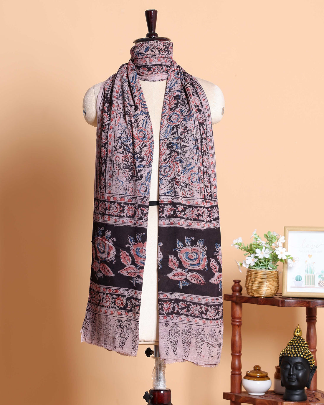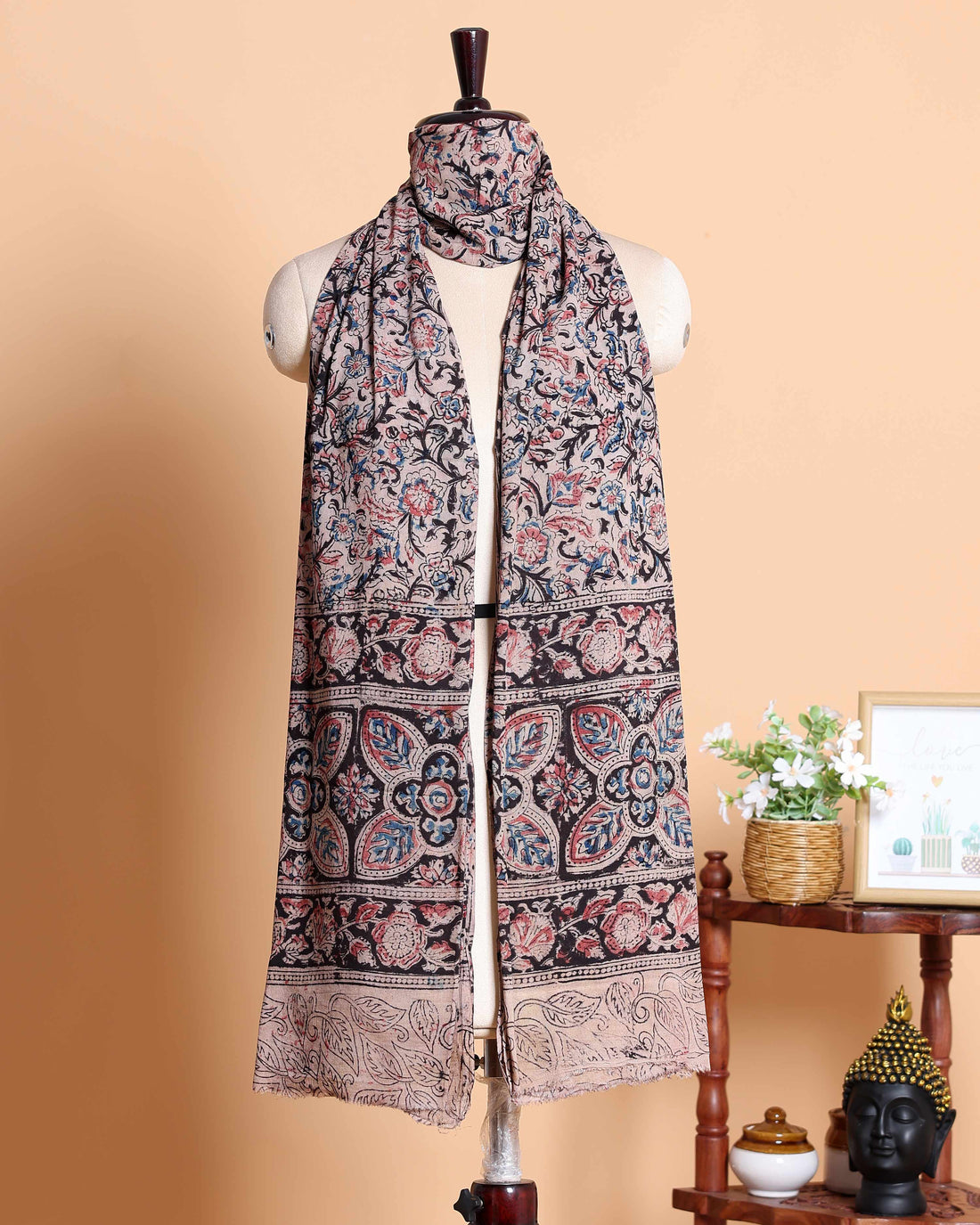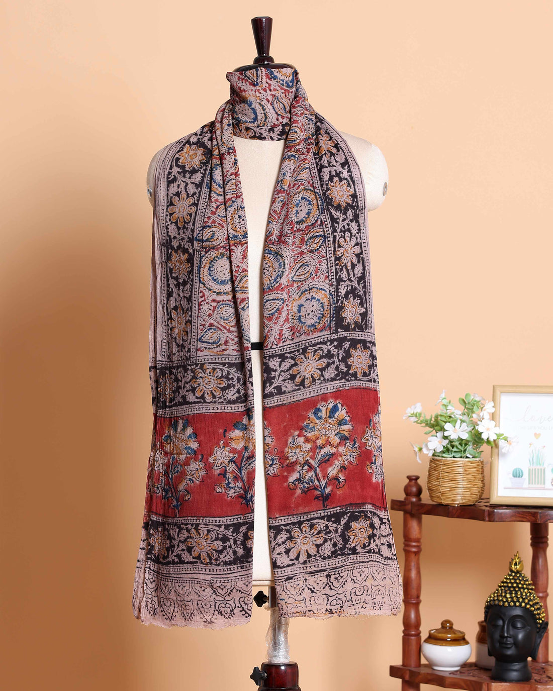 Elegant Women's Kalamkari Print Cotton Dupatta with Intricate Floral and Paisley Motifs - Multi