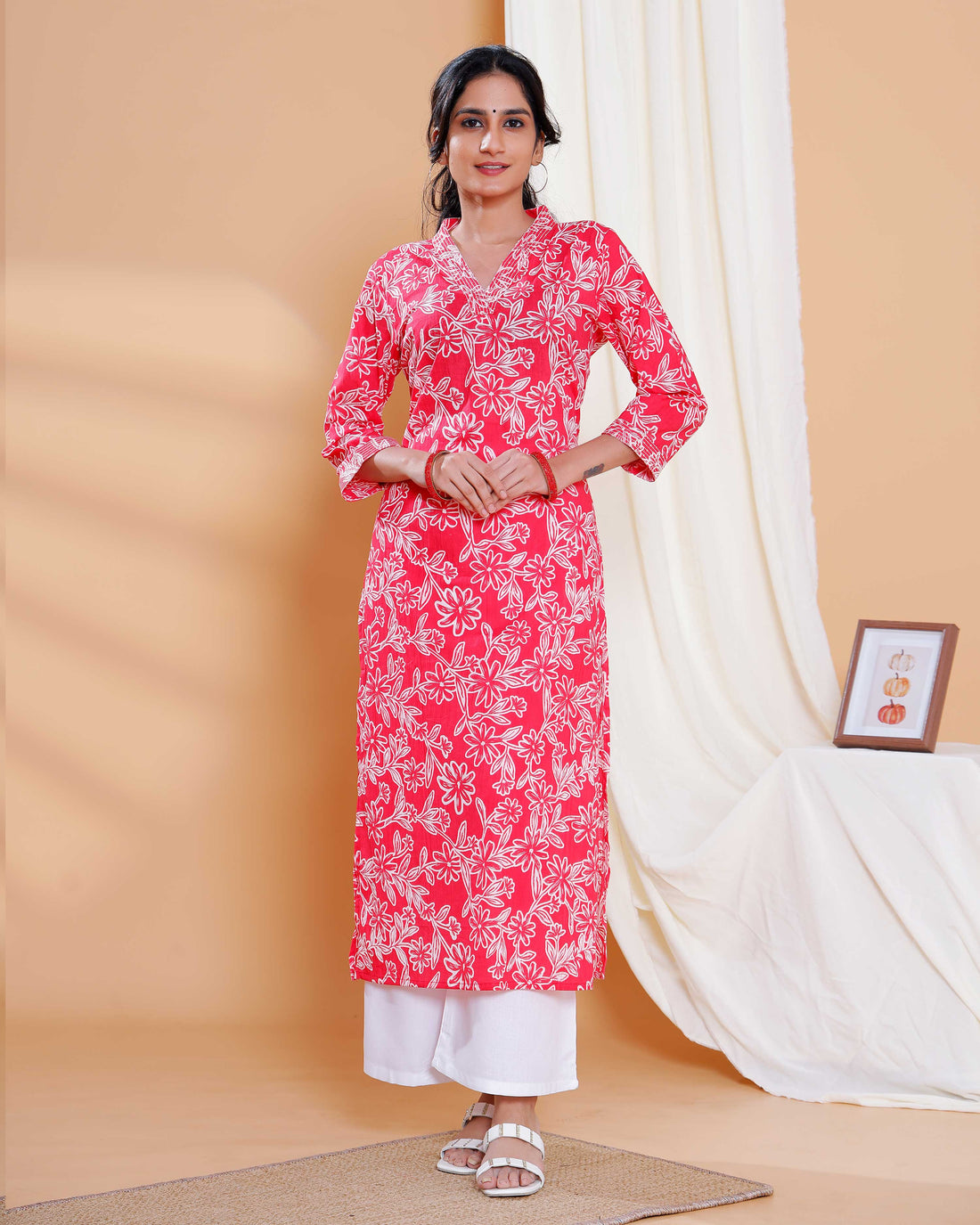 Floral Printed Straight Kurta with V-Neck and 3/4th Sleeves - Red