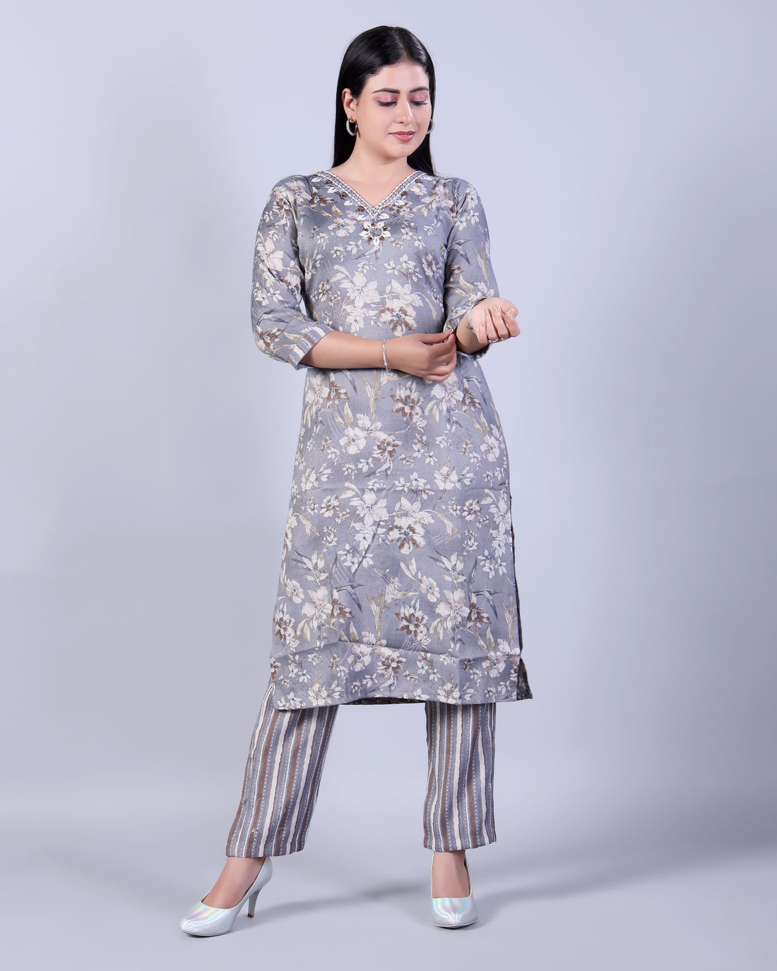 Graceful Floral Printed Kurta with Striped Palazzo - Grey