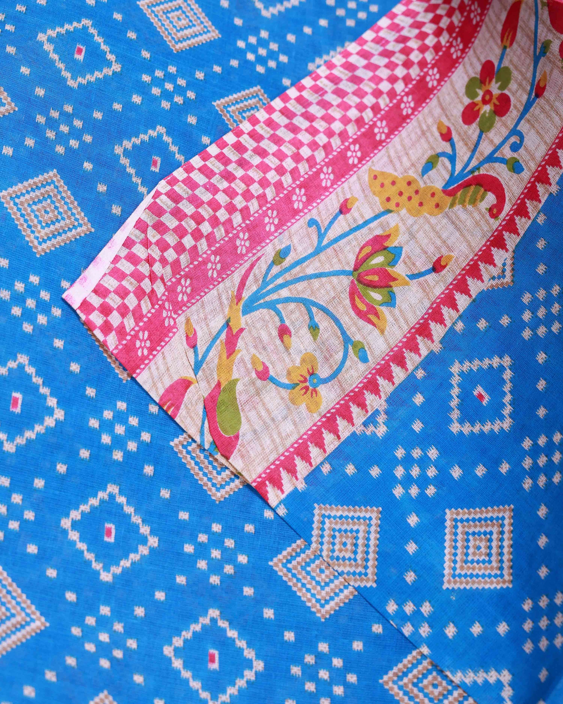 - Soft and breathable Voile cotton saree showcasing subtle geometric woven motifs along with a finely detailed floral pallu border.