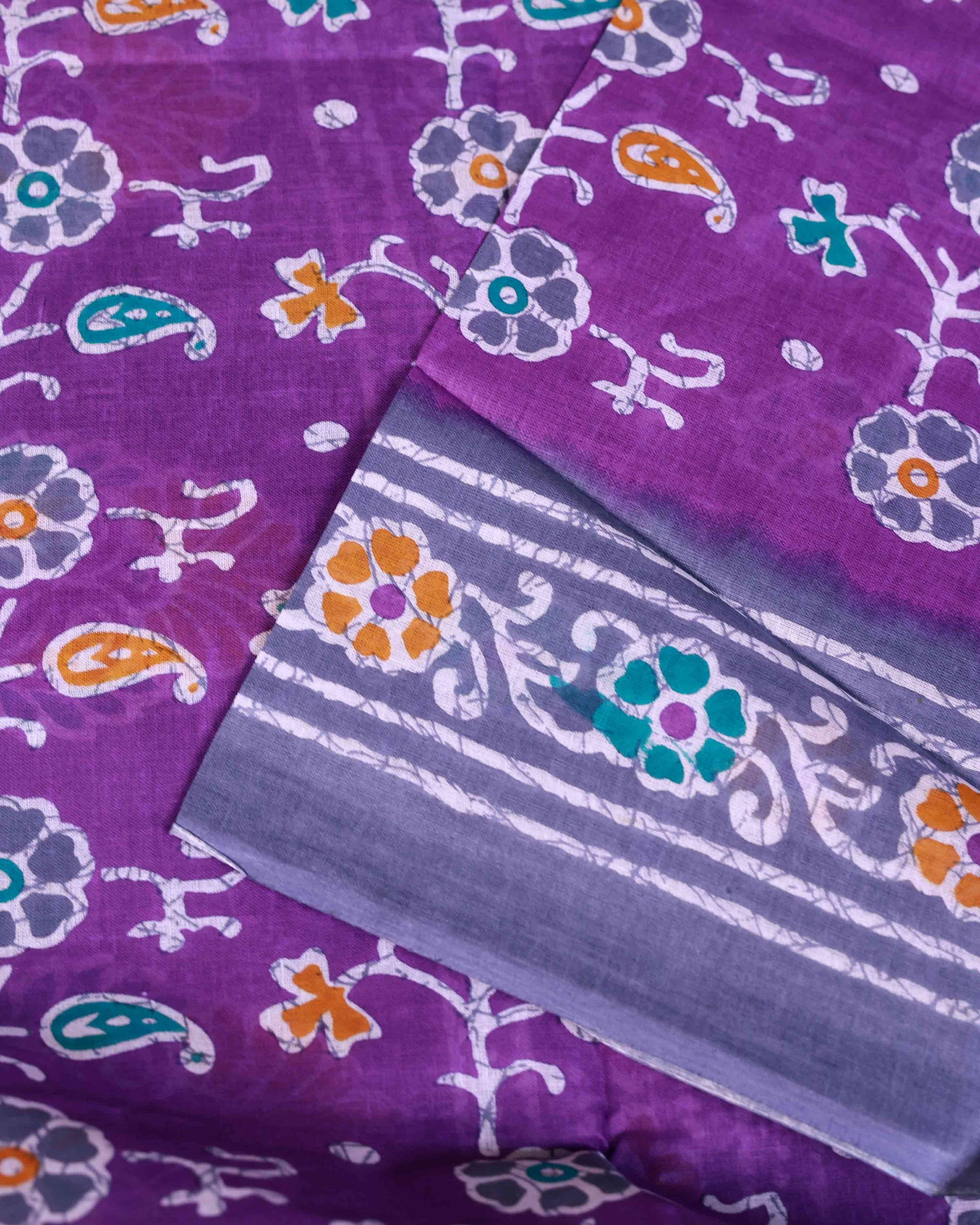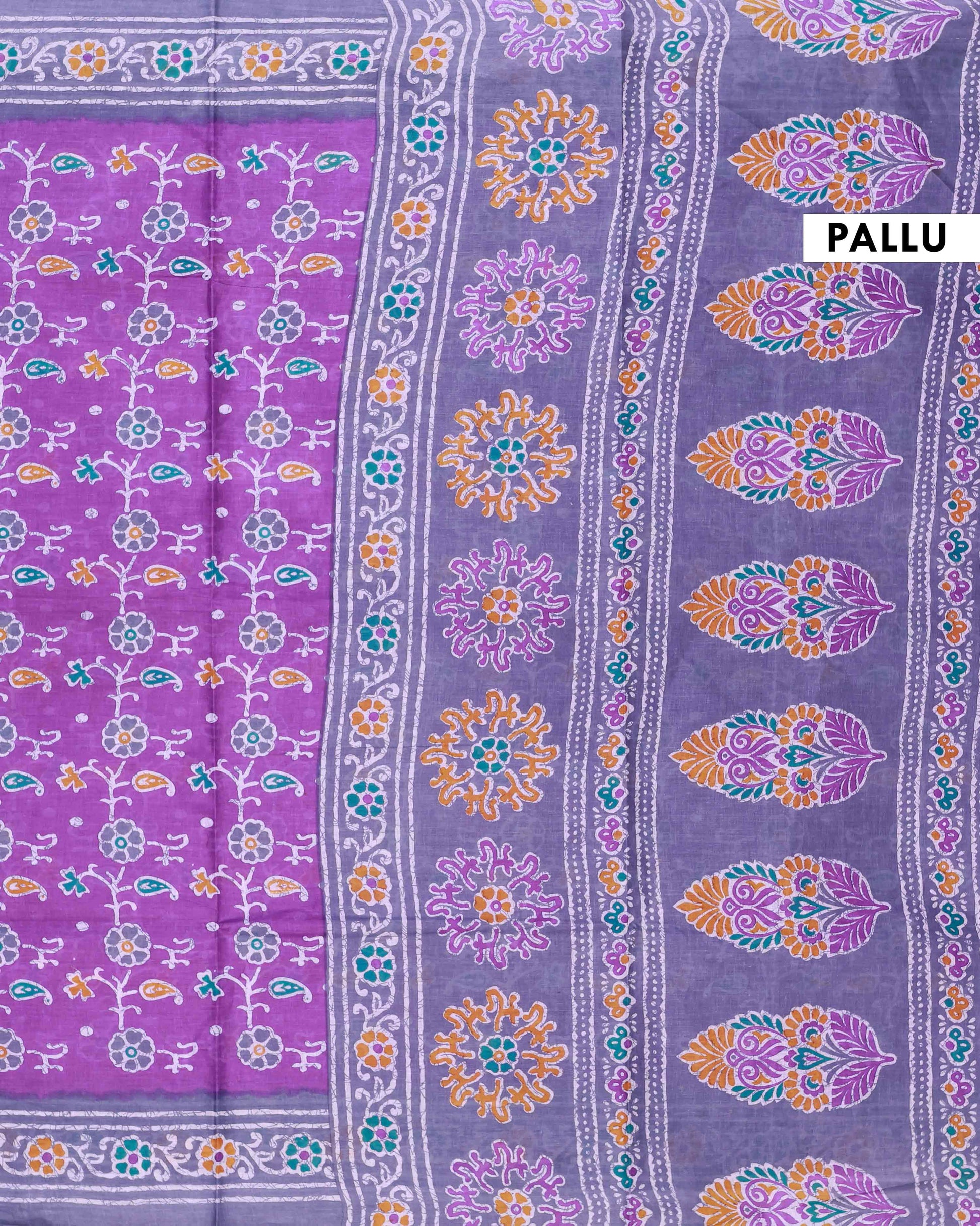 - Lightweight voile cotton saree highlighted with charming floral and paisley block prints for a graceful everyday look.