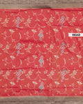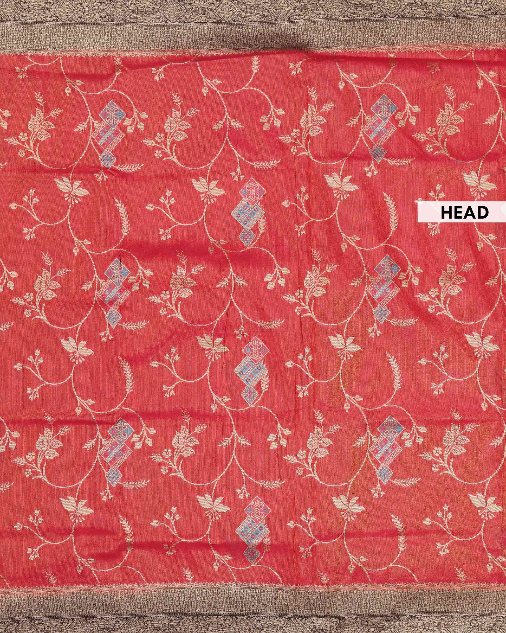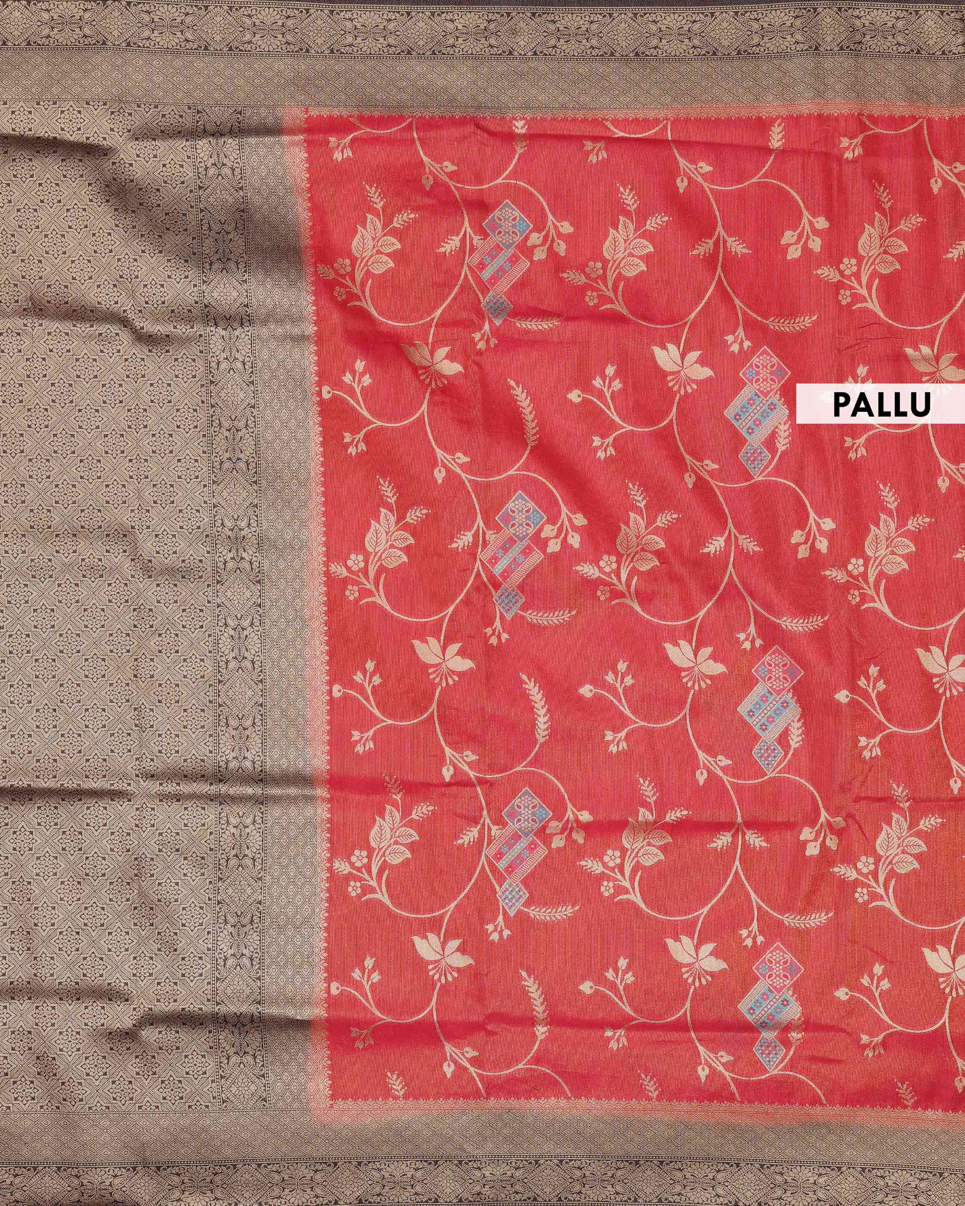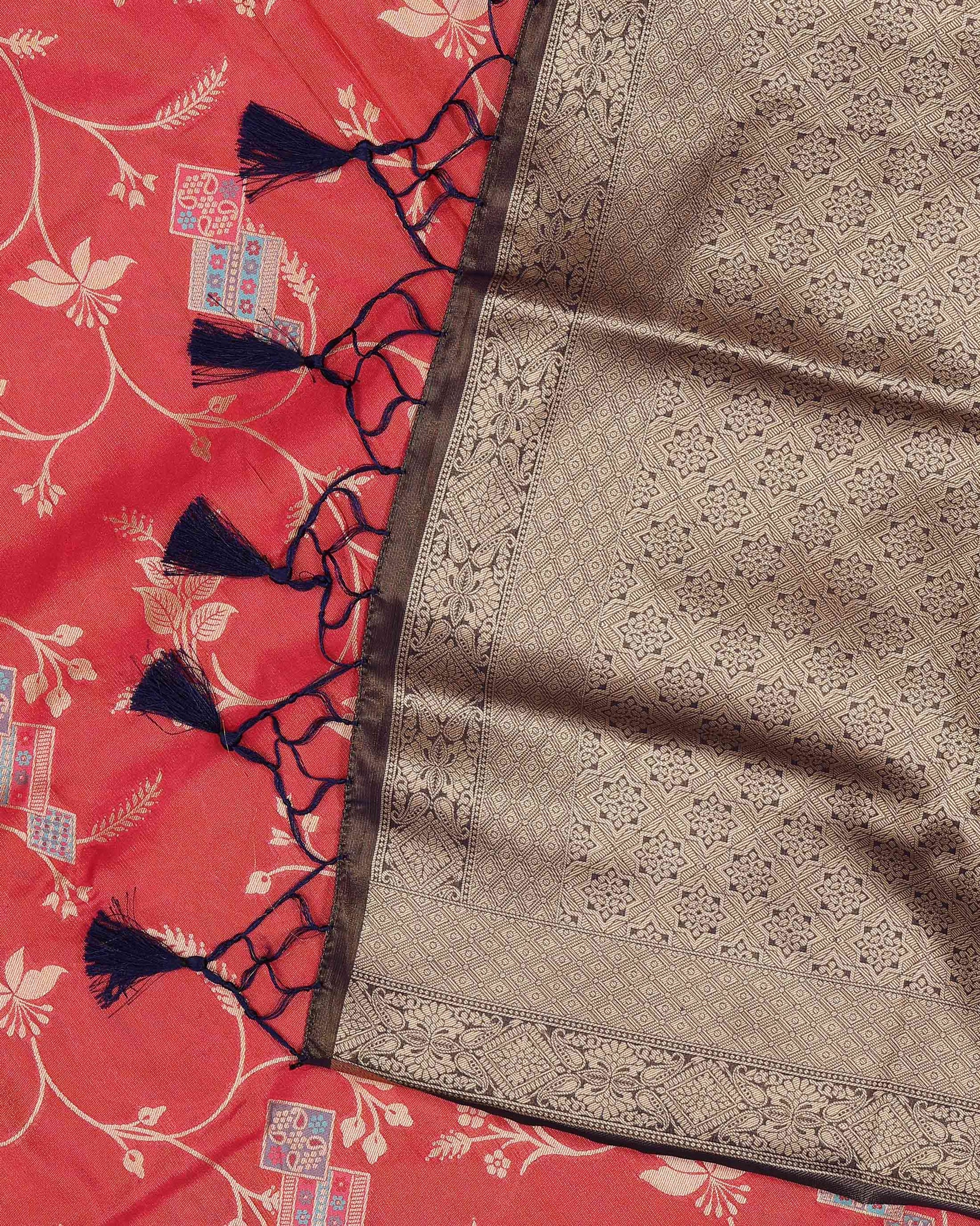 - This reddish-pink art silk saree features intricate golden floral and vine patterns, perfect for a festive or traditional look