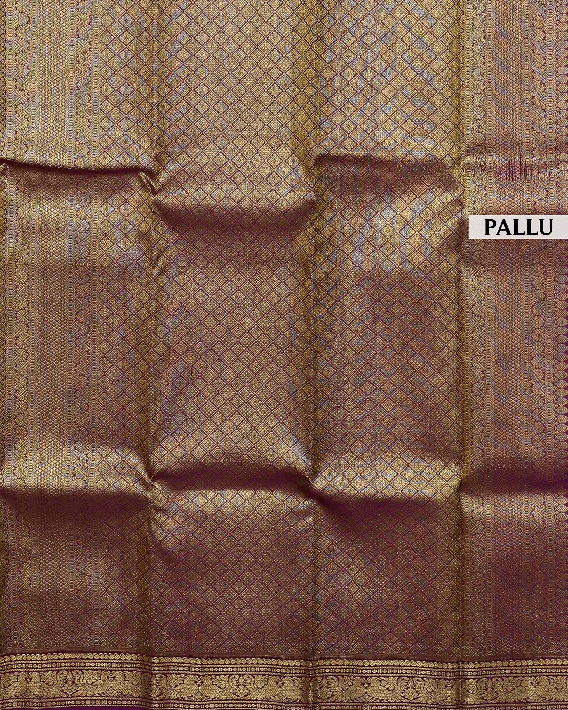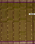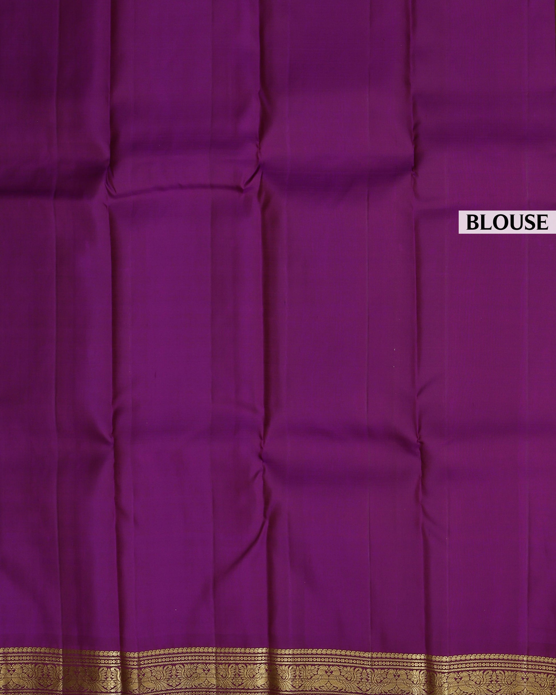 - Elevate your traditional wardrobe with this exquisite dual-tone Kanchipuram Pure Silk saree, a rich greenish-brown body and a striking purple border with intricate gold zari work