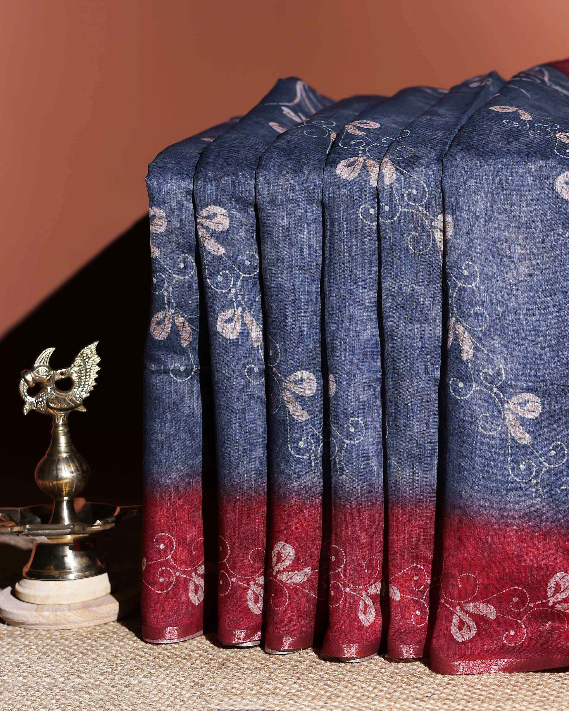 - Elevate your wardrobe with this elegant linen cotton saree a deep blue body and a striking red border.