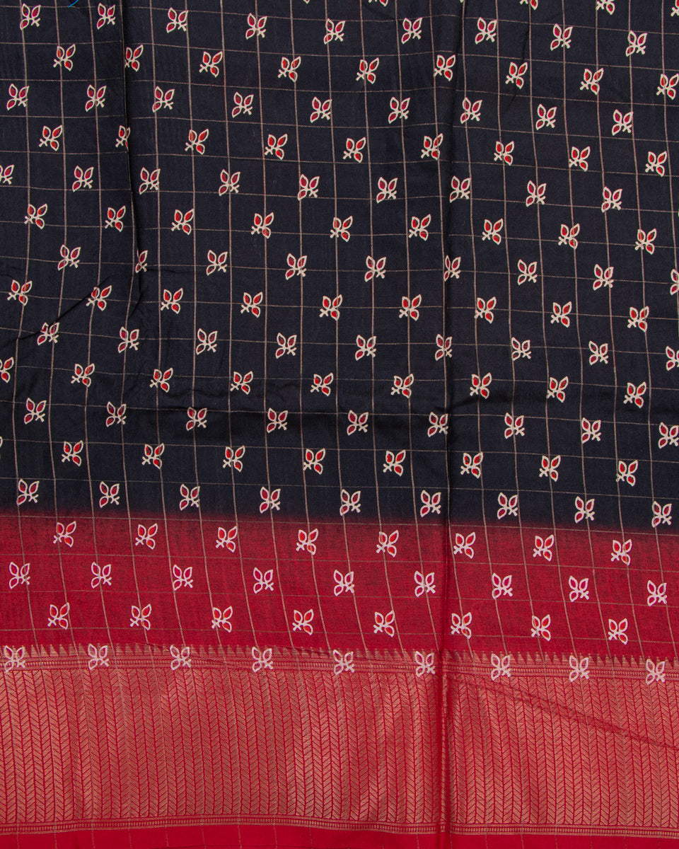 Floral & Checked Pattern Dola Silk Saree With Woven Border - Black