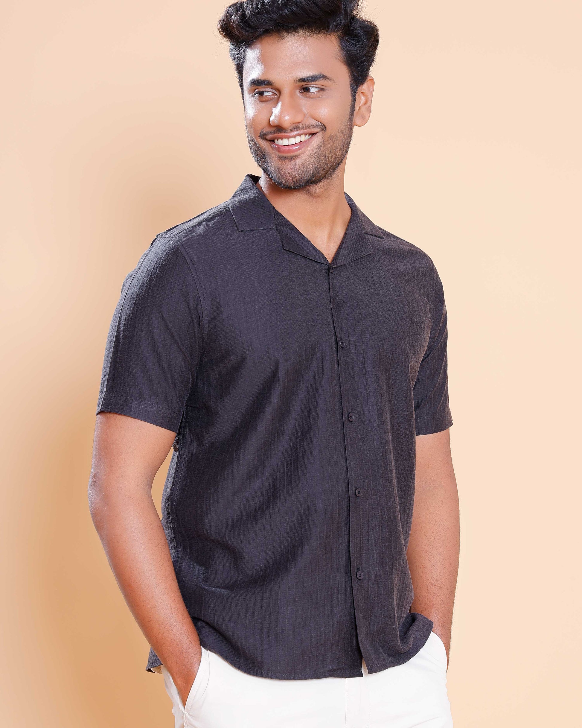 - Elevate a casual wardrobe with this men's black textured poly cotton shirt a stylish Cuban collar and short sleeves for a modern, relaxed fit