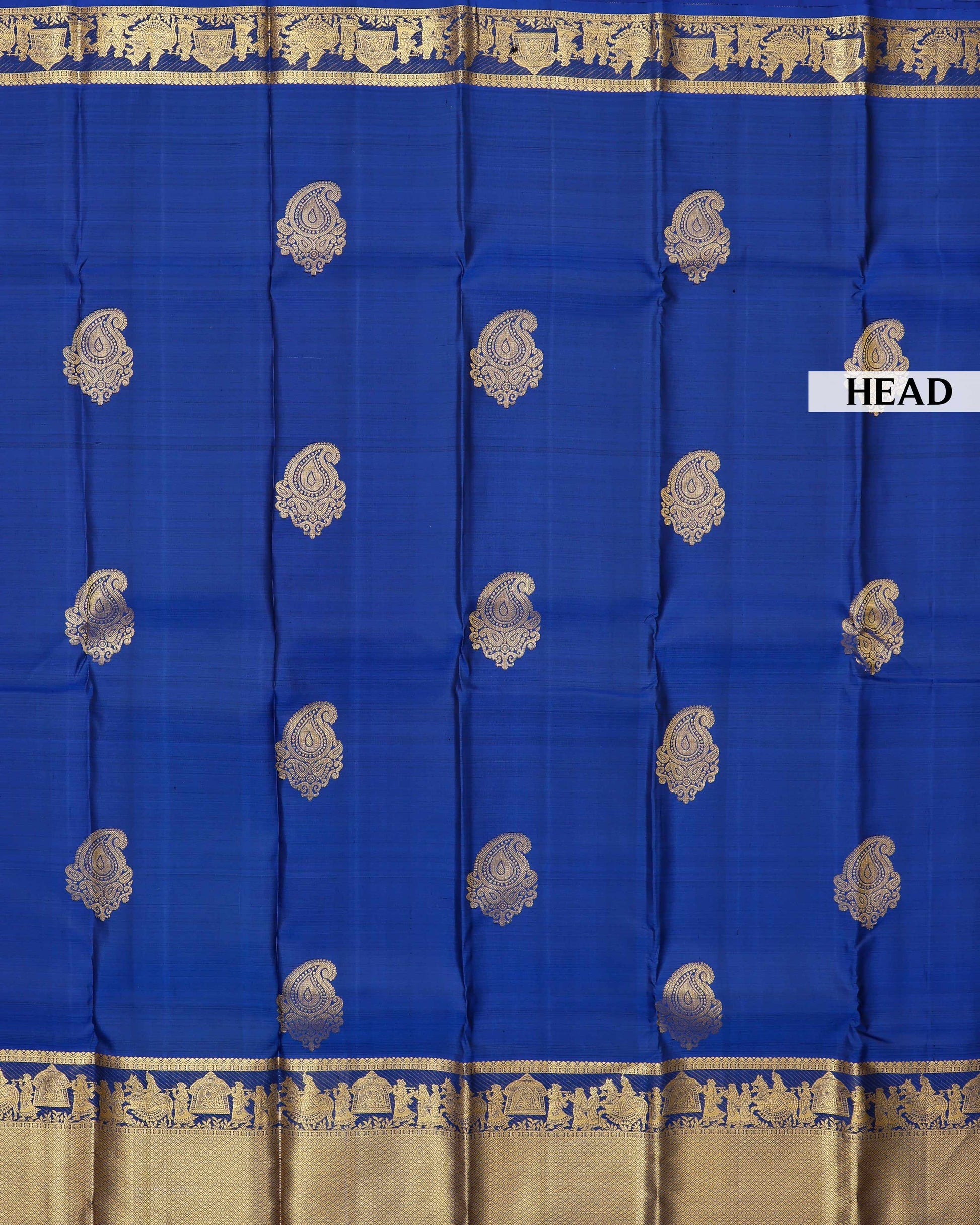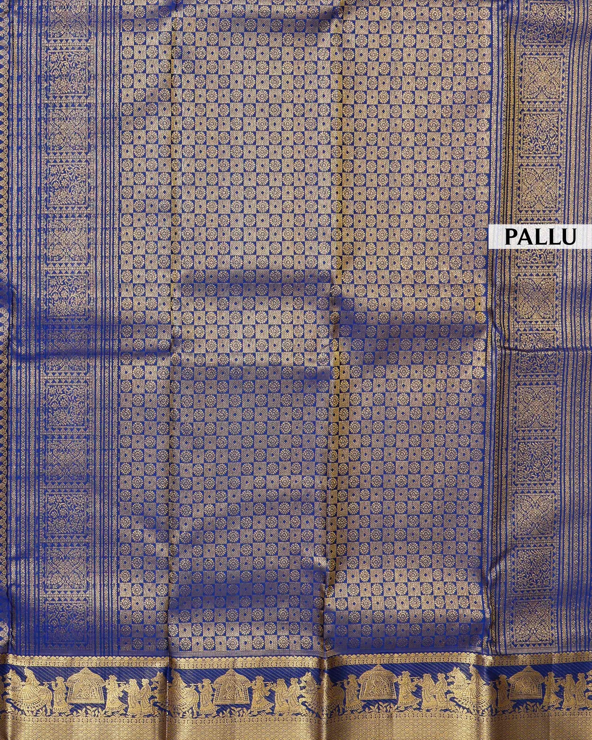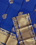 - This exquisite royal blue pure Kanchipuram Pure silk saree is handwoven with a grand golden zari border traditional motifs