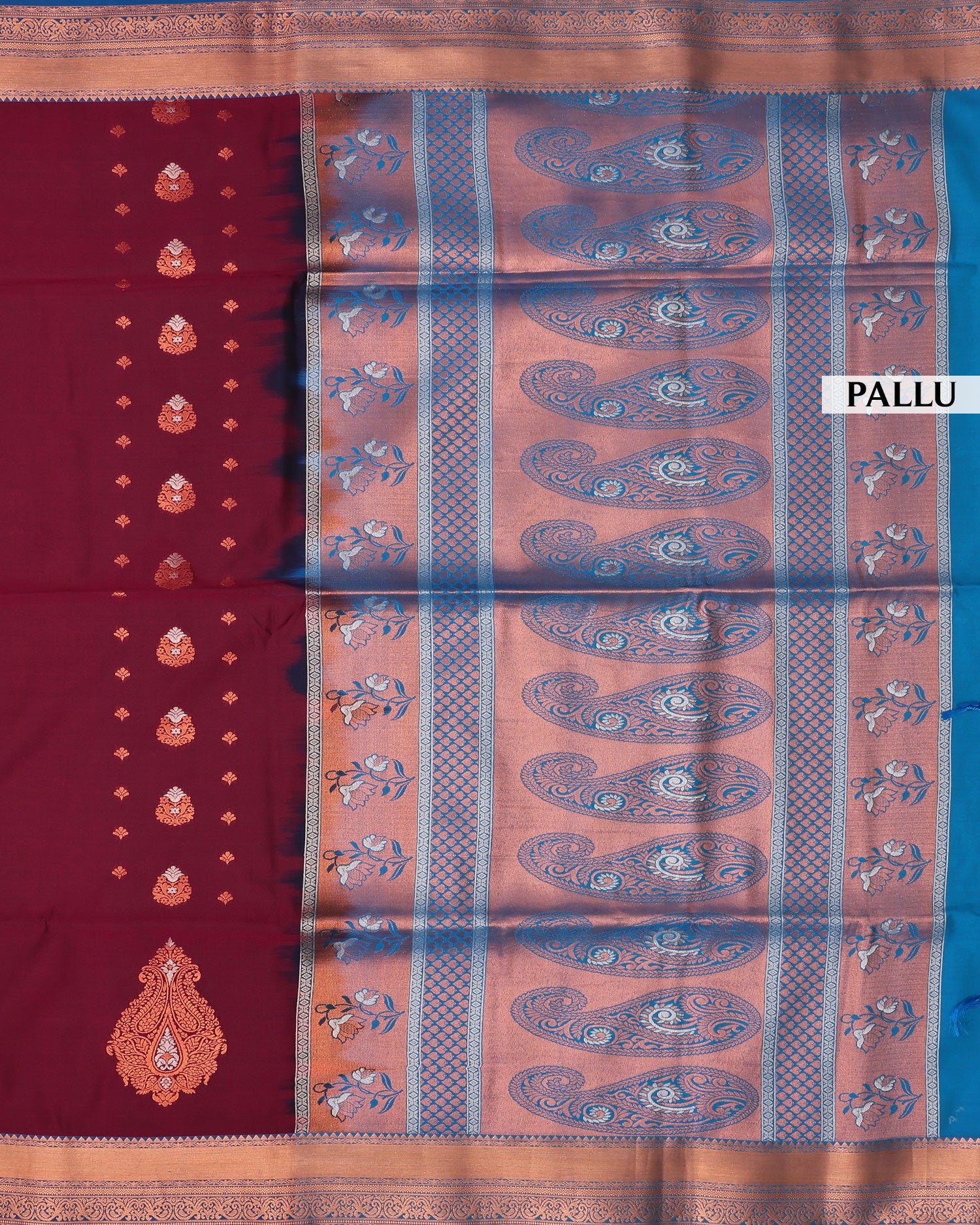- This elegant soft silk saree in a rich maroon a stunning contrast blue border with intricate zari work