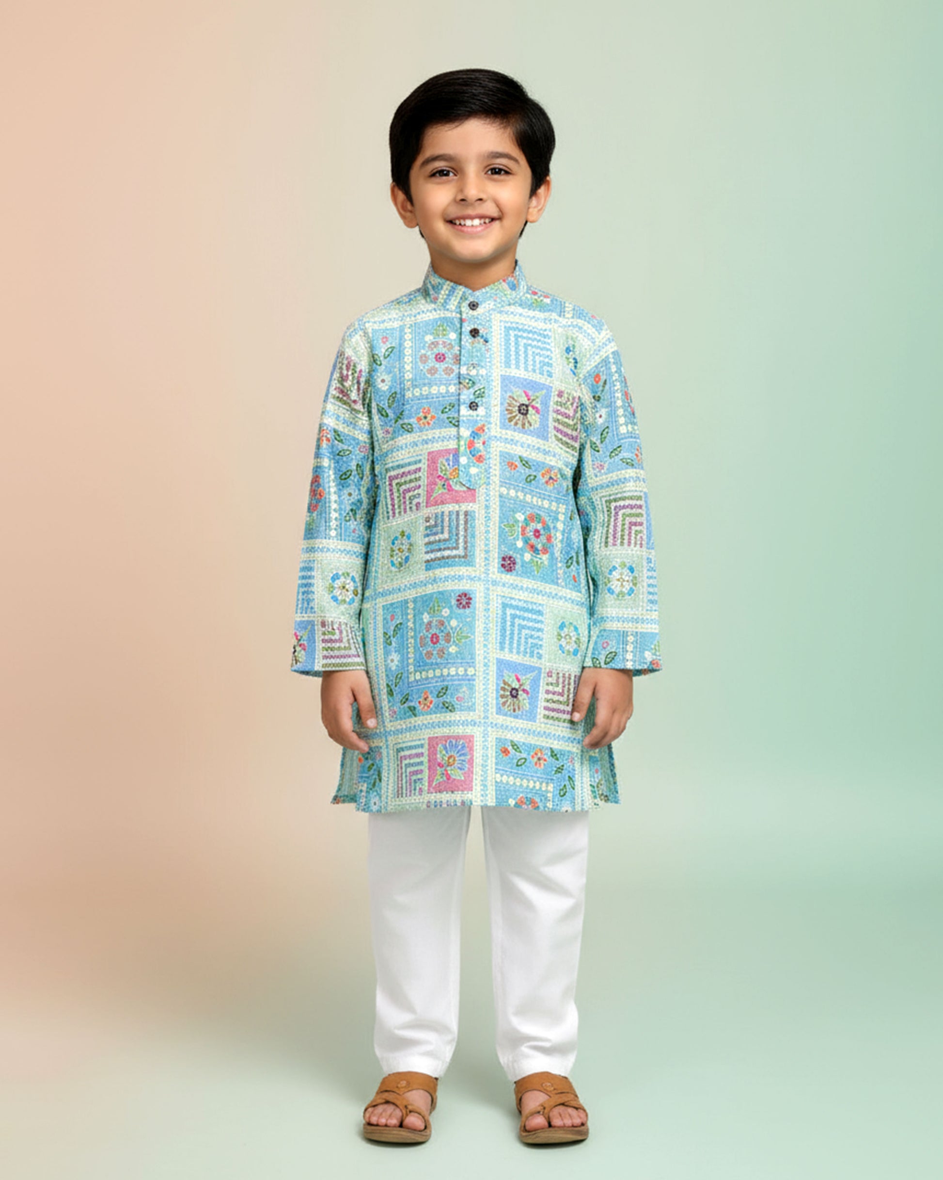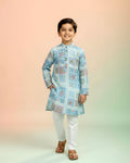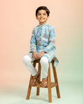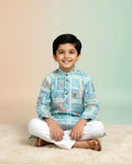 Boys Festive Aqua Blue Kurta Set with Multicolor Geometric Floral Patch Print