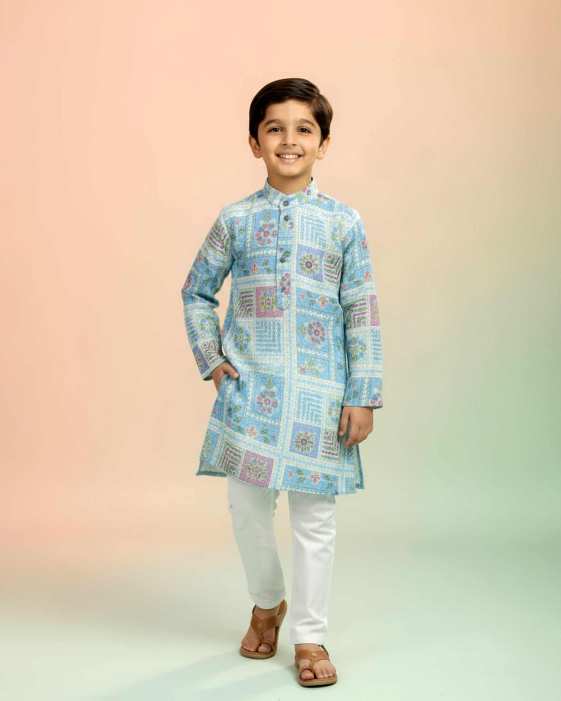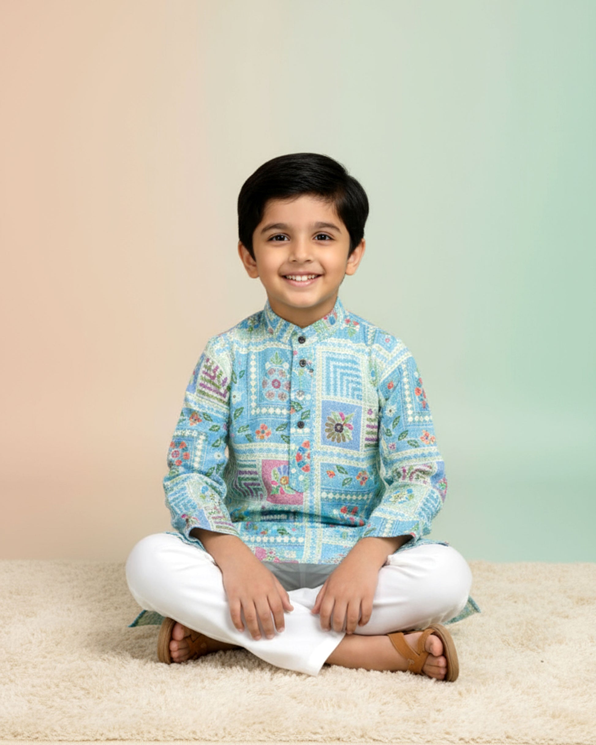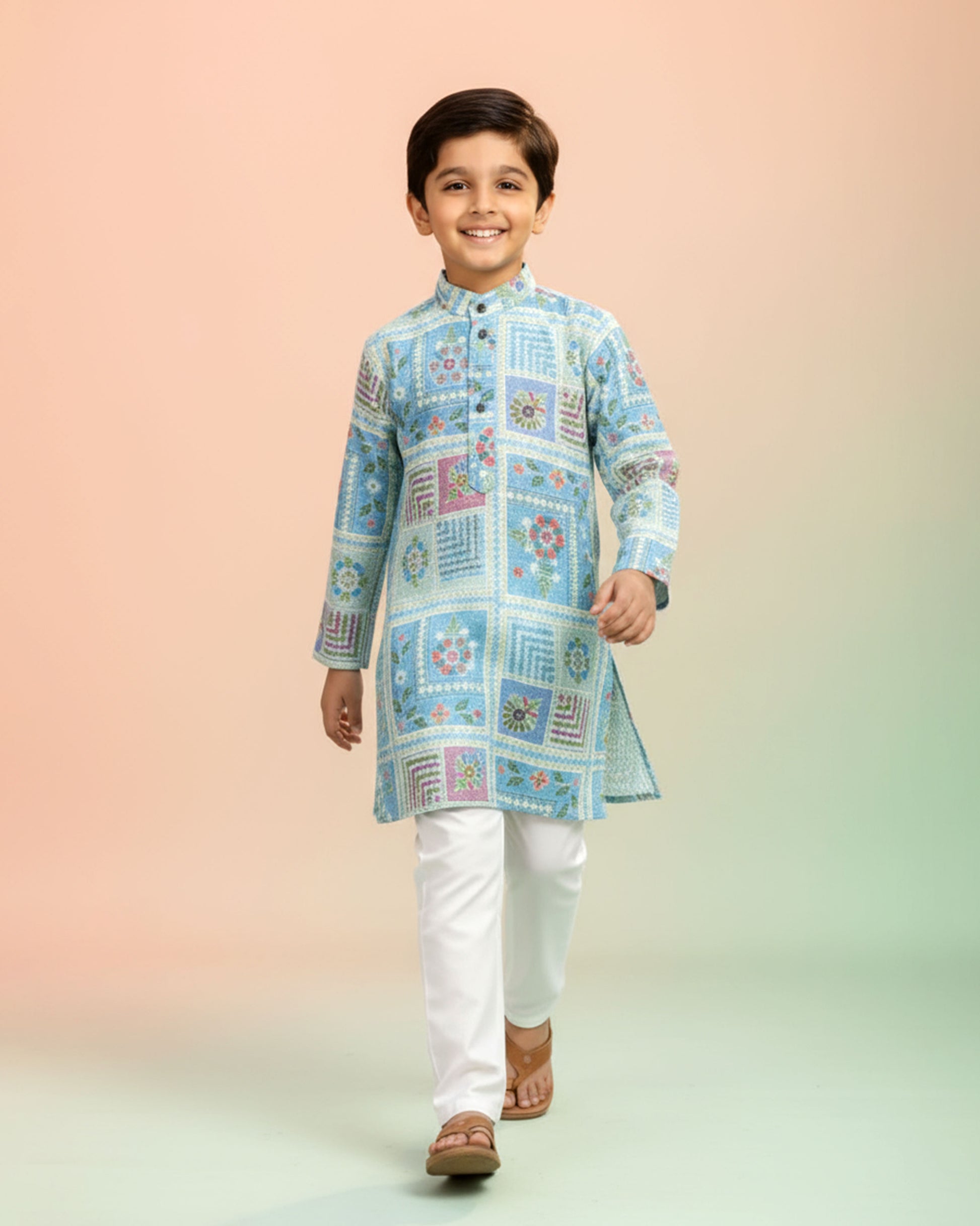 This stylish boys' cotton blend kurta set a trendy blue geometric and floral print, mandarin collar and comfortable white pyjamas, perfect for festive occasions and parties.