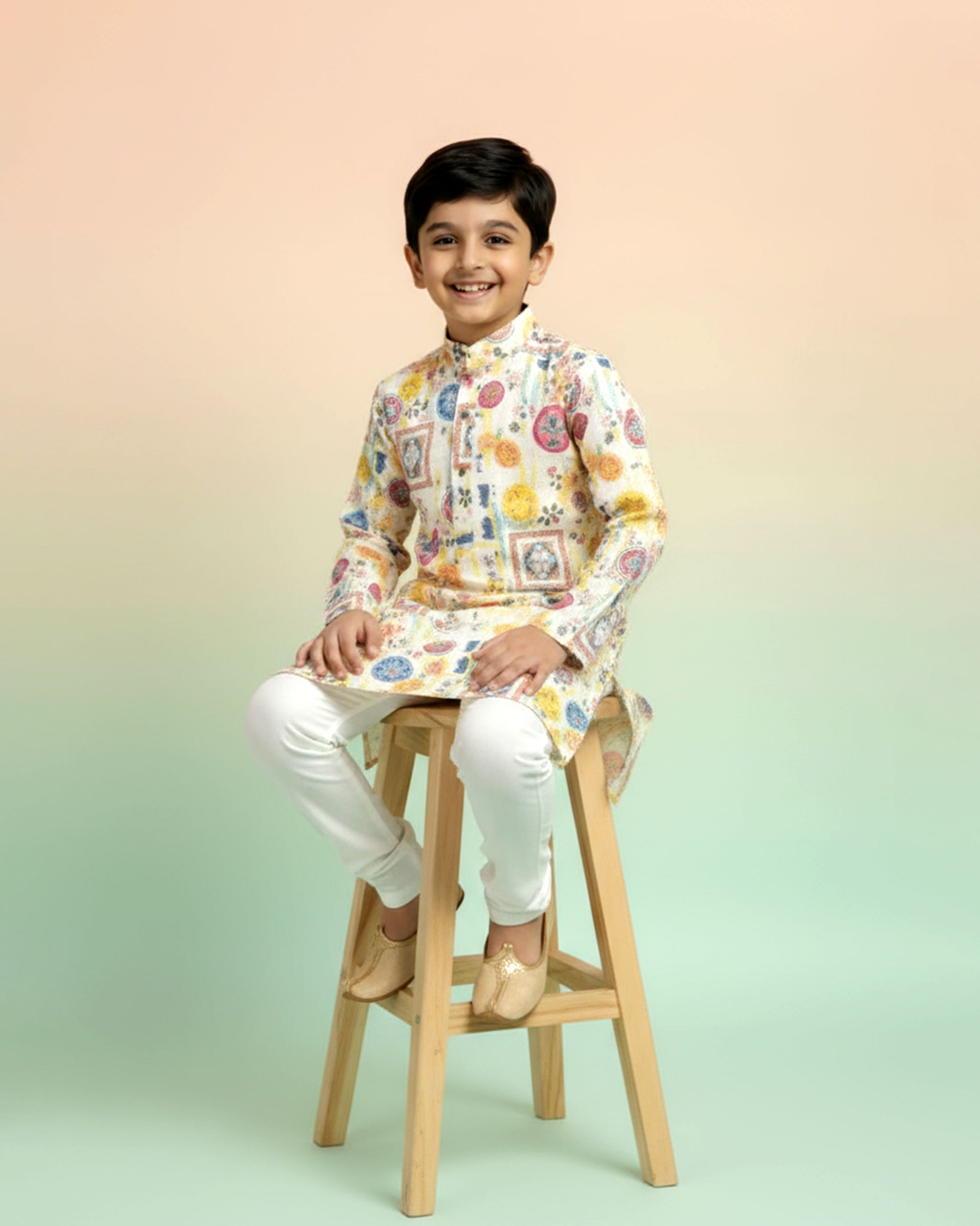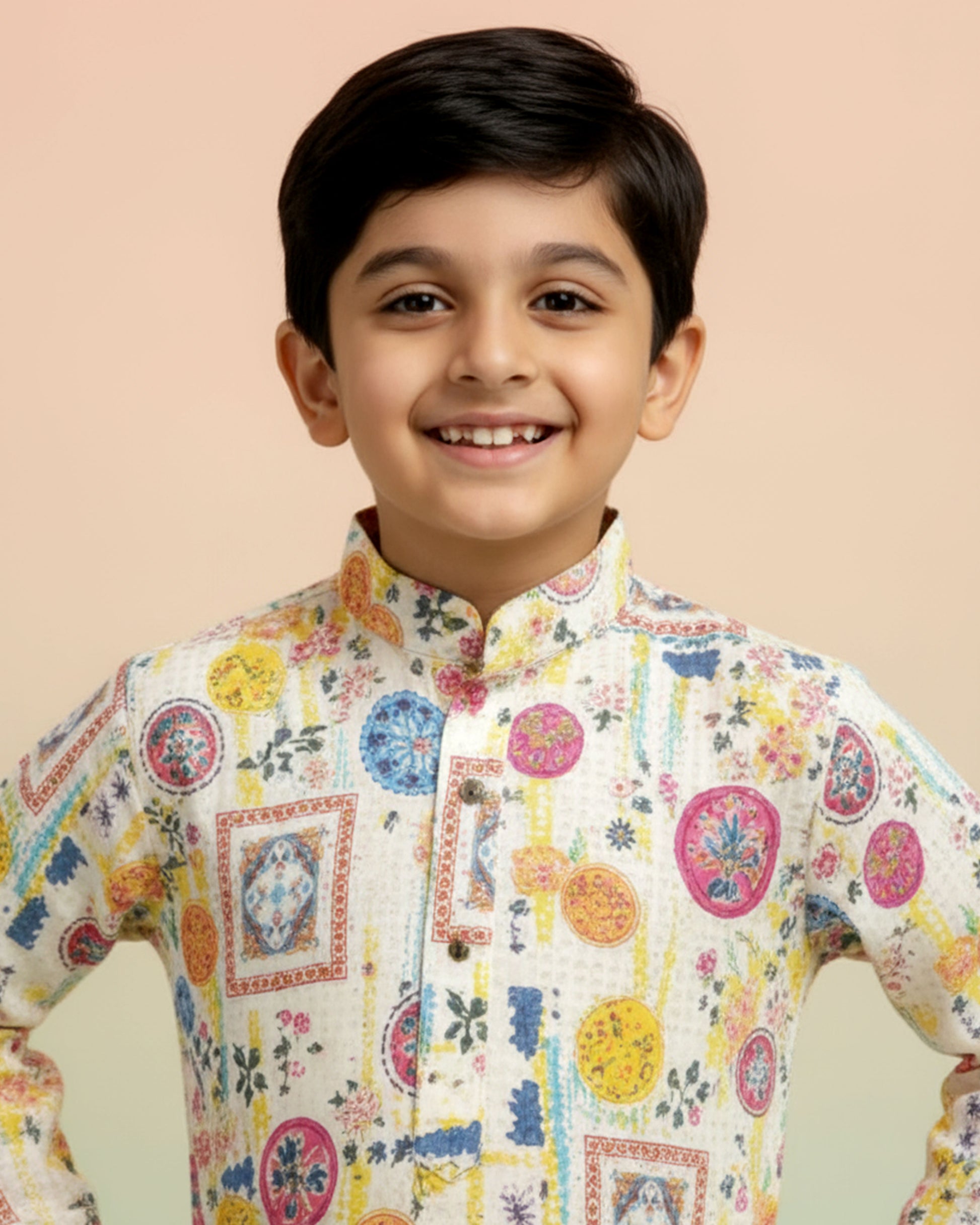 This charming boys' cotton kurta set a vibrant, multi color mandala and frame print, perfect for festive occasions and casual wear.
