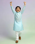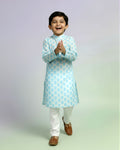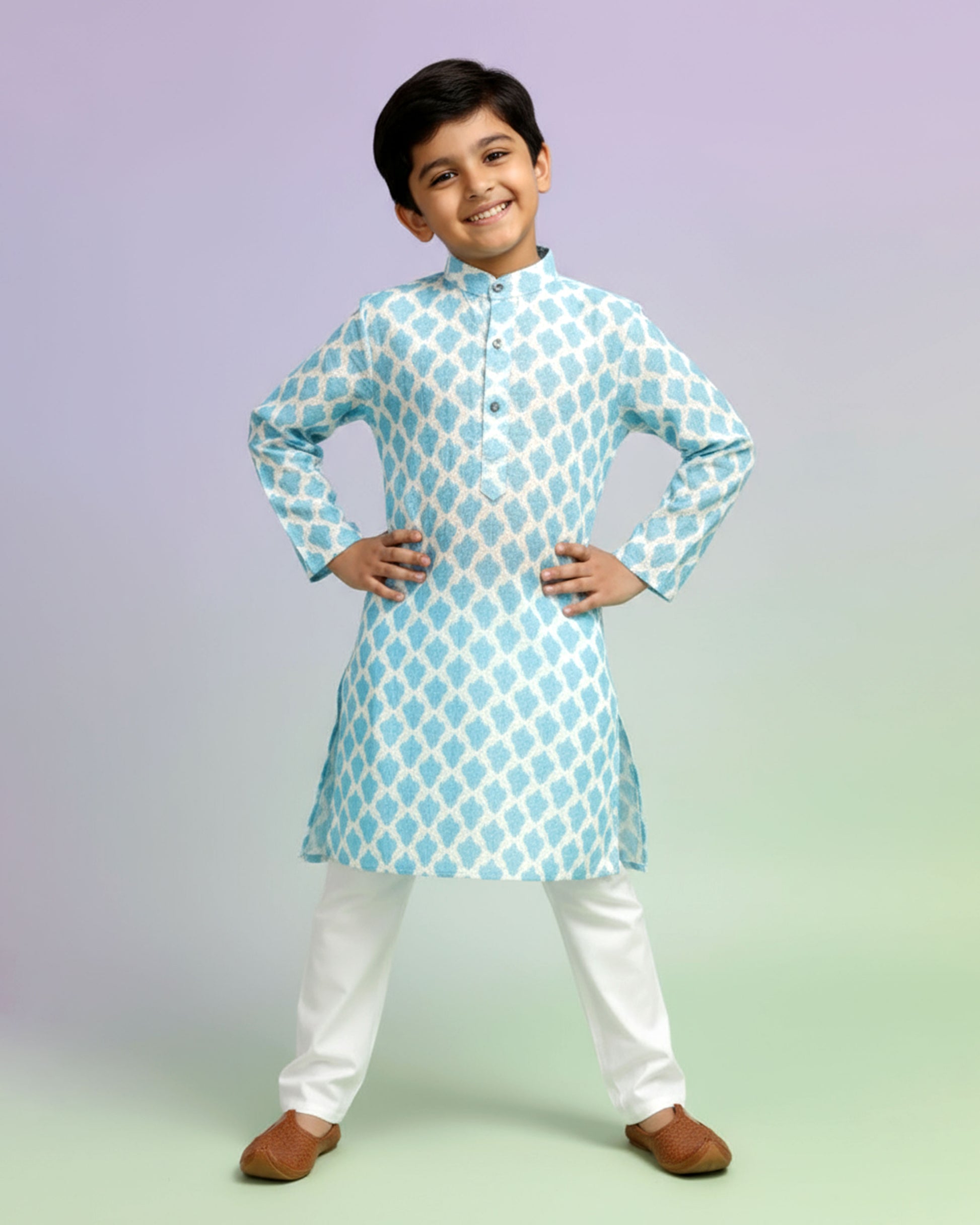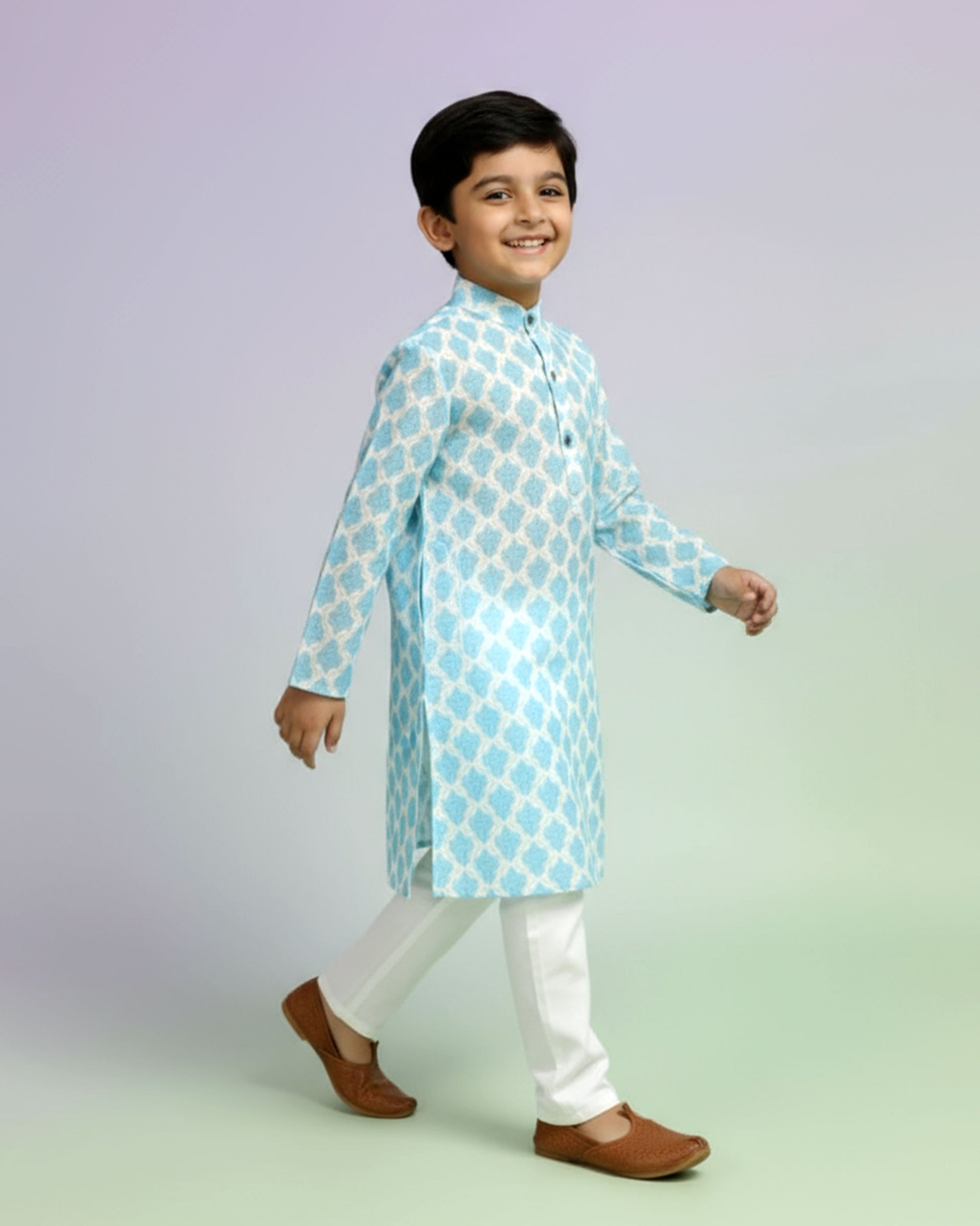 This charming boys' kurta set a light blue and white ikkat inspired print on a comfortable cotton blend fabric, offering a stylish yet traditional look perfect for festive occasions.