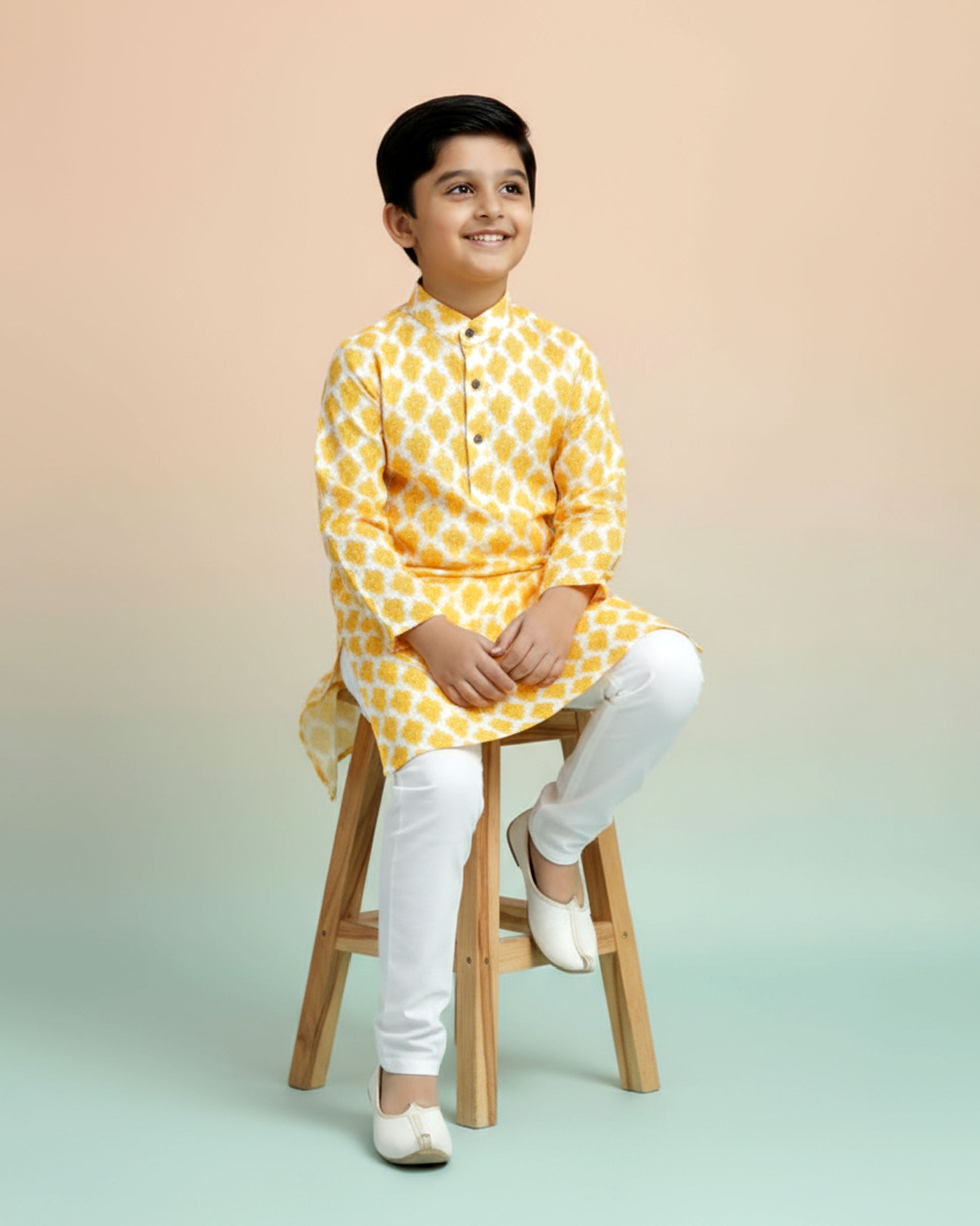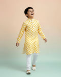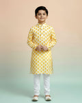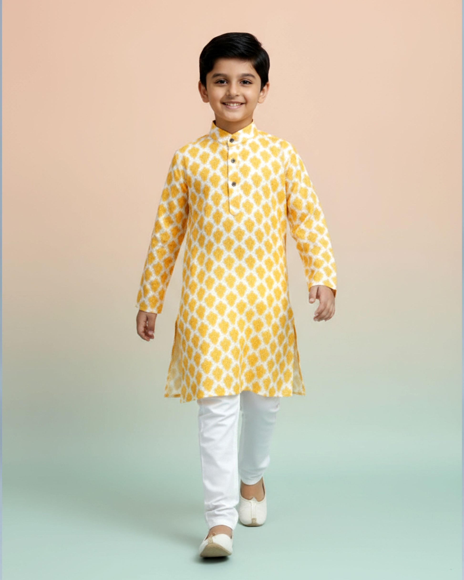 This boys' festive yellow and white kurta set a stylish ikat inspired print on comfortable cotton fabric.