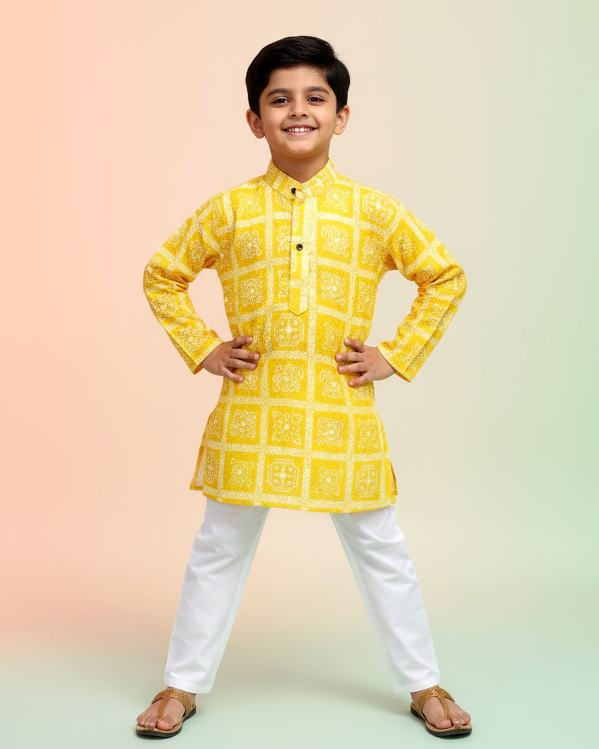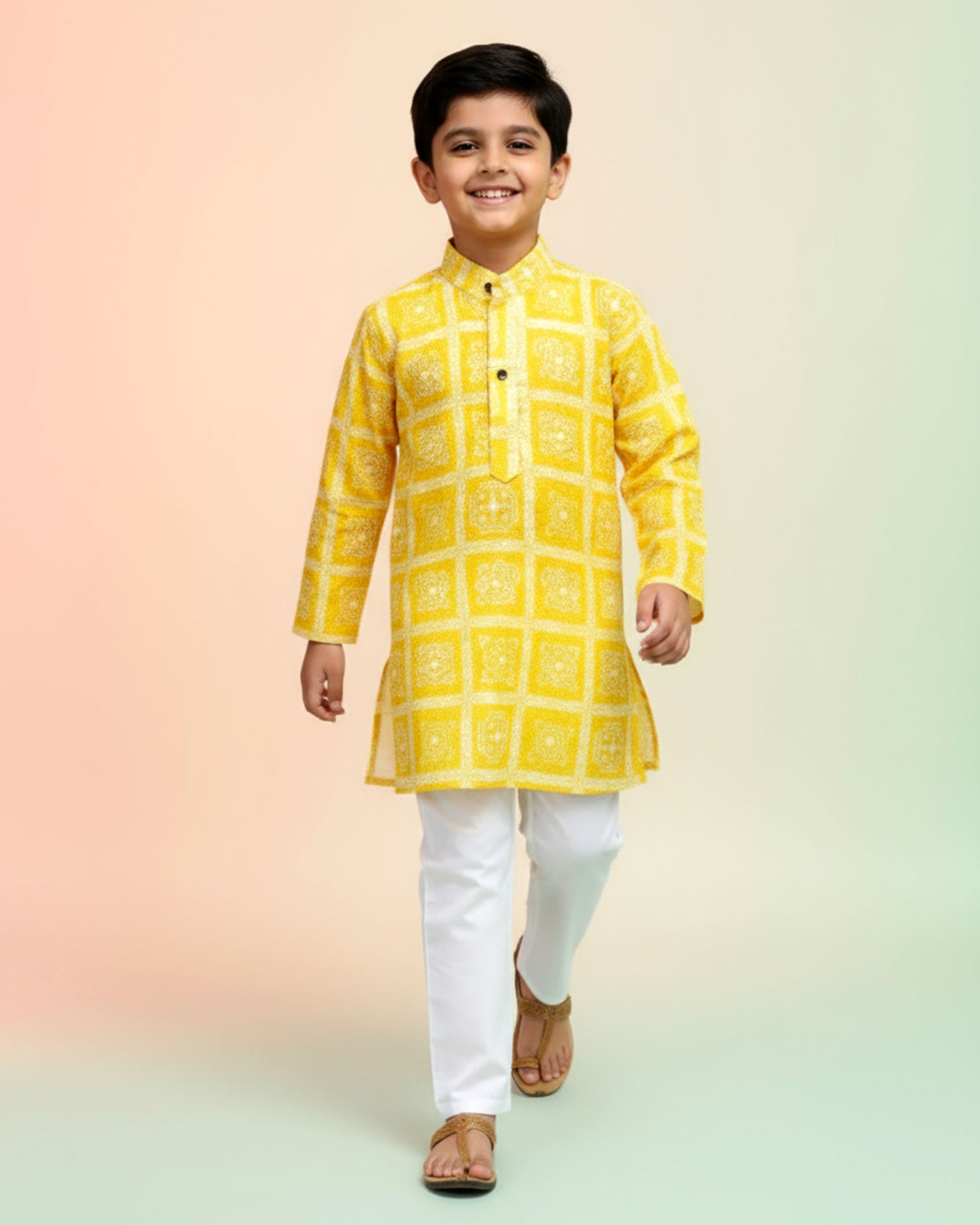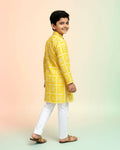 Dress your little one in this charming Boys Festive Yellow & Gold Brocade Kurta Set a traditional Mughal motif pattern