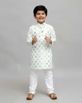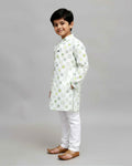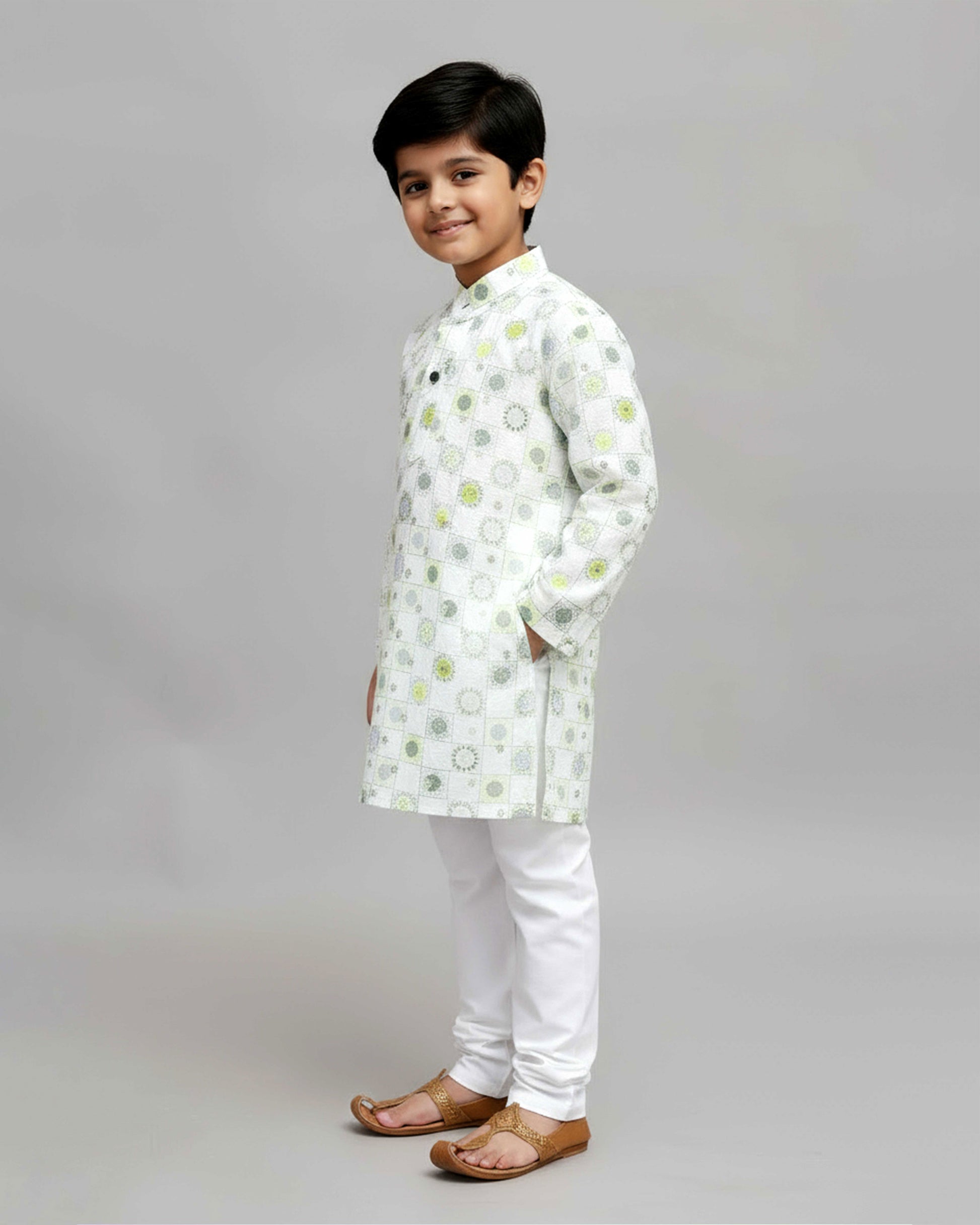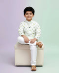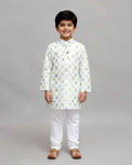 Boys White kurta with green floral and geometric prints, paired with white Pant
