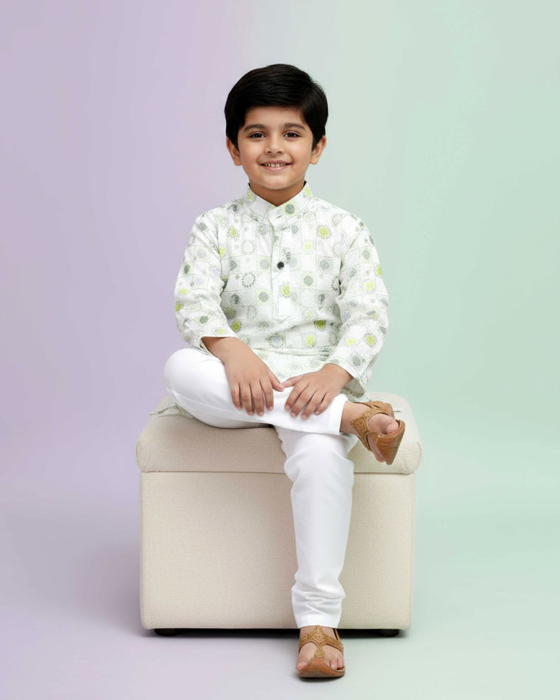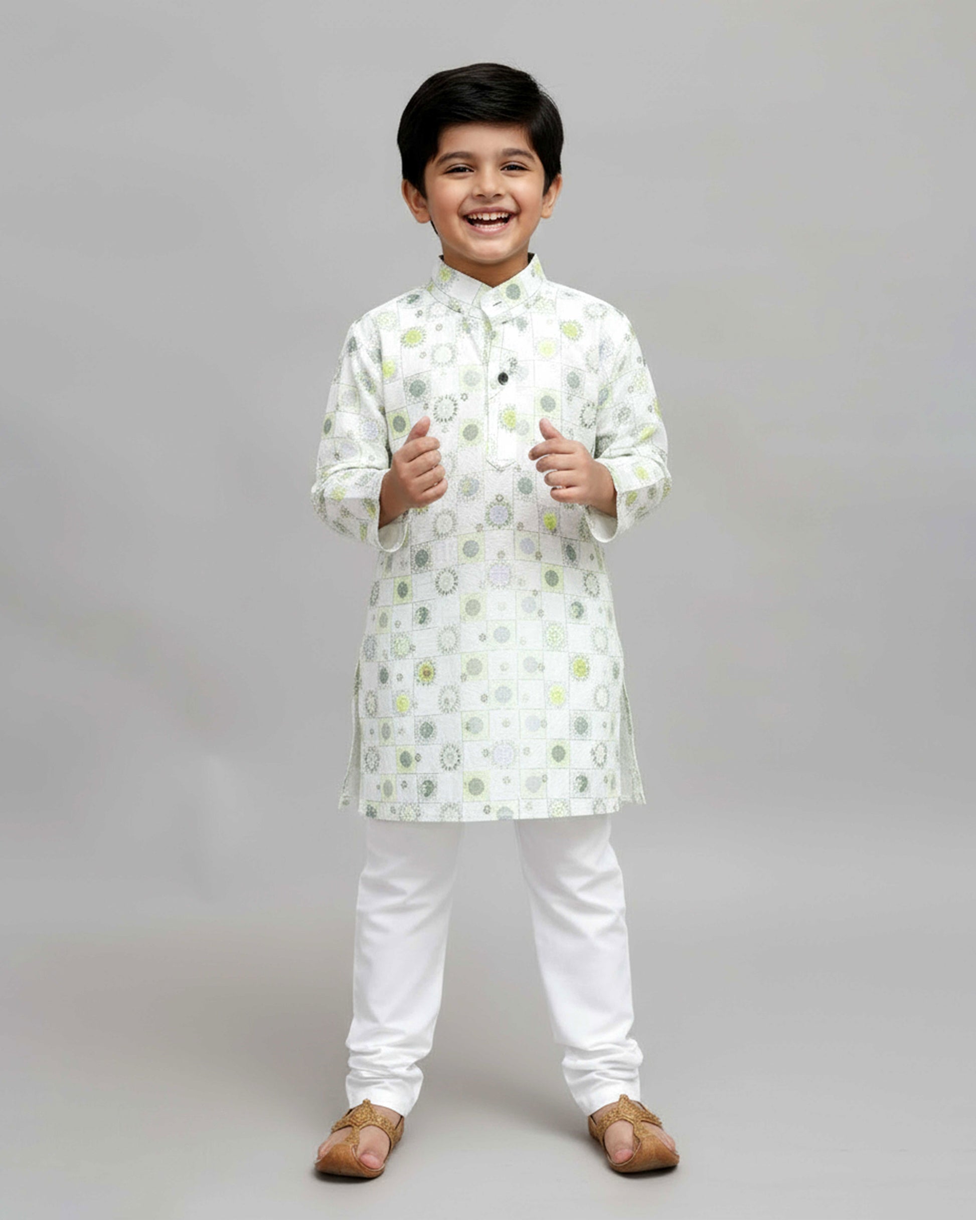 Shop this stylish boys white cotton printed kurta set a mandarin collar and full sleeves