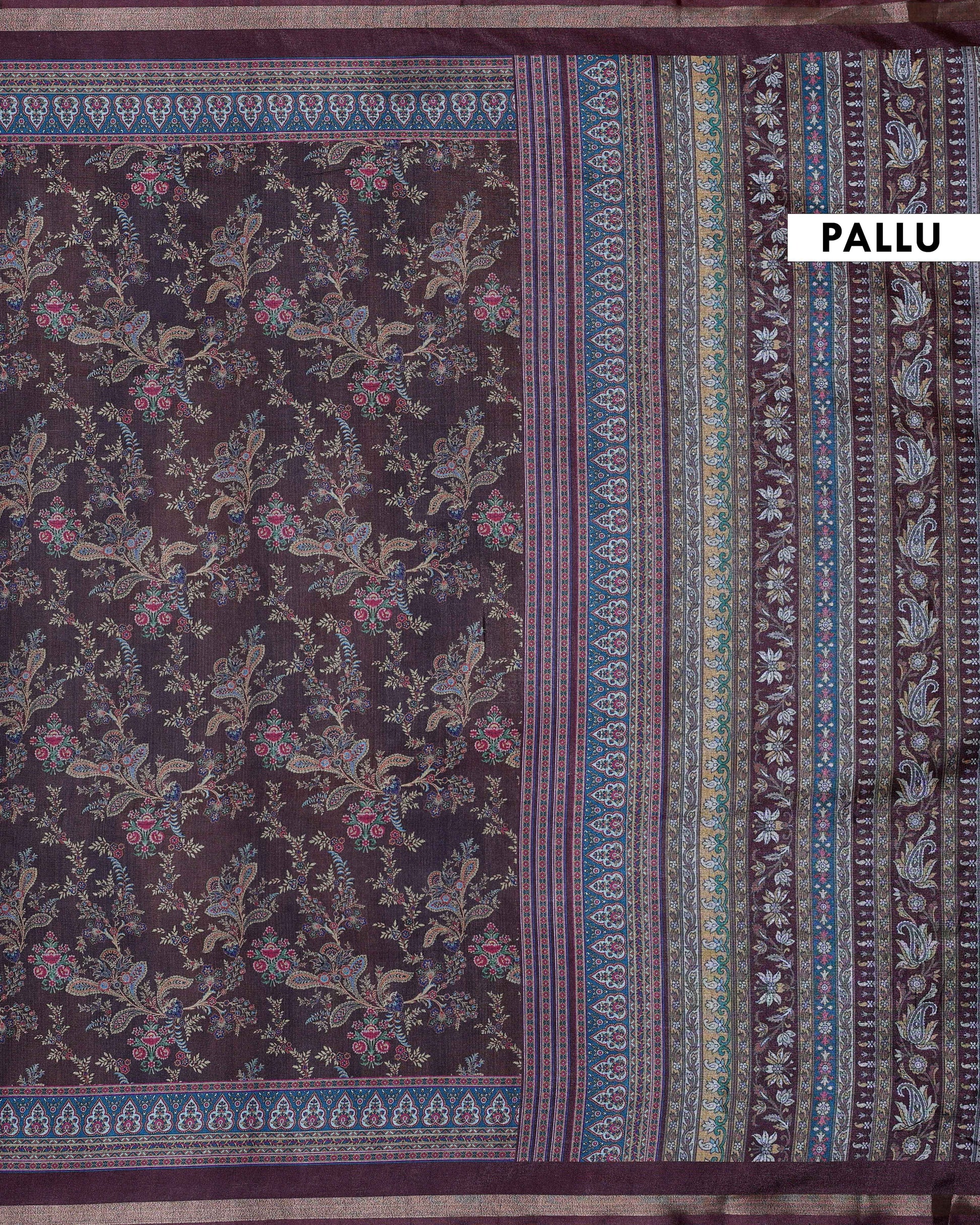 - Elevate your ethnic style with this elegant art silk saree, featuring intricate floral and paisley patterns on a rich maroon background