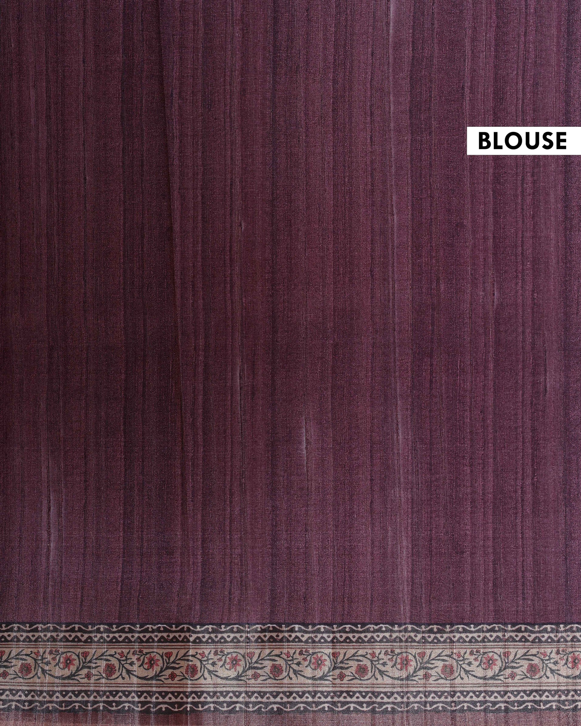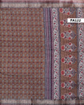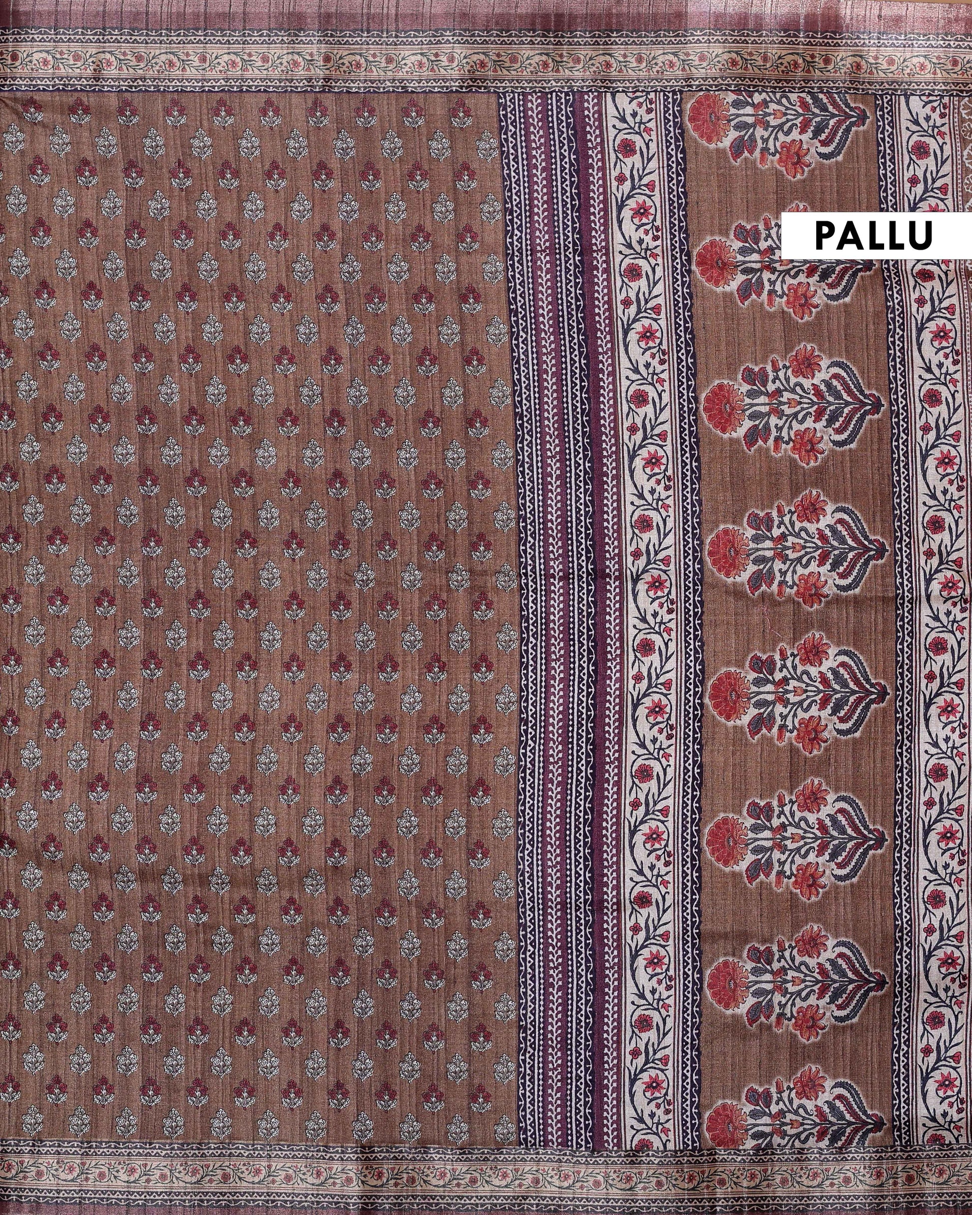 - This brown art silk saree features a delicate floral buti weave throughout the body