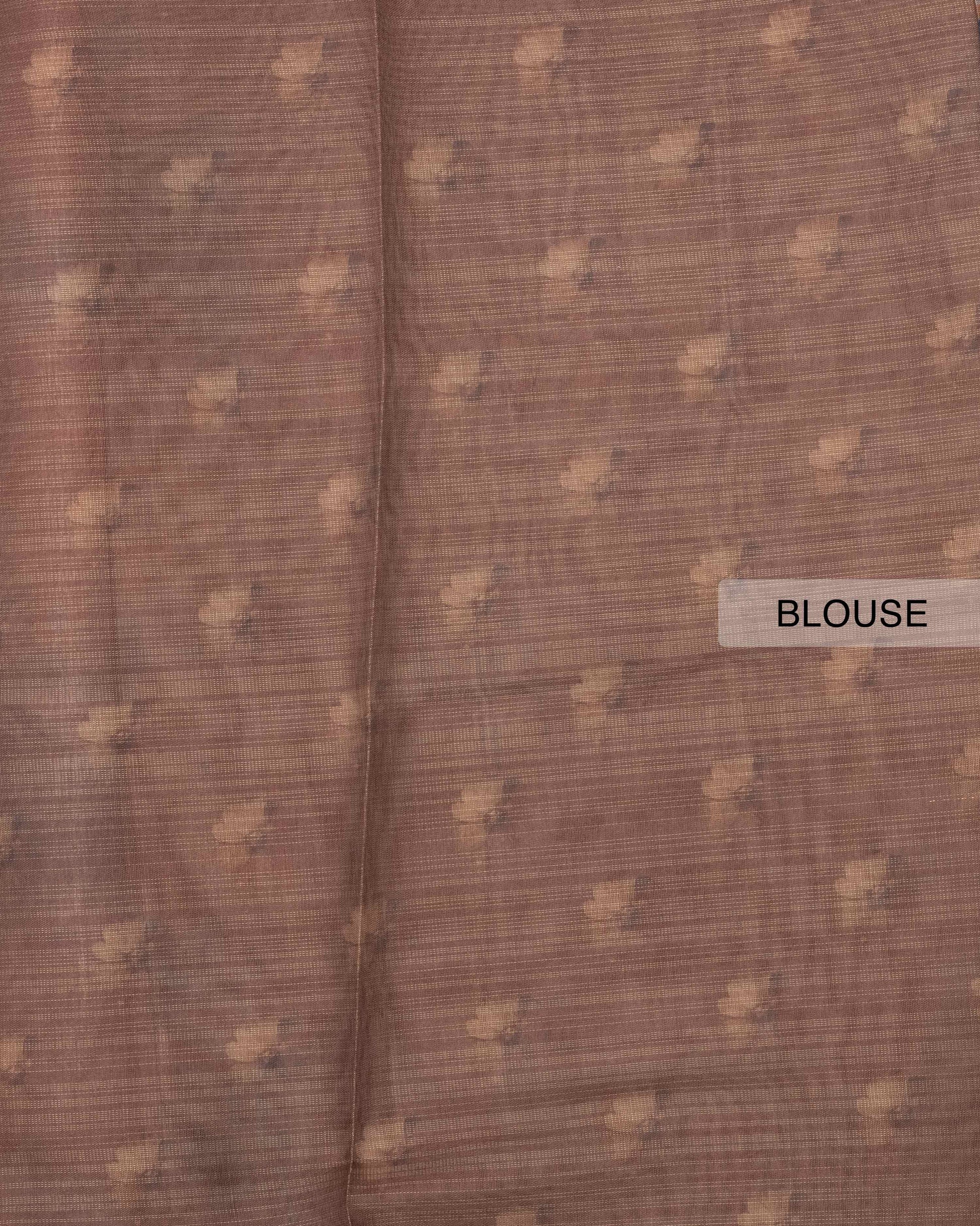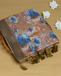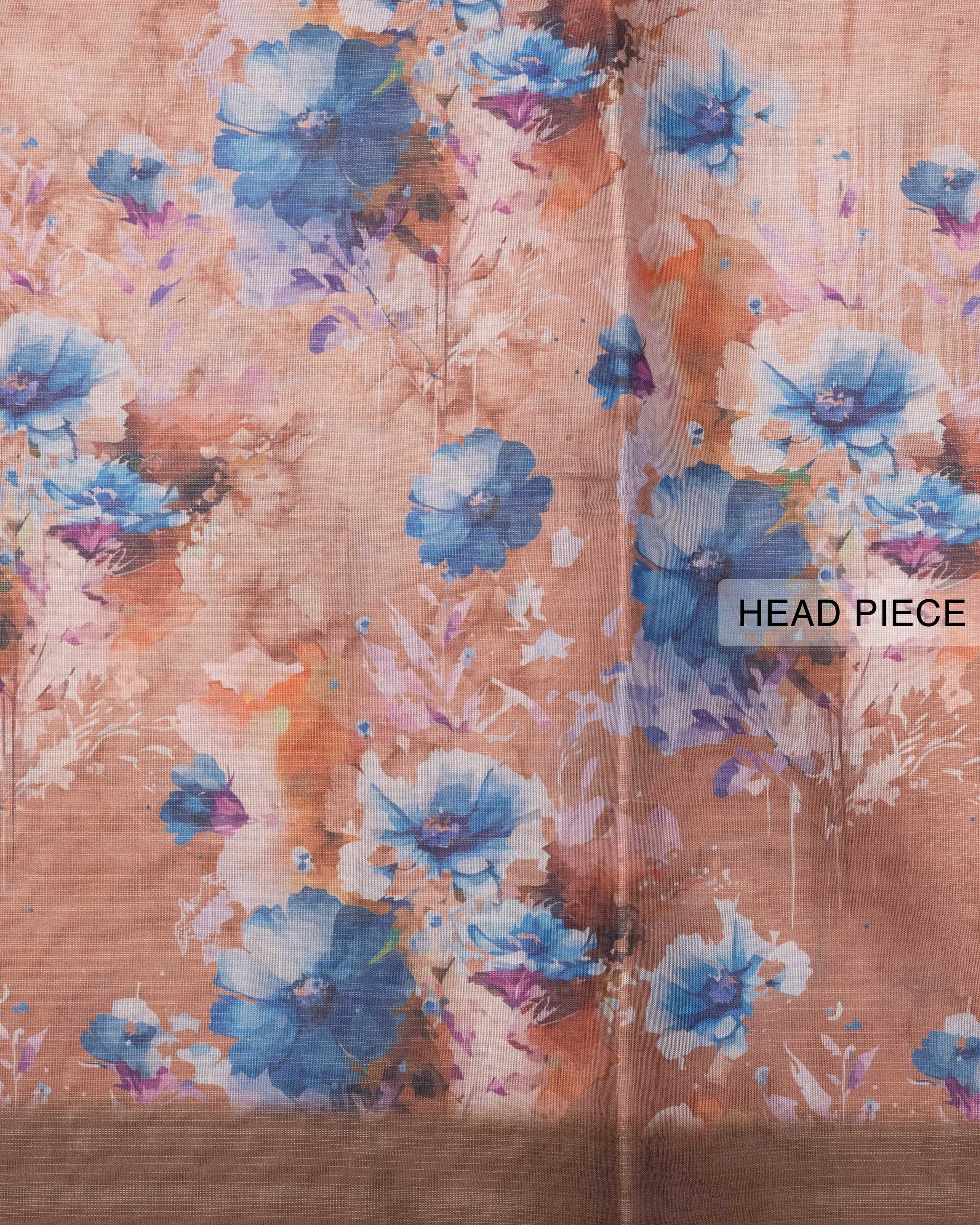 - This ethnic floral printed tissue saree a beautiful blend of brown and blue , adorned with intricate floral patterns.