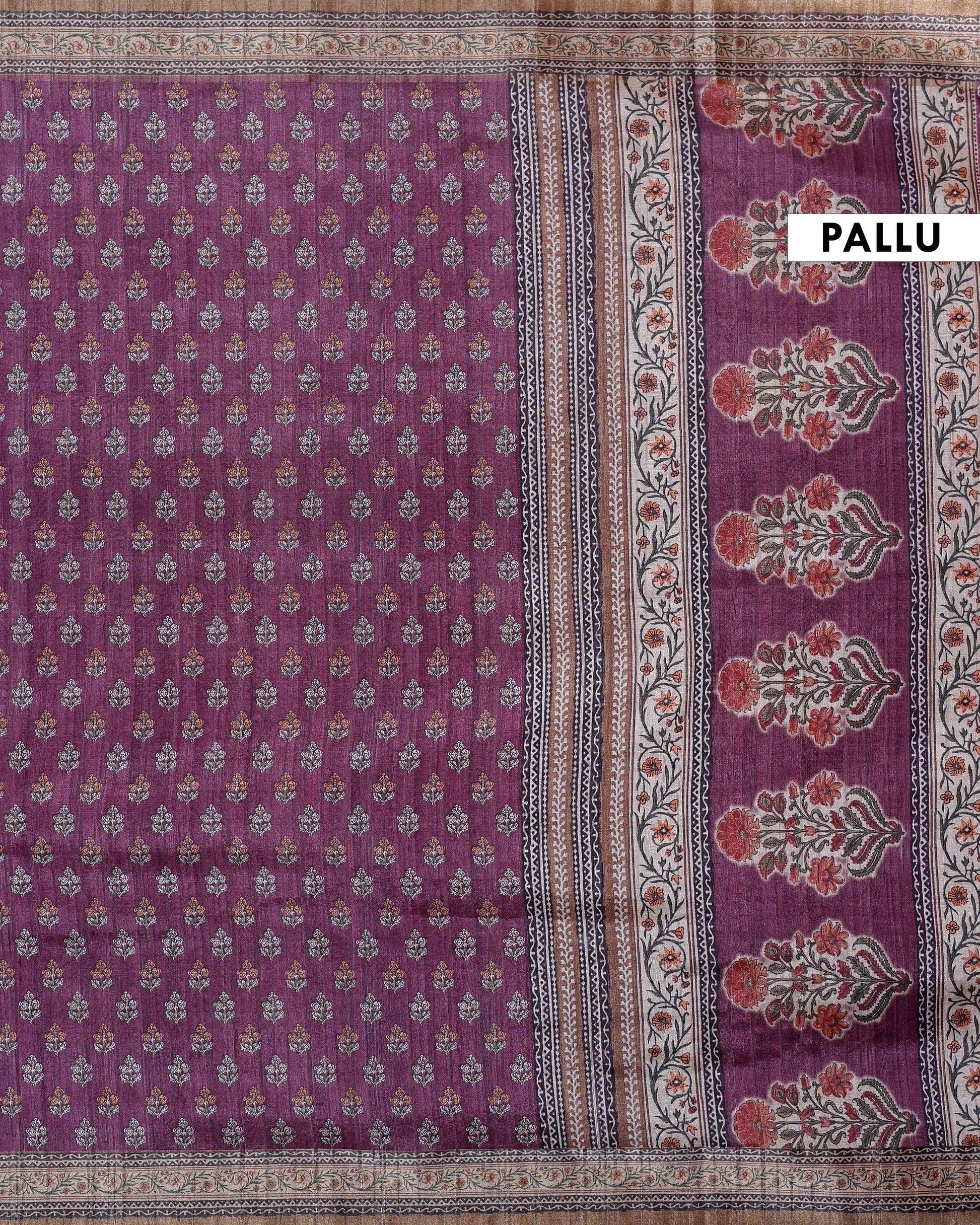 The body of the saree features a repeating floral pattern, while the border and pallu are decorated with a more intricate floral and leaf motif.