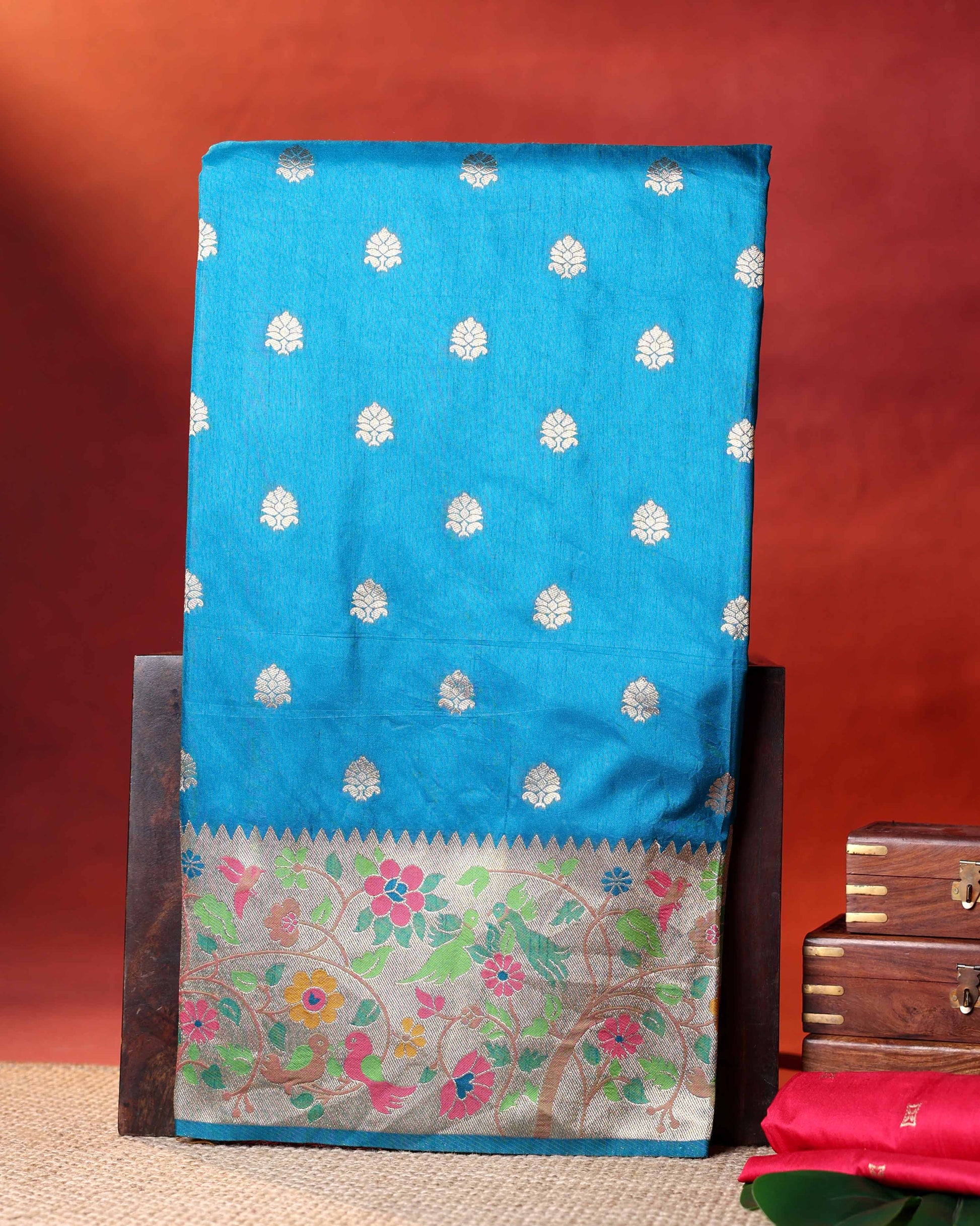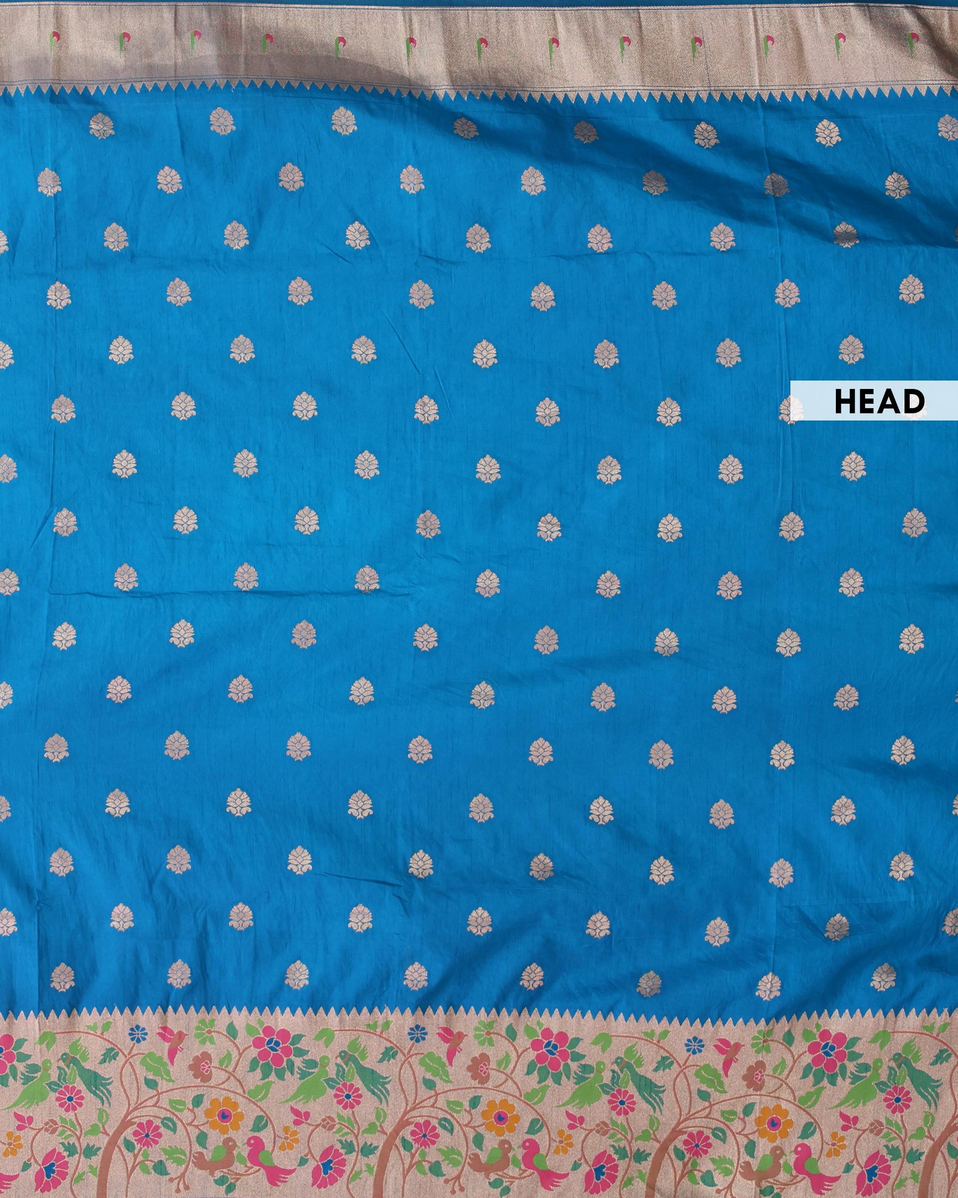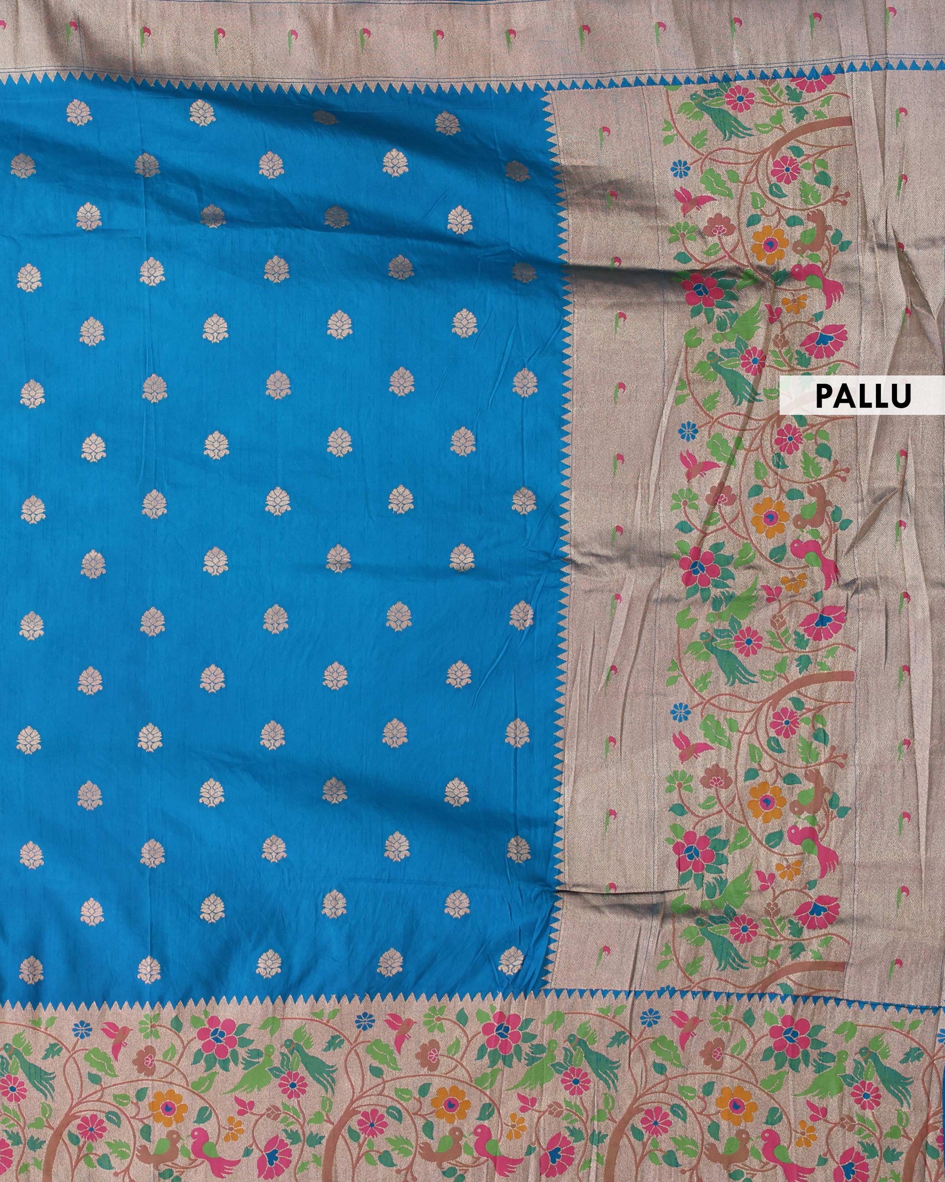 - This stunning Blue Banarasi silk saree intricate gold zari motifs and a vibrant, multi colored floral border, perfect for festive occasions or weddings