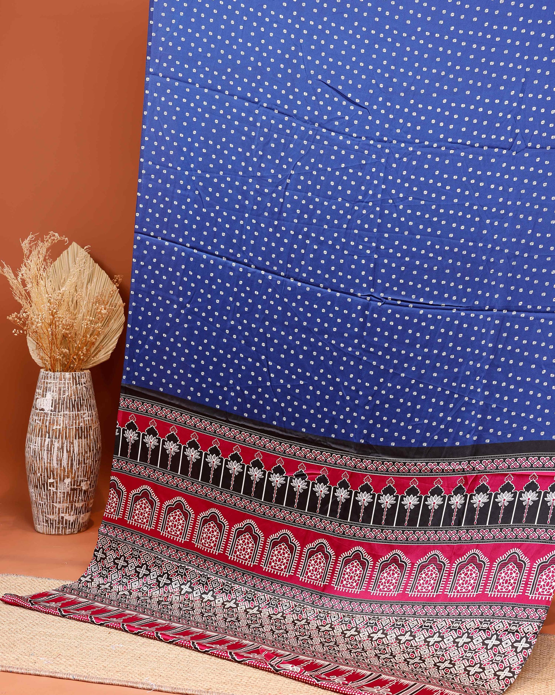 Elegant Bandhani-Inspired Modal Satin Saree with Intricate Temple Border Design - Blue